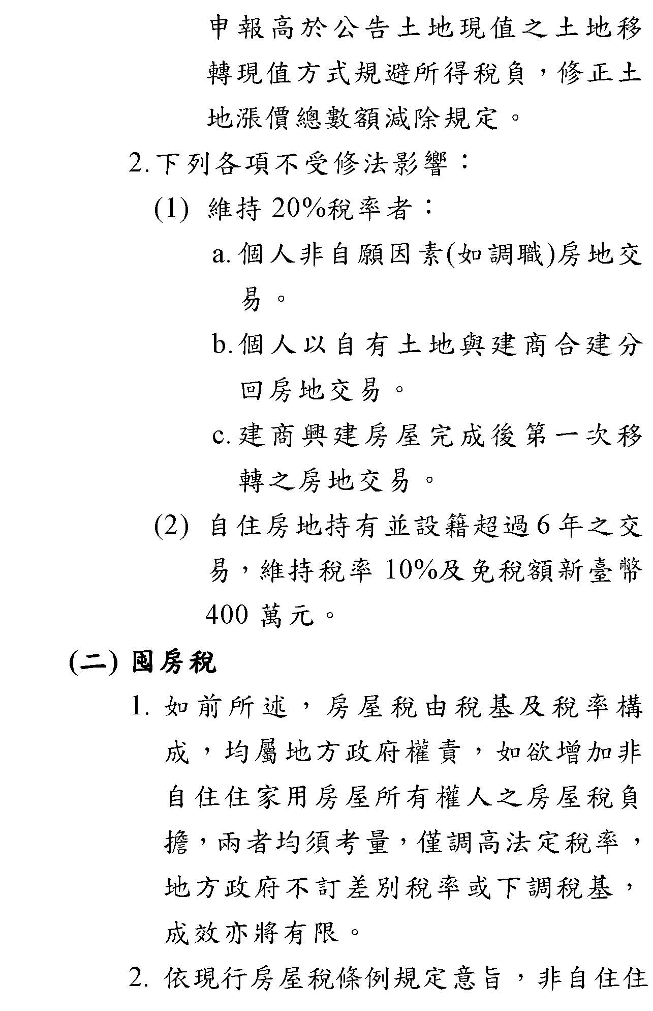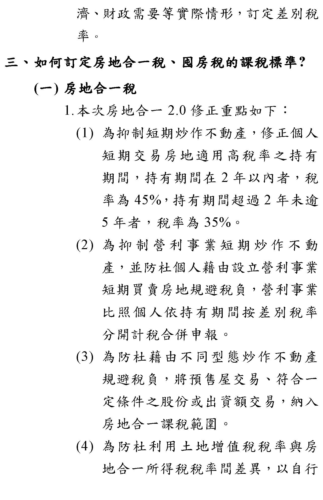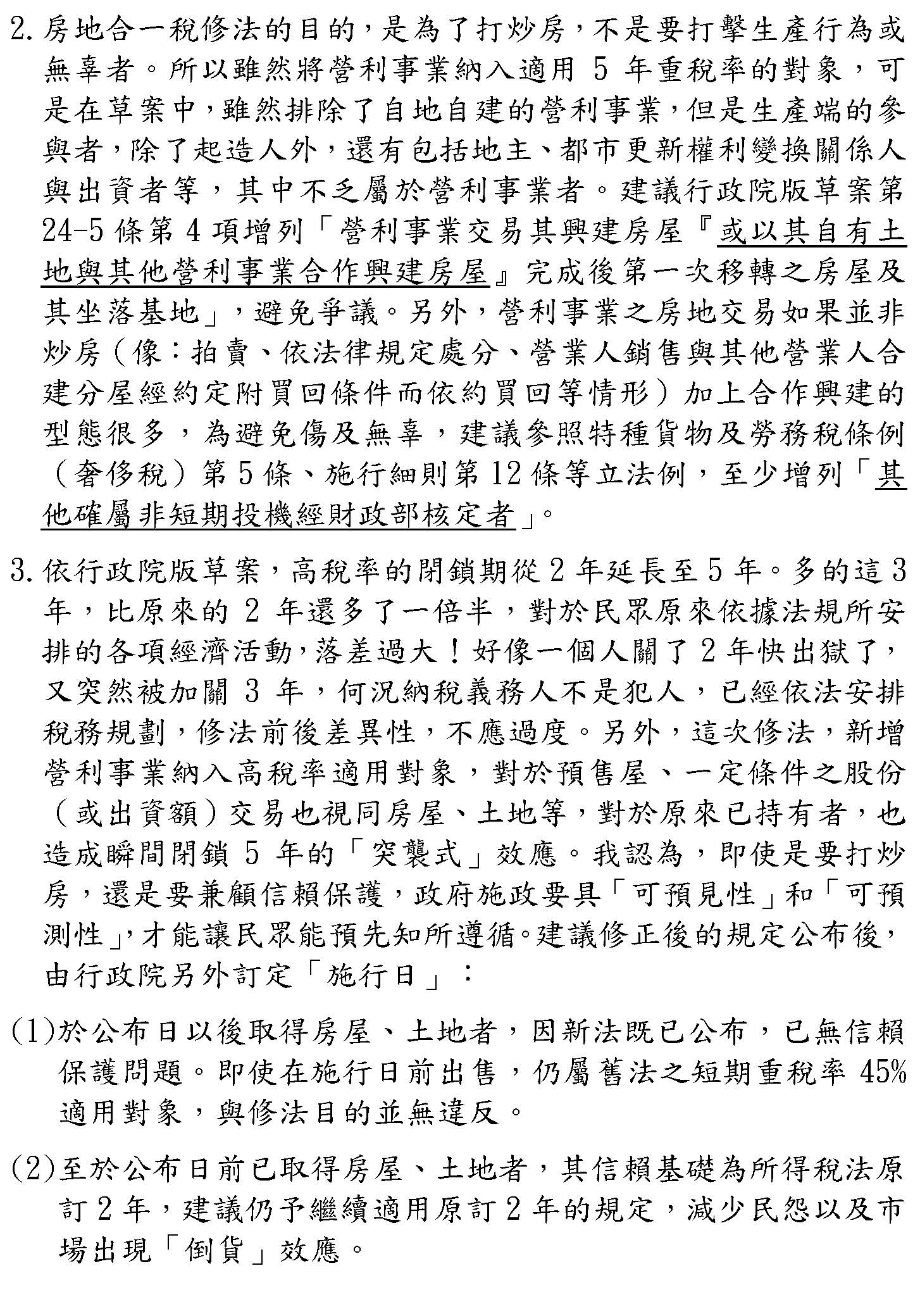 目前還看到一個疑慮,如果營利事業把自己的土地拿出來合建分屋,這是目前沒有被排除的,這點財政部可能還要考慮,因為如果真的是合建分屋,增加了房屋的供給量,也許就可以考慮給予20%的稅率。我贊成目前行政院版本中,對於出售持有房屋的期間在二年以內的是45%,二年到五年的是35%這樣的稅率,而且把營利事業拉進來、把股權交易拉進來、把預售屋拉進來。當然我們的目的是只要你是長期持有,不是要短期間的炒房,你就不會受到影響,甚至自住者還有400萬元的減免,根本沒有任何影響,我如果賺400萬元以內,其實我還是免稅的。