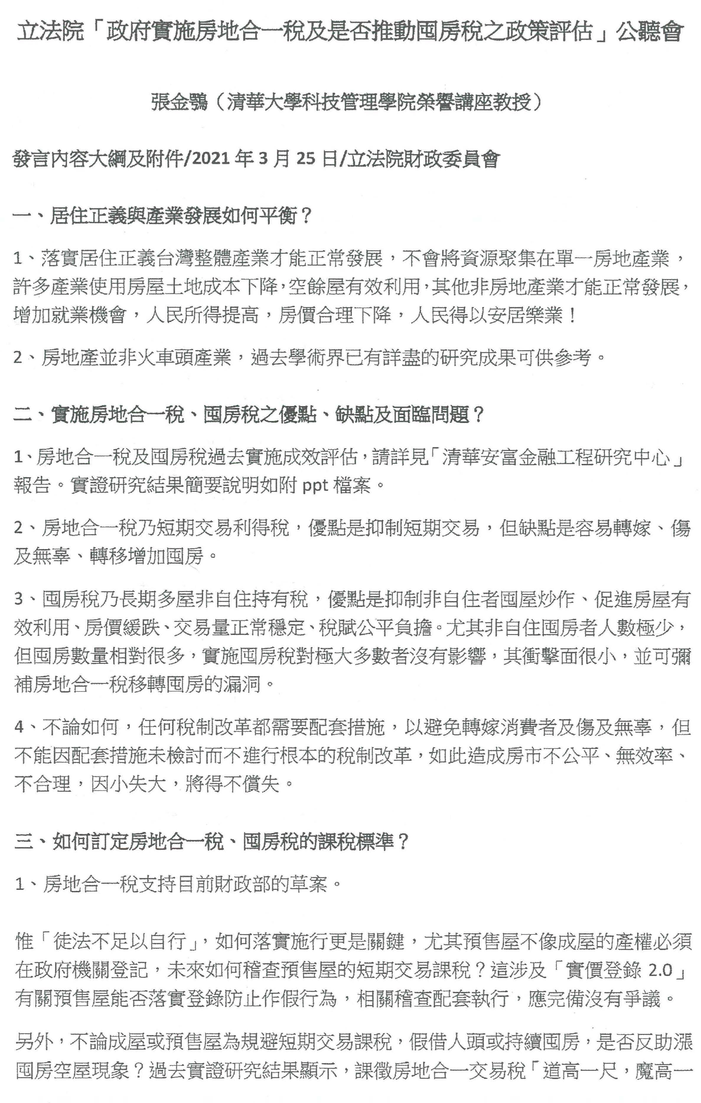 當然,今天既然召開公聽會,最後也希望各位專家學者就今天的討論題綱能夠提供你們的專業意見。討論題綱包括:第一、居住正義與產業發展如何平衡?第二、實施房地合一稅、囤房稅的優點、缺點及面臨問題。第三、如何訂定房地合一稅、囤房稅課稅標準?第四、韓國打房政策經驗分析。第五、實施房地合一稅、囤房稅是否會轉嫁給承租人?第六、日出條款的修法建議,要不要溯及既往?跟各位專家學者、各位先進報告,因為很快財委會就會排審,所以請各位能夠提出具體建議,我相信將會有助於後續立法院審議相關法案。