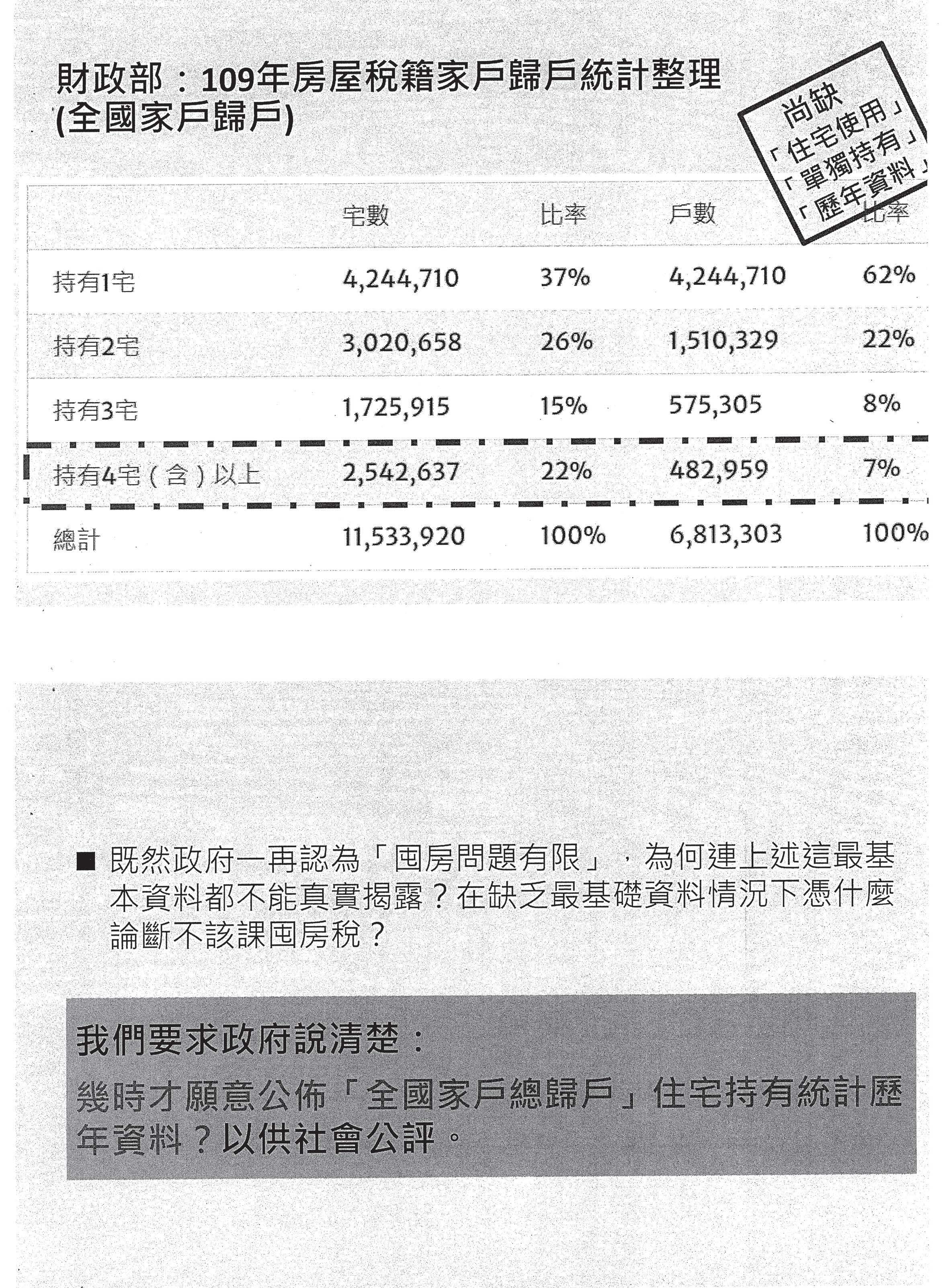 財政部給我們的回應是歷年的家戶歸戶資料全部都洗掉了,只有今年的資料。這實在有點誇張,我們歷年的資料完全沒有保存、完全沒辦法比較,在這種狀況底下,我們到底要怎麼樣去制定合理的公共政策?所以如果政府一再認為囤房問題有限,為什麼連最基本的資料都不能夠真實的揭露?在缺乏這些最基礎的資料的情況下,憑什麼去論斷不該課囤房稅?我們在此要問的是,他們什麼時候才願意公布全國家戶總歸戶的住宅持有的歷年資料,供社會公評?這是第一點。