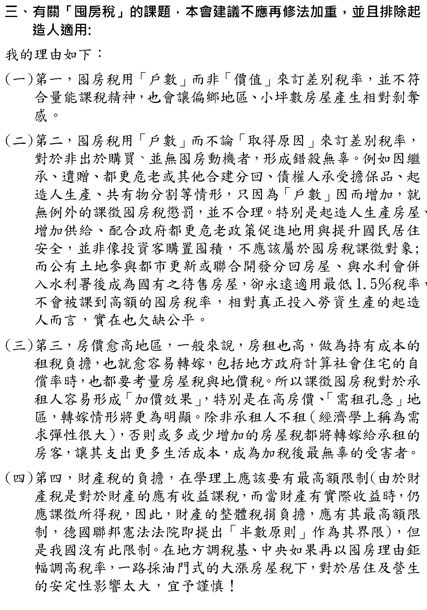 三、有關囤房稅的議題,本會建議不該再修法加重,並且排除起造人適用,我的理由如下:(一)囤房稅要用於「戶數」,而非以價值來訂定差別稅率,不然會讓偏遠地區、小坪數房屋產生相對的剝奪感。(二)囤房稅用於「戶數」而不論「取得原因」來訂定差別稅率,對非出於購置,並非囤房動機者,形成錯殺無辜,特別是起造人生產房屋、增加供給,並非像投資客購置囤積,不應該屬於囤房稅課徵的對象。(三)房價愈高的地區,一般來說房租愈高,作為持有成本的租稅負擔,也就是愈來愈可以轉嫁。所以課徵囤房稅對於承租人容易形成「加價效果」,讓承租人支出更多的生活成本,成為加稅後最無辜的受害者。(四)地方政府可以調高稅基,中央如果再以囤房稅理由,巨幅地調高稅率,一路踩油門式的大漲房屋稅之下,對於居住及營生的安定性影響太大,必須要謹慎。謝謝!