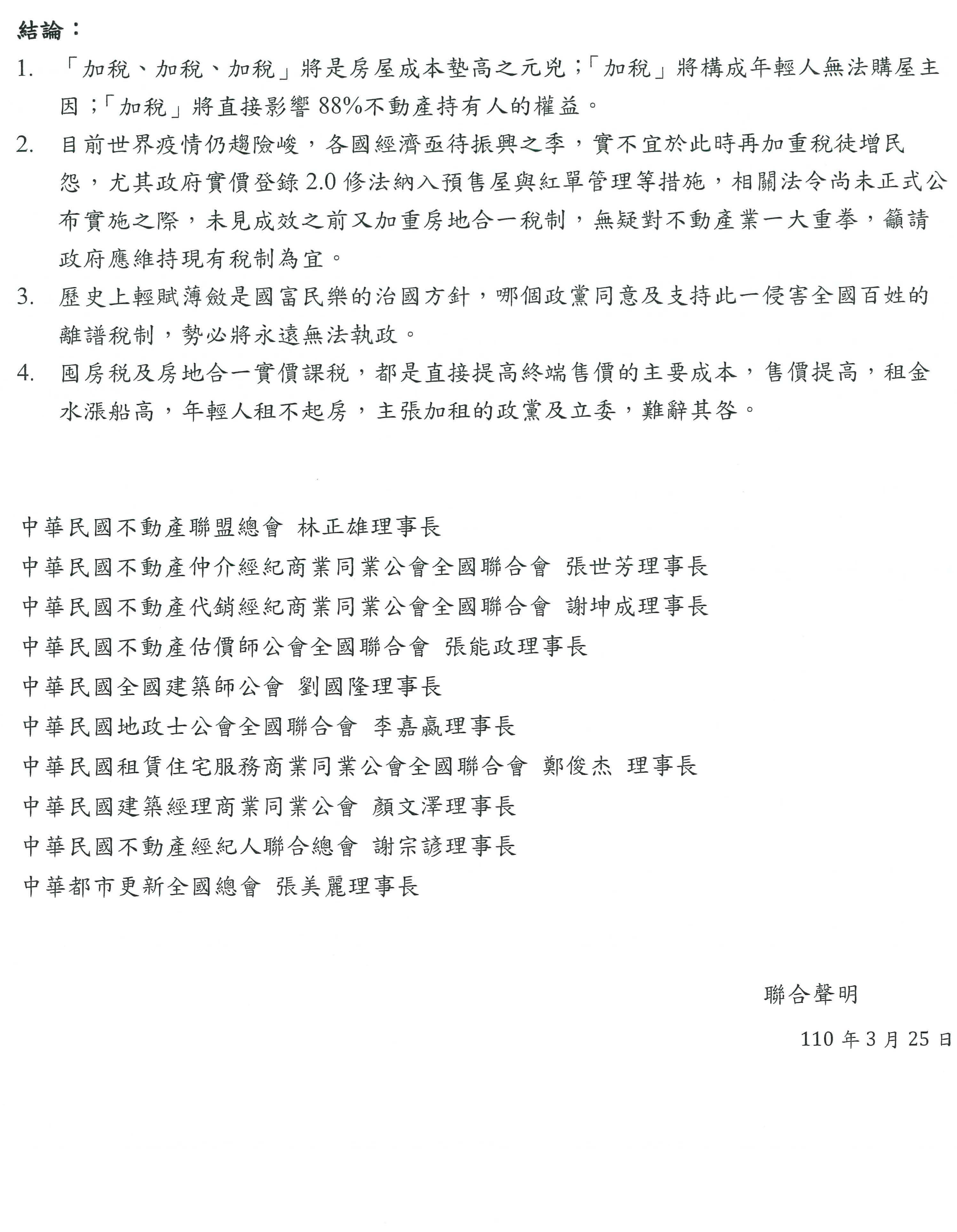 林正雄理事長:主席、部長、常務次長、各位學者專家、各位與會貴賓,大家好。我是中華民國不動產聯盟總會的理事長,中華民國不動產聯盟總會是總共8個不動產相關的全國聯合會組成的,今天與會的有地政士公會全國聯合會李嘉嬴理事長、不動產仲介經紀業全國聯合會張世芳理事長、代銷公會全國聯合會歐陽秘書長。我這一份資料是八大全國聯合會共同的聯合聲明。