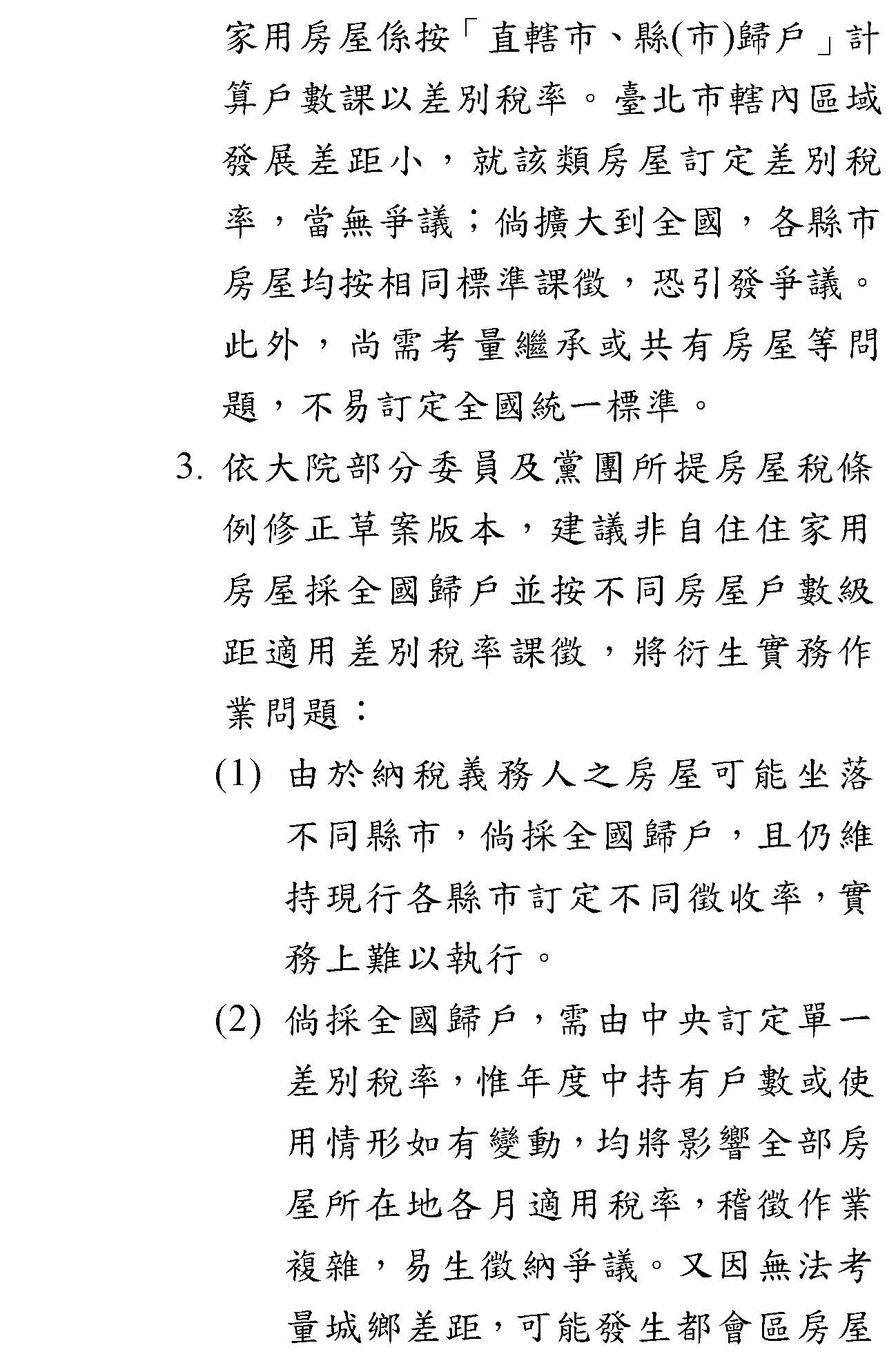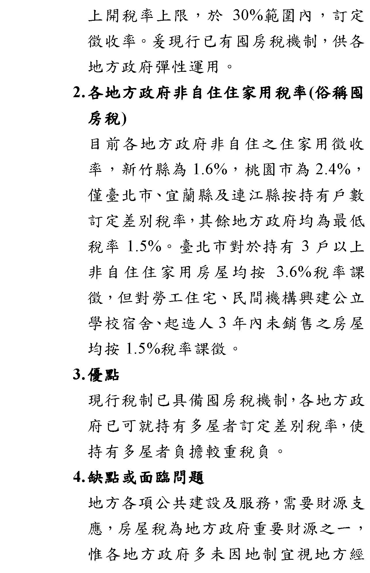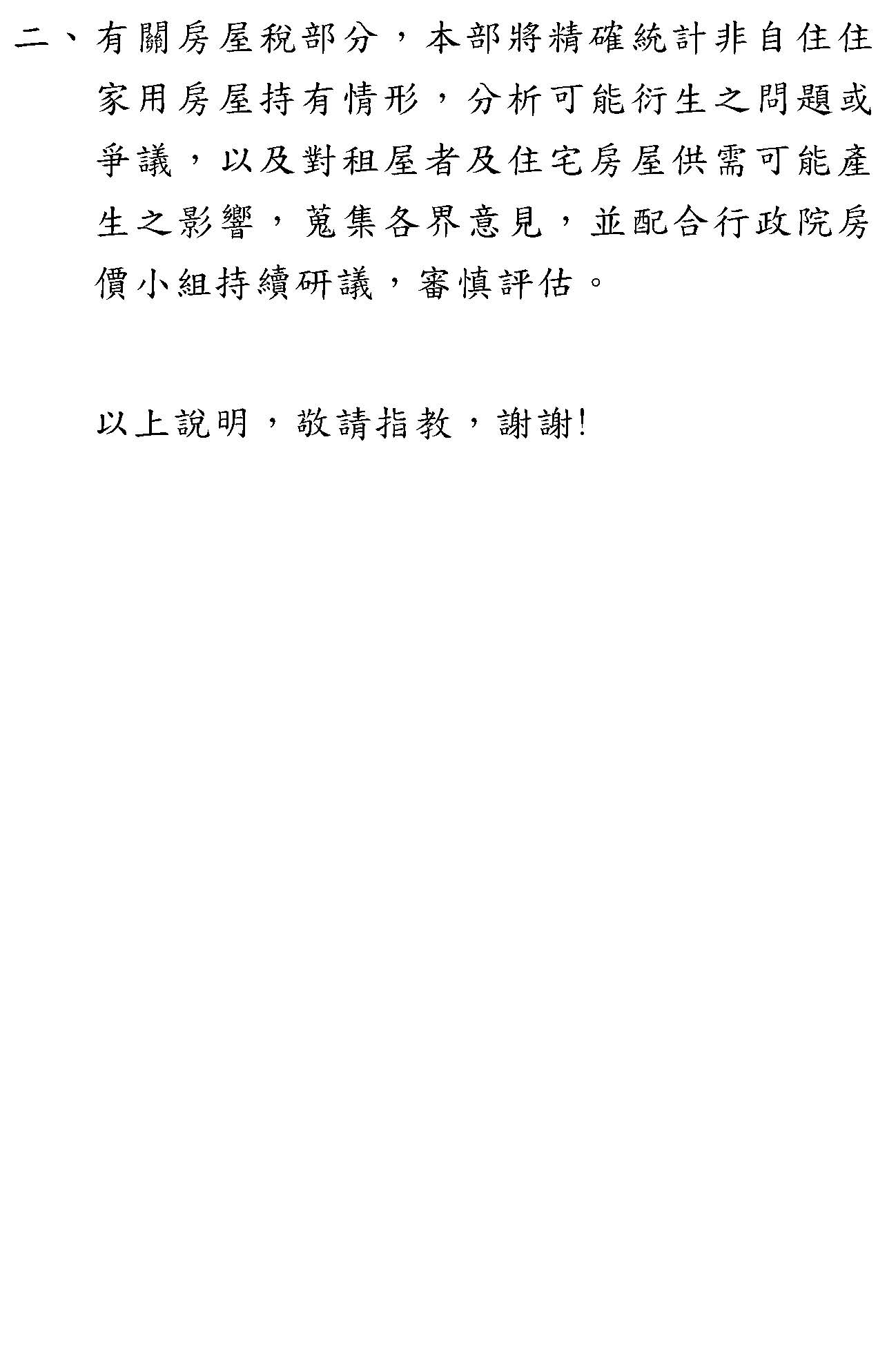 第二點,剛剛我們還是一直不斷地提到囤房稅的問題,誠如方才部長所講的,目前行政院的政策方向是希望各部會能針對短期房市炒作的作為提出一些可以調控的措施,事實上我們是非常贊成現階段先處理房地合一稅2.0版這樣的修法動作,以抑制短期炒作房市的現象。從中長期來講,假設囤房稅要推動,我們部裡面初步的分析研究是,基本上囤房稅是一種累進課稅,到底它累進的稅率要以價值、面積或是數量來累進課稅?要不要有其他相關的思考,包括共同持有者、鄉村地區或是有些已經做出租使用的等等,將這些問題做一個整體、完整的思考。所以本部花次長才會認為這件事情不是不能做,只是很多實務上的執行和配套措施一定要想清楚,這樣才是一個負責任的作法,因為這件事情茲事體大,所以我們就這部分願意和財政部做更深入的研究,看整個市場的狀況,後續穩健地來推動這些相關的事情,以上兩點簡單報告。