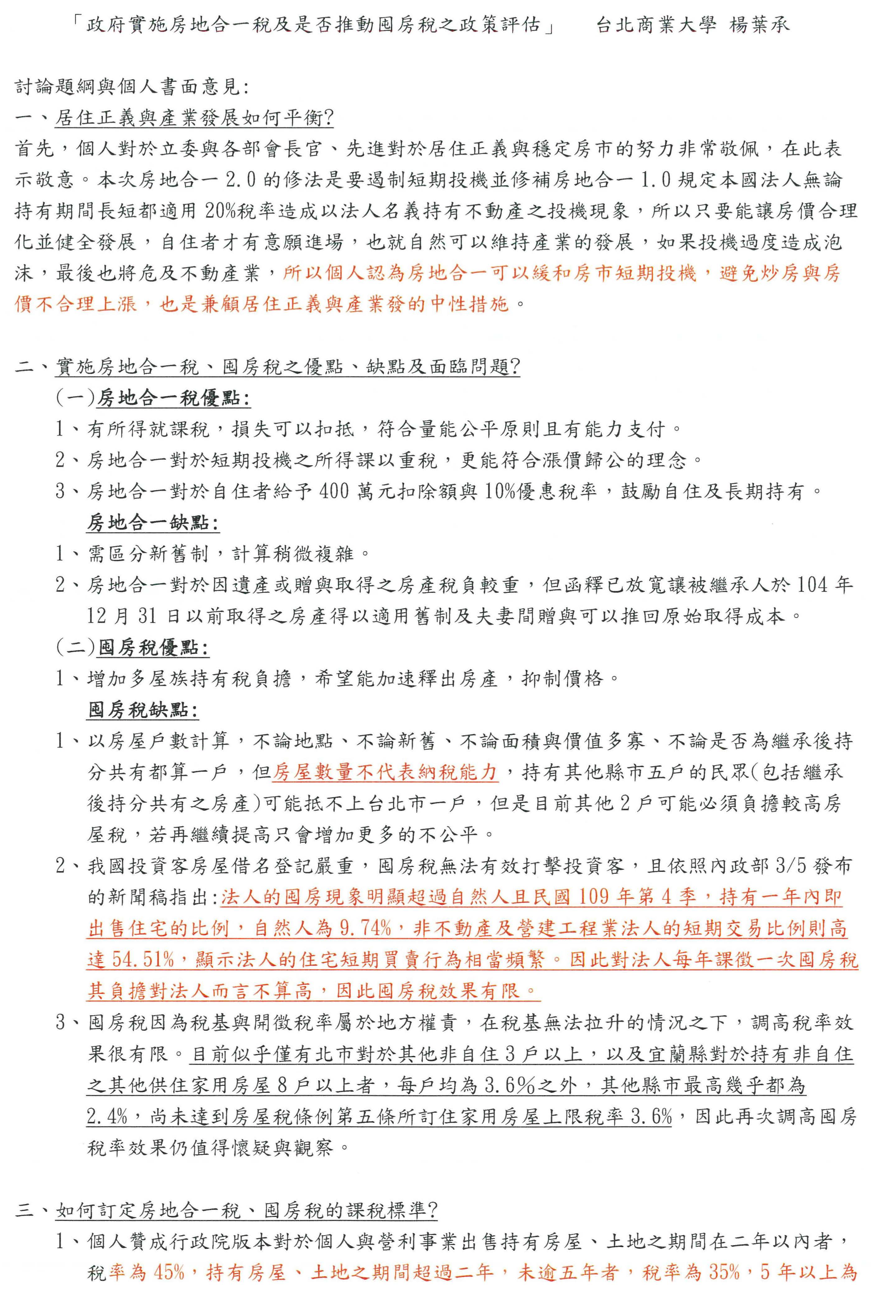 楊葉承教授:主席、各位委員、各位先進大家好。今天藉此機會感謝各位委員和各部會舉辦居住正義和產業發展的公聽會,這波房價的上漲是大環境的低利率而生的投機行情,財政部的房地合一2.0是在修正法人的投機行為,包括以公司股權短期操作享受20%的稅率,這是目前的當務之急,透過去年最低稅賦的修法,確實也把未上市(櫃)股票交易所得免稅的部分都納入最低稅負中,所以我覺得目前要做的抑制短期投機是很重要的一步。
