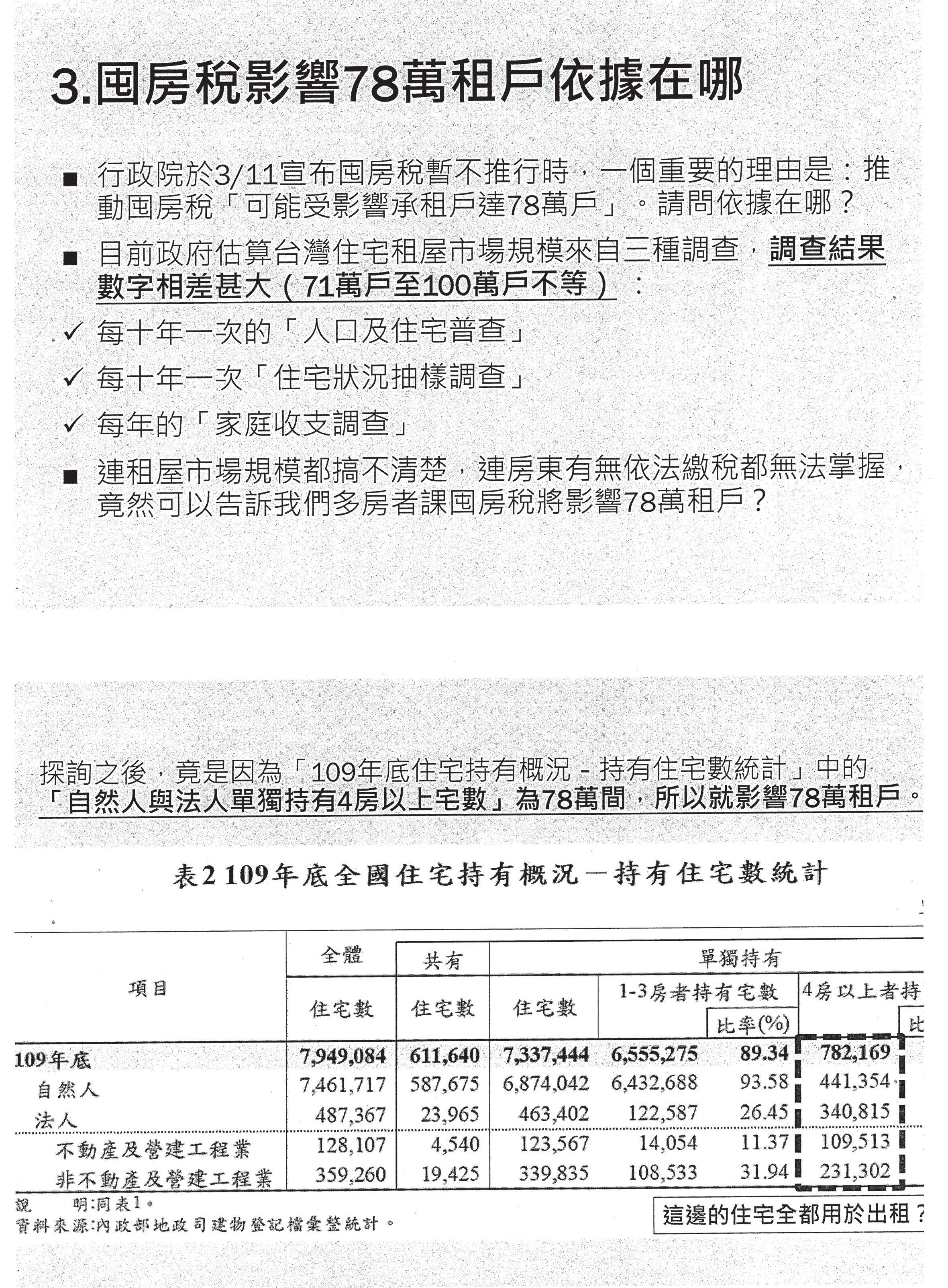 第三、囤房稅影響78萬戶租戶的依據在哪裡?行政院3月11號說,囤房稅可能影響78萬的承租戶,但是政府到現在連一個完整的租屋規模調查到底要以哪個為準都說不出來,我們有三個對於租屋市場規模的調查:10年一次的普查、10年一次的租屋狀況抽樣調查及每年的家庭收支調查,連租屋市場的規模都搞不清楚,還告訴我們說囤房稅可以影響78萬租戶,這真的是滿好笑的!我們探詢之後才發現,原來是把所有單獨持有4房以上宅數全部都算入出租數額,但真的是這個樣子嗎?4房以上多屋者的住宅全部都出租?按照邏輯來說這是不可能的事情,難道財政部有收到這些所得稅的資料,所以才這麼說嗎?難道真的有嗎?事實是財政部連有多少做為住宅出租的房東繳稅都搞不清楚嘛!連這個數據都搞不清楚了,到底有沒有辦法勾稽出這78萬戶裡面有哪些是做為出租使用,那就更不用說了。