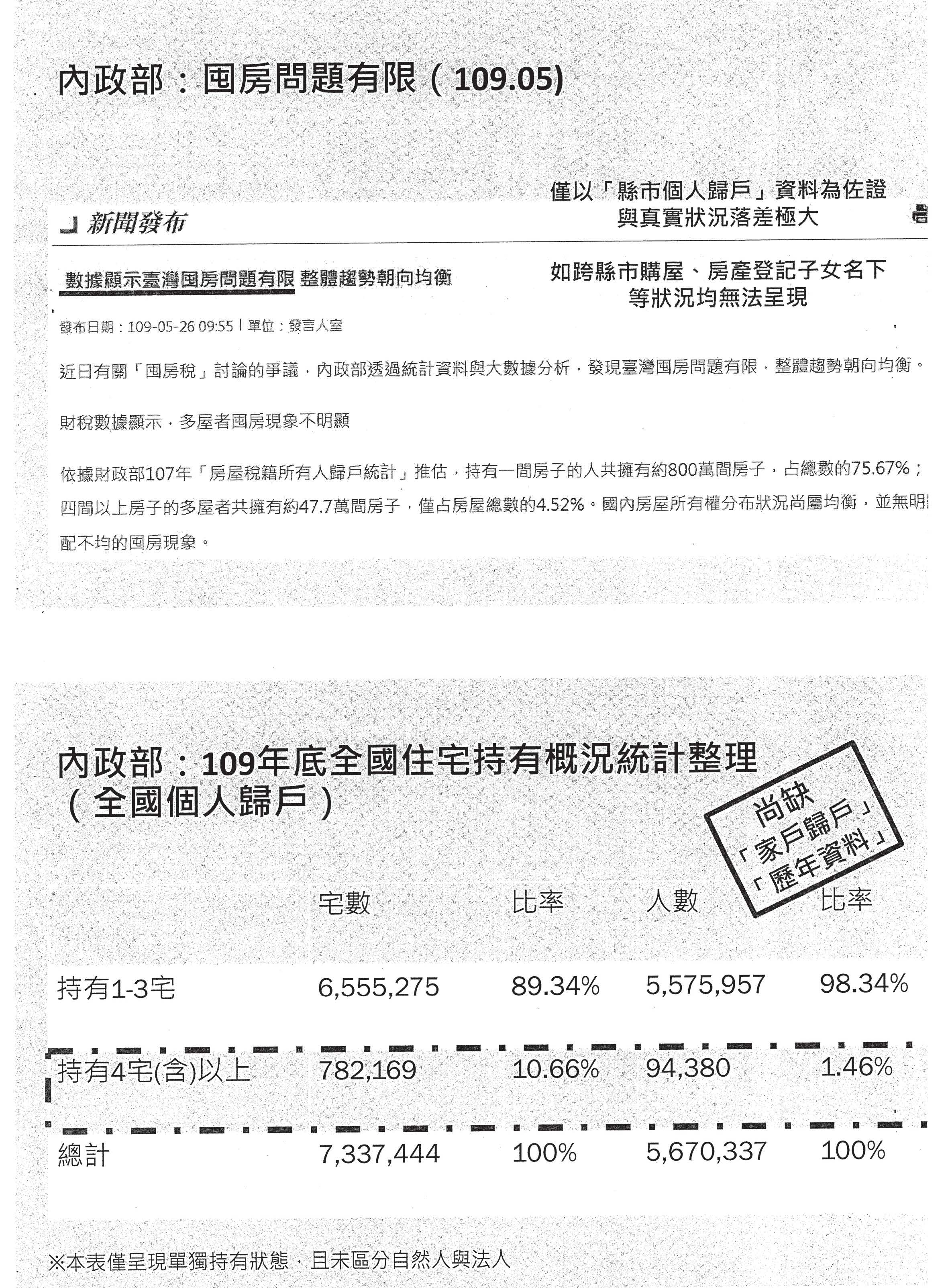 這就是剛剛內政部說的囤房問題有限,但是這一份資料都還是用縣市個人歸戶資料,其實非常不準確。內政部前陣子公布的就是109年底全國住宅持有概況統計整理,在這個地方他終於把住宅拆出來了,也拆出了單獨持有的狀態,可是他不是家戶歸戶,也沒有歷年資料;財政部在2月也公布了房屋稅及家戶歸戶的統計整理,可是在這個部分他沒有拆住宅使用,也沒有拆單獨持有,也沒有歷年資料。所以現在財政部跟內政部的資料其實是兩隻老虎,一個缺耳朵、一個缺尾巴,永遠call不出一個完整的資料出來,就更不用說歷年的資料了。