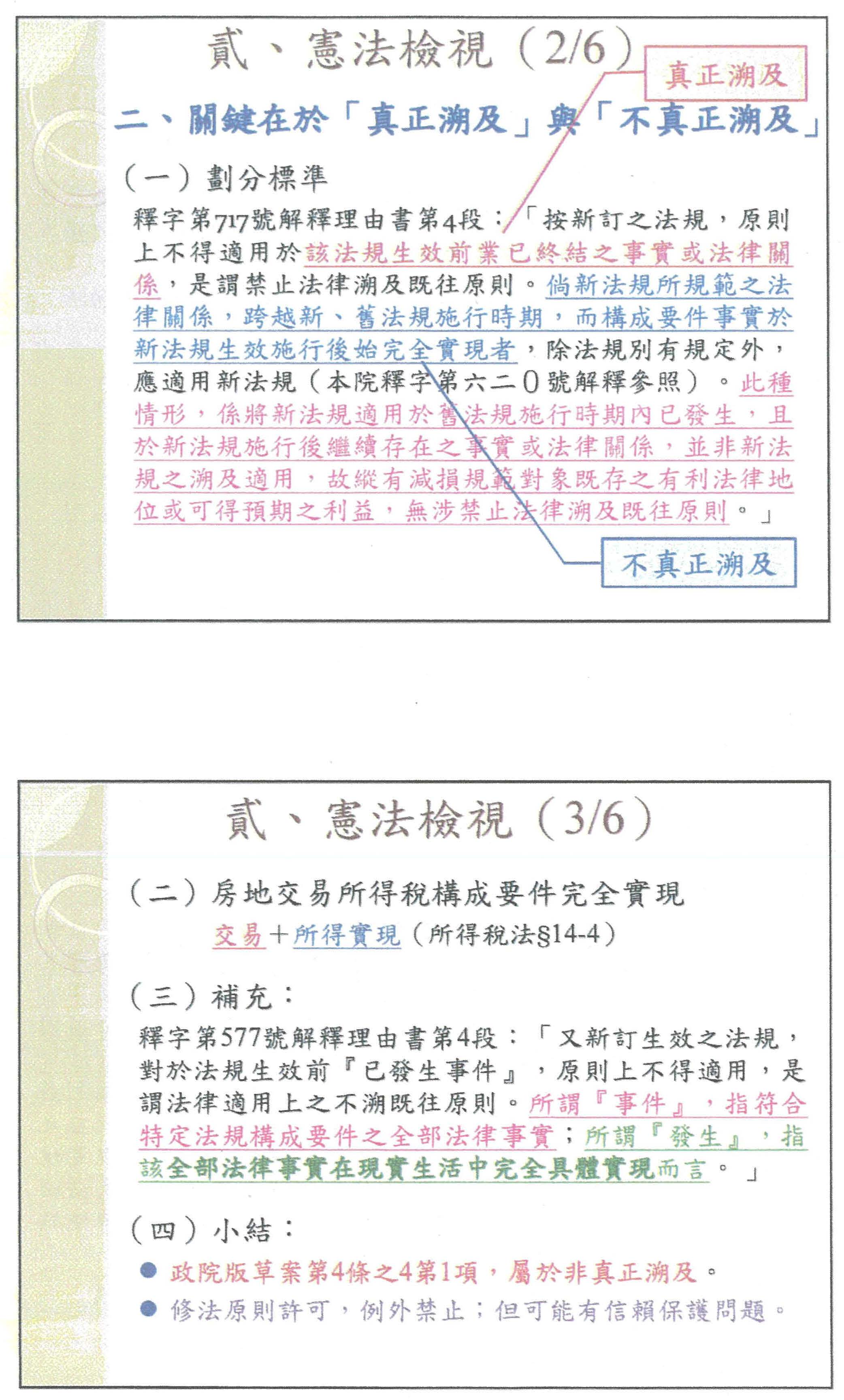 本案真正的關鍵是政院版草案到目前為止的遣詞用字到底是真正溯及還是不真正溯及?我必須坦白地說,其實大法官沿用真正溯及跟不真正溯及是來自德國的概念,所謂的真正溯及是生效之前已經完全發生、已經終結的事實,如果新法回頭去評價它的時候,才叫做真正溯及。若以政院的草案來看,自105年1月1日以後取得房子,在新法通過之後才課稅的狀況,它的落點比較有可能會掉在不真正溯及,如果是不真正溯及的狀況,我剛剛已經說明,它就不是法律溯及,所以這可能有點顛覆大家在輿論上或現在所講溯及既往的概念。因為法律的部分,在憲法上做這樣的釐清,已經有非常多大法官解釋是這樣的處理,如果是這樣,房地合一2.0草案的構成要件真正要實現,必須等到實際有交易,而且在所得實現的時候。以下我列了一個更精準的定義,不是在大法官的解釋文,而是在一個大法官解釋的理由書裡提到,對於事件跟其發生,也就是終結與否的定義其實非常清楚,這樣總體的檢視,政院版到目前為止,說實在的,如果說它是溯及,它也是不真正溯及,嚴格來講,它就沒有涉及法律溯及的問題,這是必須跟大家說明,一個概念的澄清。
