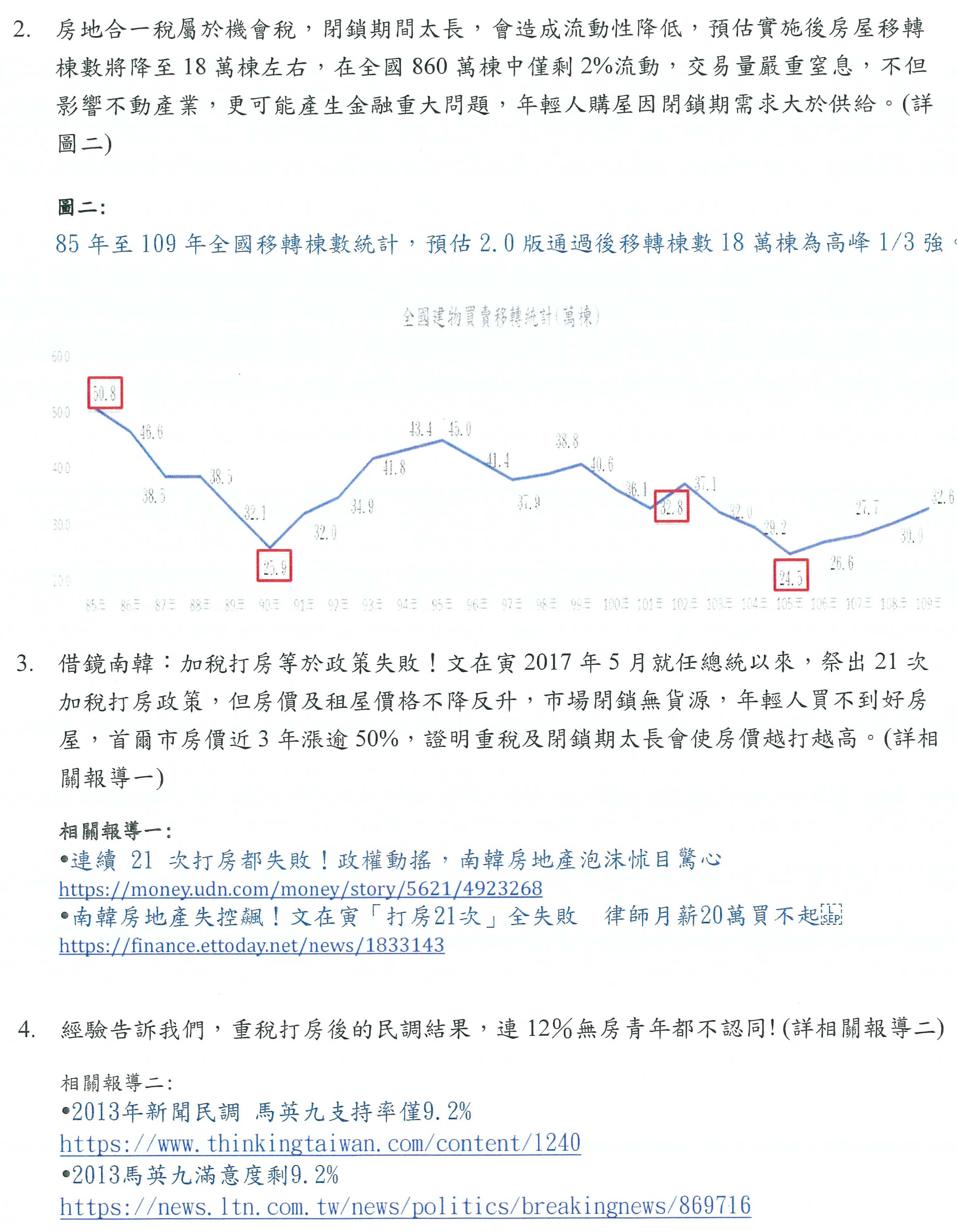 再者,借鏡南韓的經驗,非常清楚,如果是為了選舉考量,很簡單,現在定下來,我們即將公布支持房地合一、實價課稅的所有立委、所有黨團給年輕人知道,了解這樣到底是不是對年輕人有幫助。南韓的經驗是上漲52%,打房用加稅的手段是無效的嘛!不要騙一般的年輕人。奢侈稅通過,馬英九政府曾經想要爭取12%年輕人的支持,結果民調跌到9.2%。這是可以動搖政黨整個選舉的一個改變,所以我建議各政黨應該非常非常慎重的考慮支持這個法案與否。