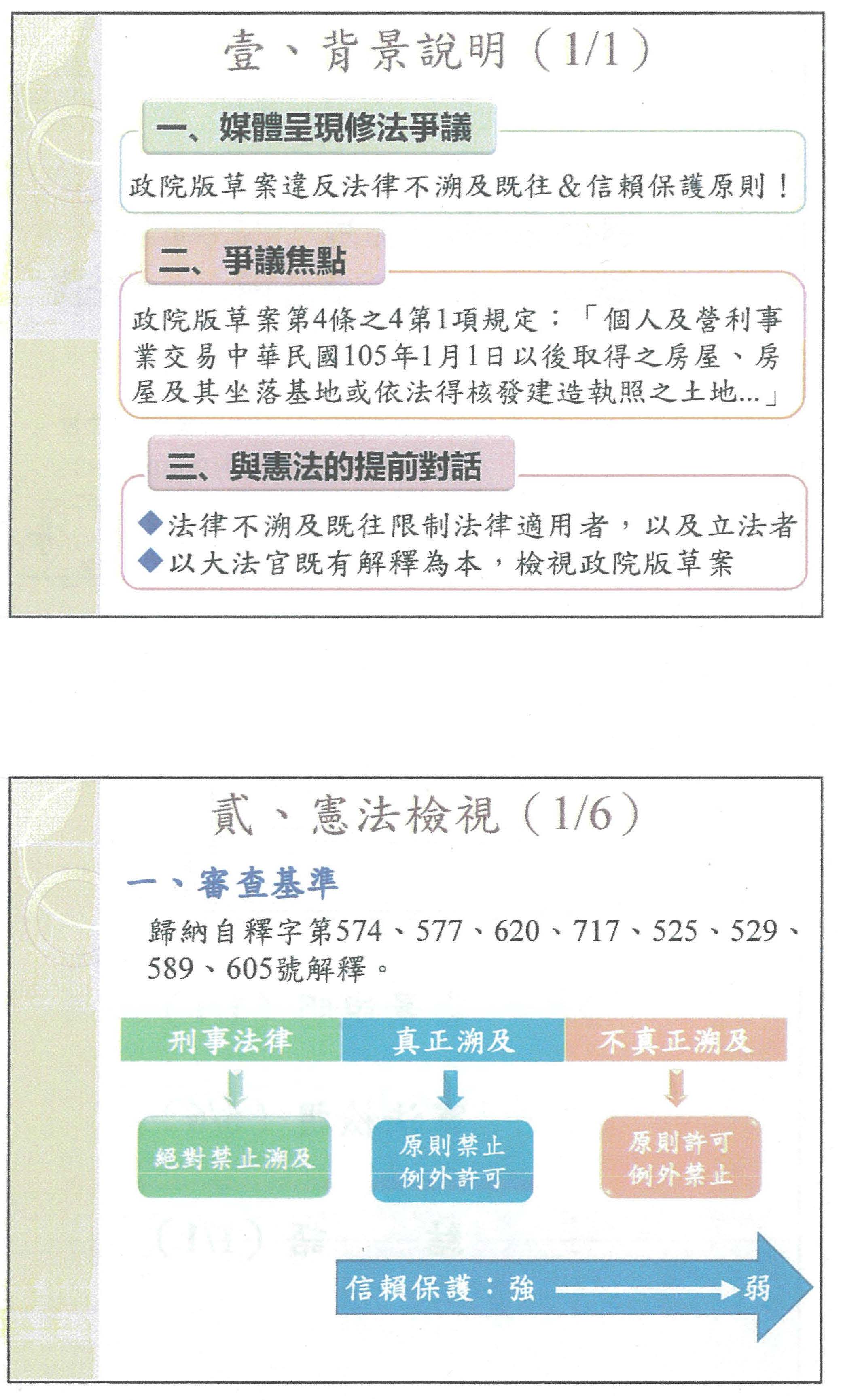 首先,我必須把所謂的法律不溯及既往的概念稍微作一點分析,也就是一般現在在輿論所講的法律不溯及既往的問題,其實到最終如果立法通過,它一定要來到可能違憲的司法審查部分,所以我在這裡希望先以大法官現在有的解釋來處理這個問題,讓大家知道所謂的法律不溯及既往在今天政院版的草案到底有沒有踩到紅線?請大家看到憲法檢視的這6張簡報的第1張,為了讓大家可以比較清楚的掌握,也許不是一般輿論上,而是法律上精準的概念,我畫了一個圖,這個圖其實在上面的這個欄位當中,它其實分析到的是,刑事的法律是絕對禁止溯及既往,接下來中間這個欄位是真正溯及,右邊這個欄位是不真正溯及,不真正溯及有「溯及」兩個字,但是必須跟大家報告,它就不是溯及。在所有的立法過程當中,它給的尺度、紅線部分,也就是下一個欄位的部分,換句話說,刑事部分是絕對不可以的;如果是真正的部分,它是原則禁止例外,還是可以的;如果是不真正,就是原則可以,例外是不可以的。至於連動的信賴保護,其實真正溯及部分的信賴保護是強的,然後不真正溯及的信賴保護是弱的,這個圖給大家一個基本的認知。