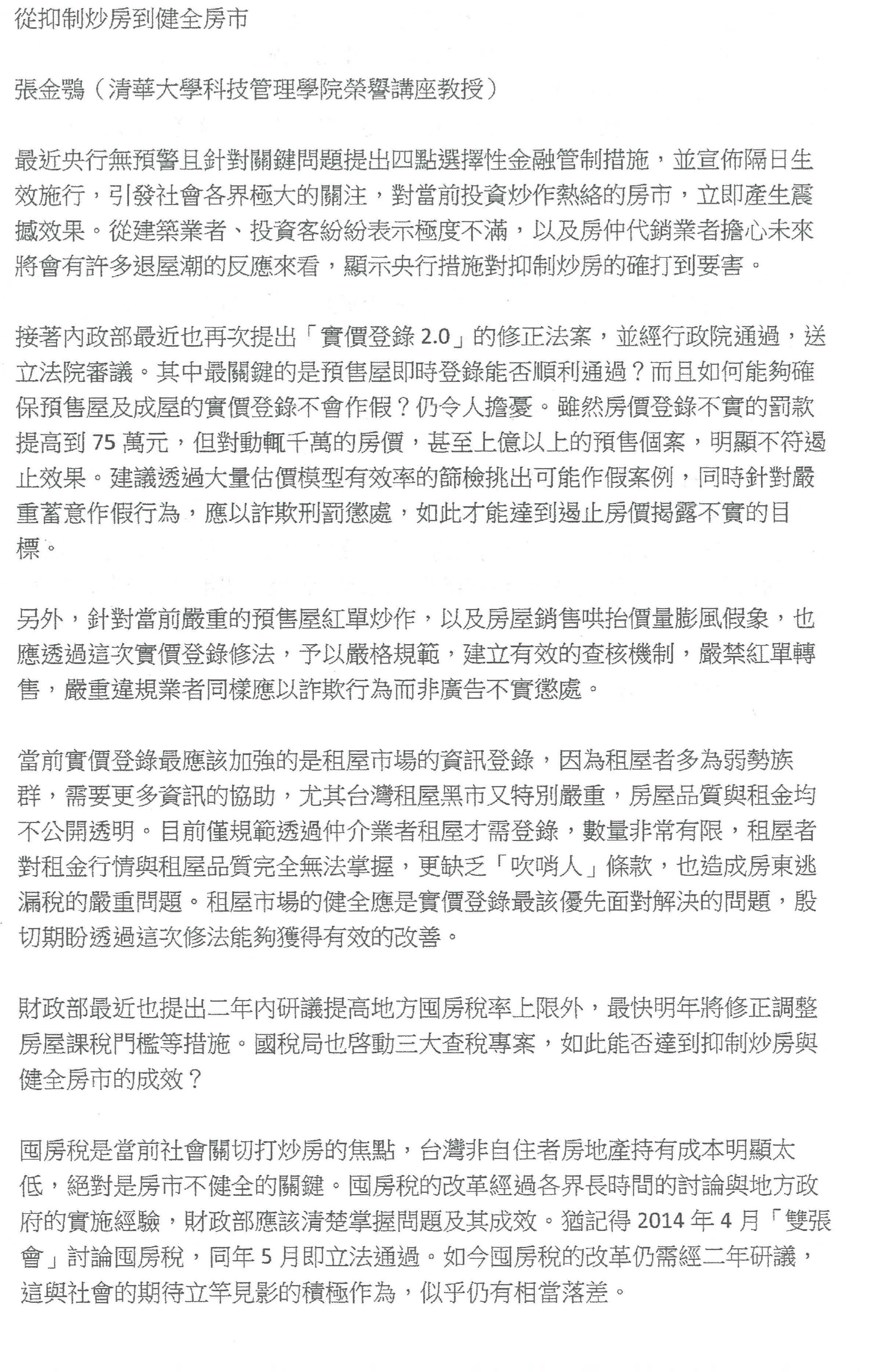 去年12月3日行政院推出健全房地產市場方案,我們認為是一個正確的方向,陸陸續續的,不管是央行或內政部提出的實價登錄2.0版,還有現在財政部提出來的房地合一稅2.0版,這些方向我們都給予高度的肯定。只是在進行相關修法的時候,我們可能還是要以更為嚴謹的角度來檢視相關修法是不是有比較合乎邏輯或比較有效。