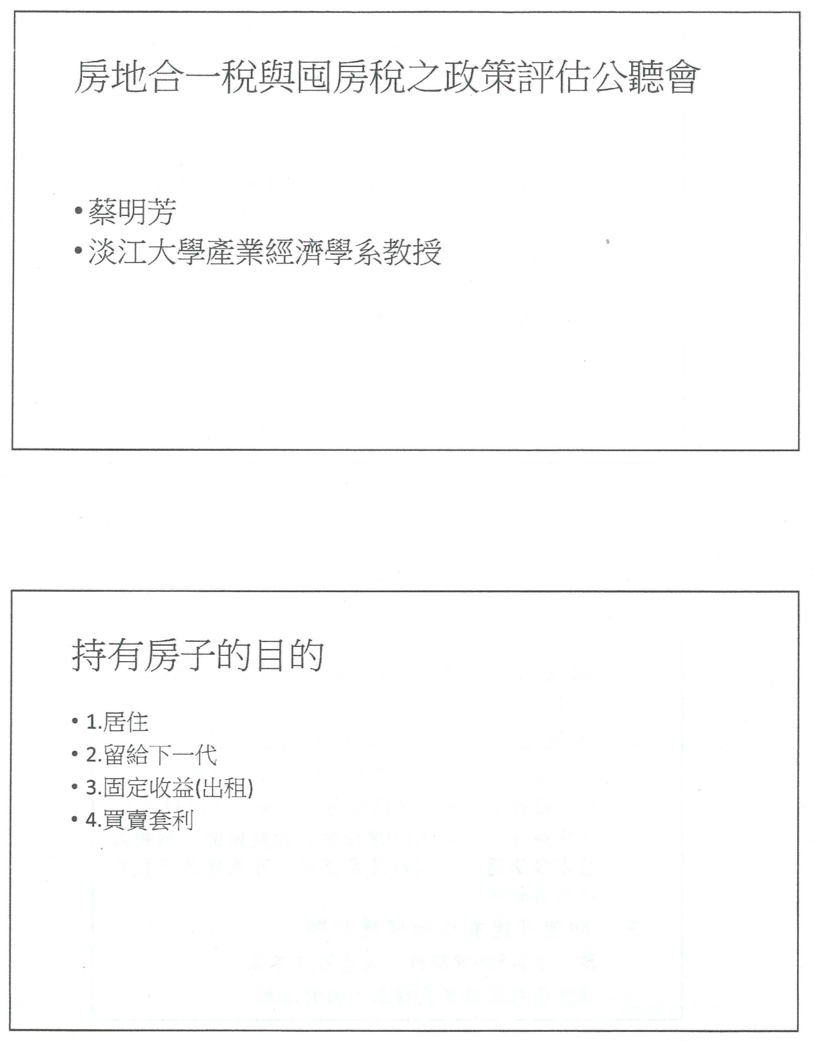 蔡明芳教授:主席、部長、各位與會先進大家好,不好意思我不知道今天沒有投影片,跟主席抱歉一下,大家可以看我做的簡報,第一個、持有房子的目的最主要是來自幾個需求,剛剛前面一位發言者其實也提過,不管是居住、留給下一代、當作固定收益或者是要進行買賣套利,其實都是很多人持有房子的目的,目的各有不同。今天大家討論囤房稅也好、房地合一稅也好,到底會不會影響持有房子的目的,這是重點,而不是歸於一般的謾罵。更重要的是,很多在座先進都非常重視的是課囤房稅後到底會不會讓房價下跌,如果不會的話其實就會有後續的效果,我今天會從這幾點跟大家分享。
