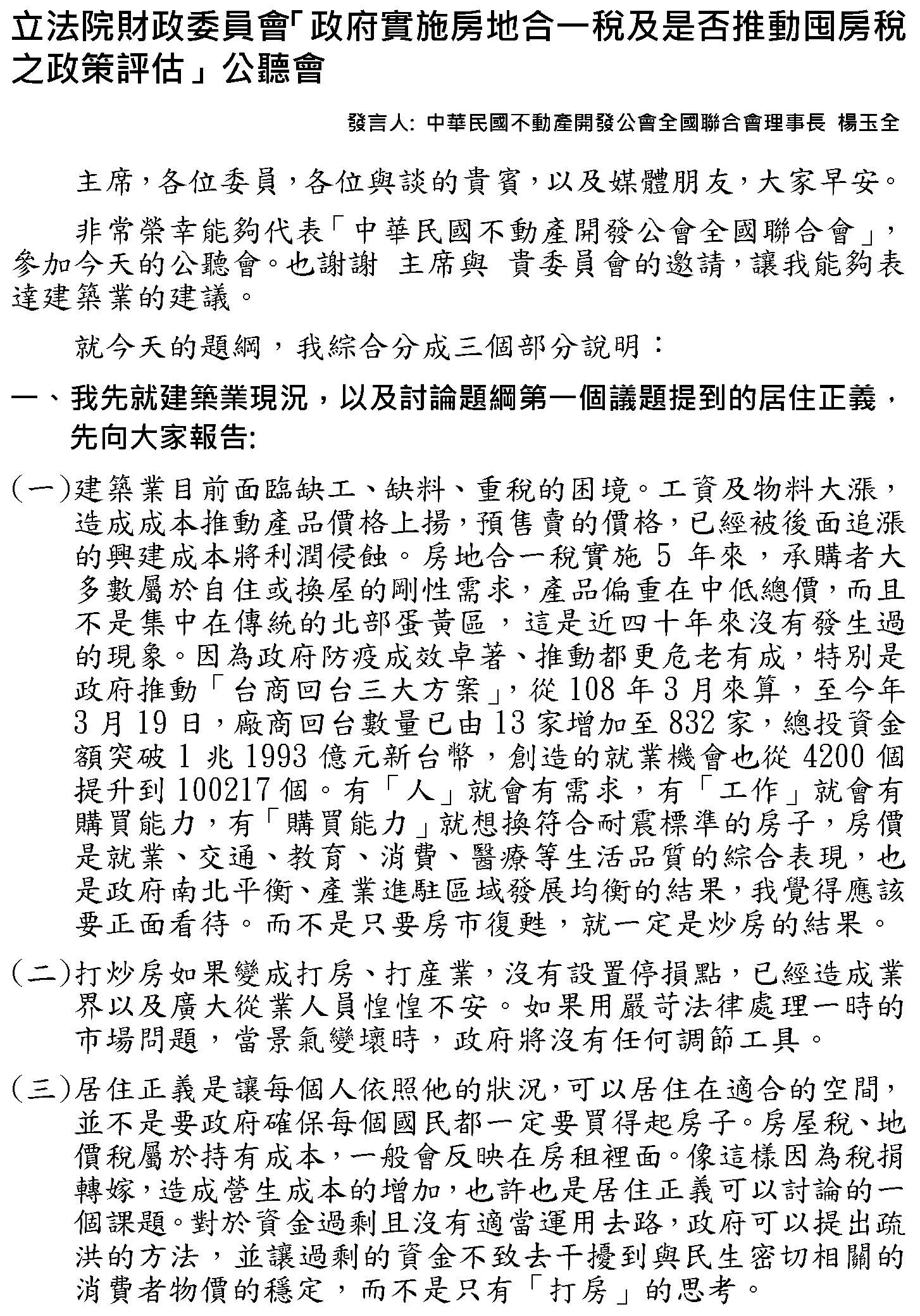 楊玉全理事長:主席、各位委員、各位貴賓、各位媒體,大家早安。非常榮幸能夠代表中華民國不動產開發公會全國聯合會參加今天的公聽會,也謝謝主席、委員的邀請,讓我們能夠來表達建築業的建議。
