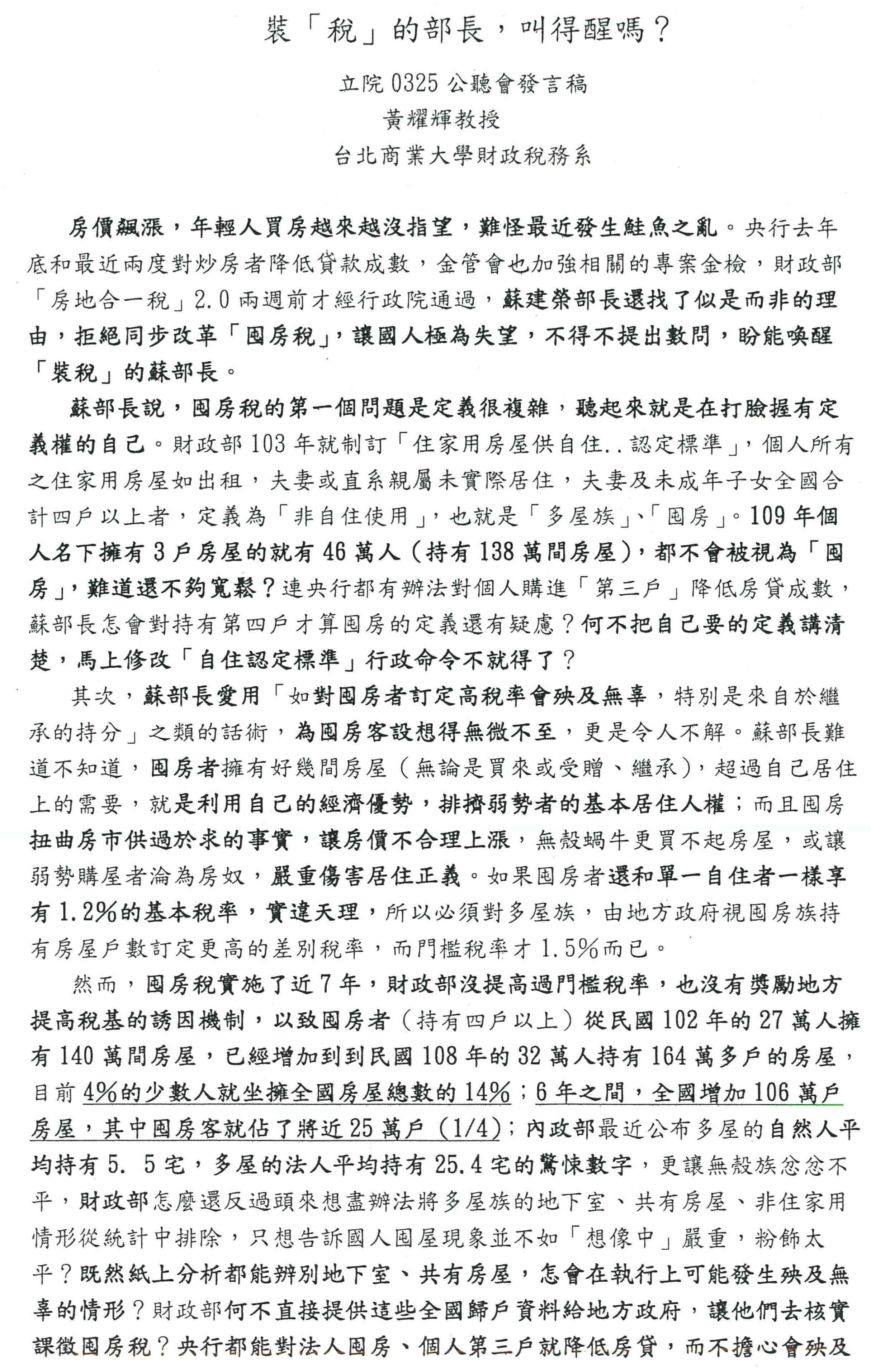 黃耀輝教授:主席、各位與會先進,大家早安。很高興參加這場公聽會,我個人的發言內容有提供給立法院行政同仁列印,已放在各位手中,麻煩各位參閱。
