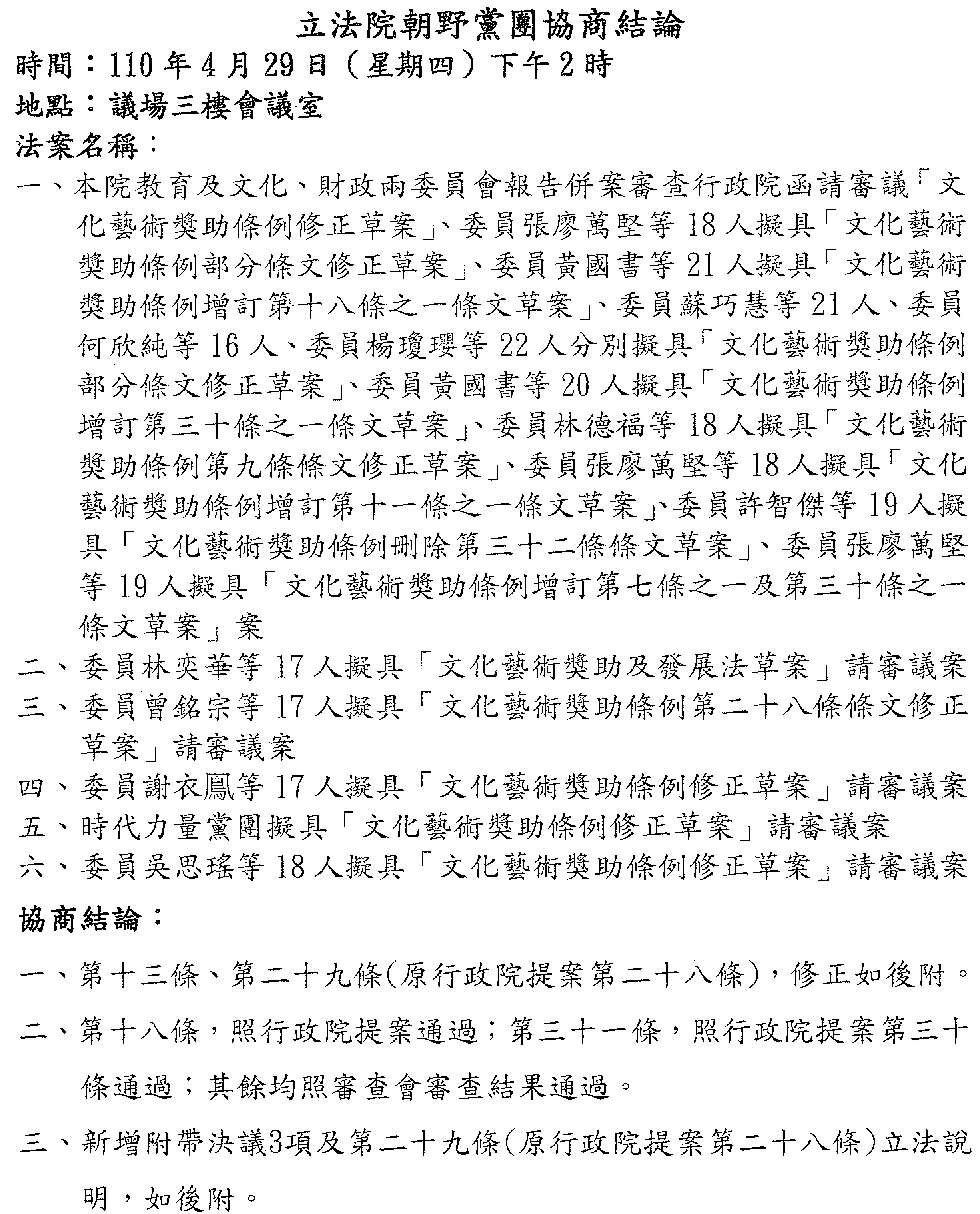 主席:各位先進,謝謝大家撥出寶貴時間參加今天的黨團協商會議,今天開會事由是要繼續研商「文化藝術獎助條例修正草案」相關事宜。