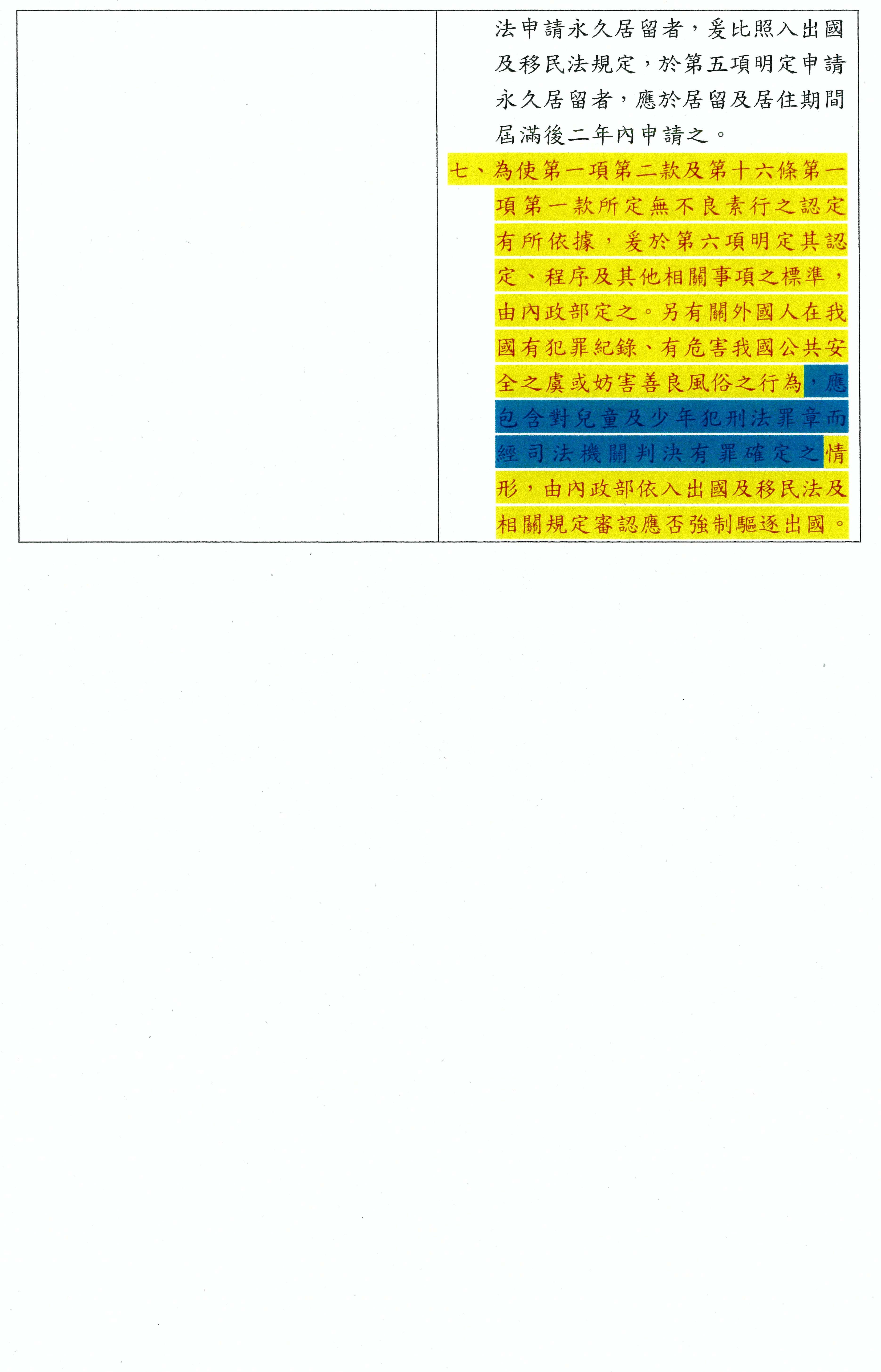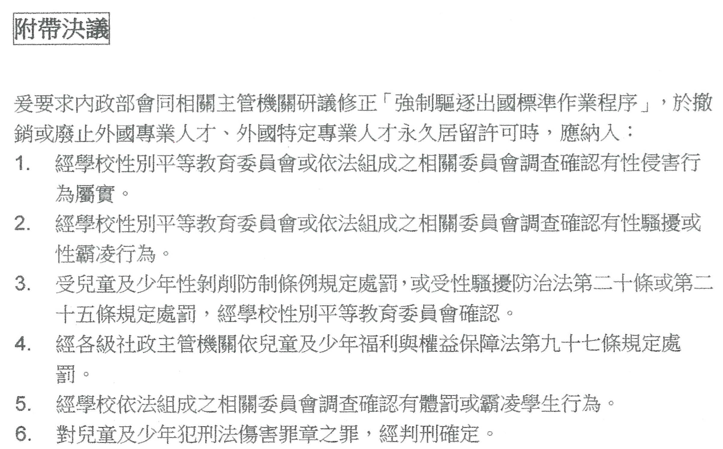 依據《外國專業人才延攬及僱用法》第十四條,外國專業人才在我國從事專業工作,符合一定要件後,得申請永久居留。然而,本條第一項第二款「無不良素行,且無刑事紀錄證明之刑事案件紀錄」之要件,並不包含行為人於教學現場不當對待或虐待兒童之行為,亦即,系爭消極資格要件無法排除違反兒少權法第九十七條受罰鍰、或於執行業務時對兒童及少年犯刑法傷害罪章之罪而受拘役、罰金宣告等行為人,致使渠等行為人仍得以符合申請永久居留之資格,實不利於保障兒少安全。爰請內政部研議依本條第六項所定「無不良素行」之認定標準,應包含違反兒少權法第九十七條以及於執行業務時對兒童及少年犯刑法傷害罪章之罪而經判決確定等情事,以維護我國學童教學環境之安全。