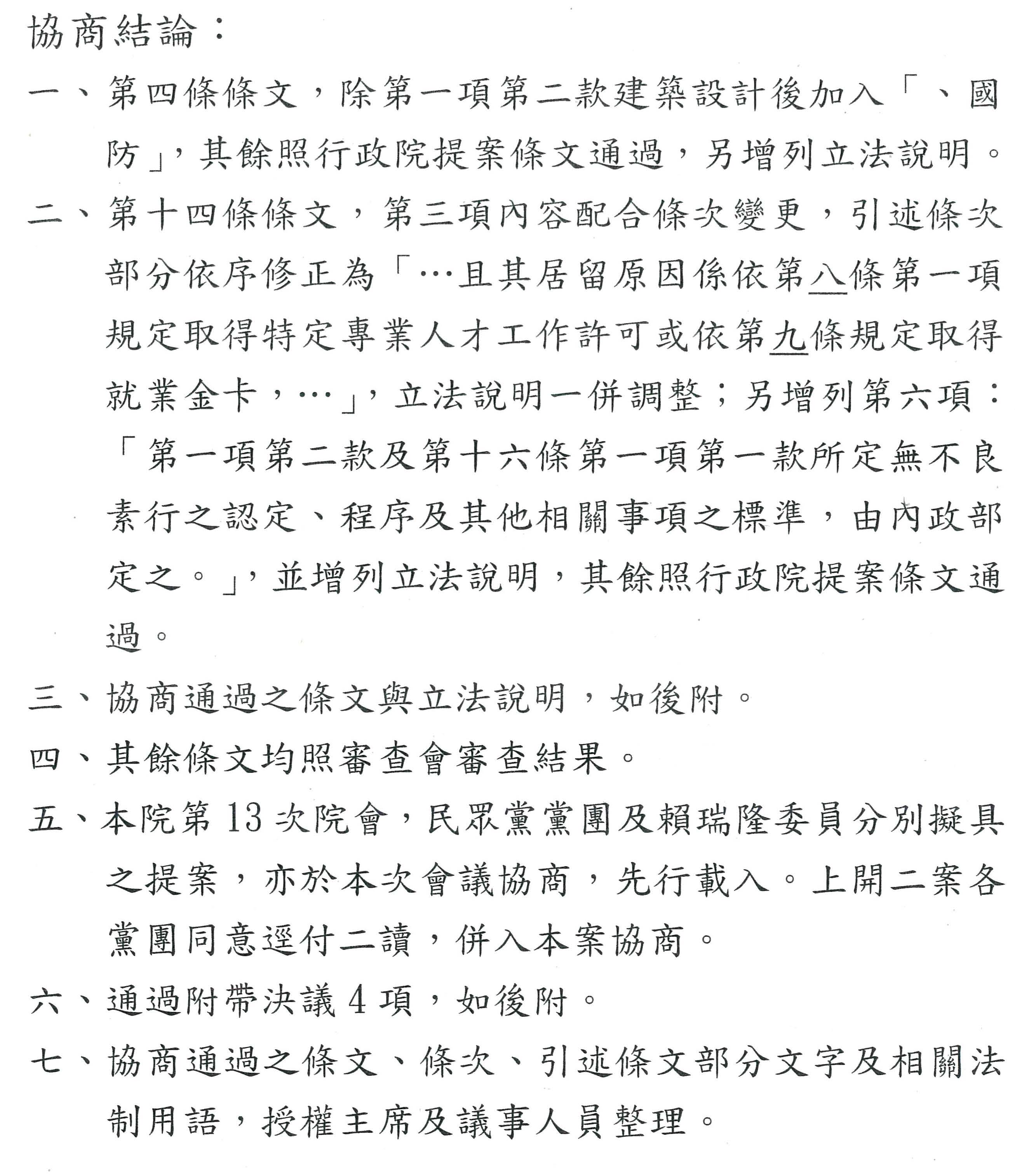 主席:現在繼續開會。先進行處理已有協商結論之討論事項第三案「外國專業人才延攬及僱用法修正草案」,本案經本次會議決議協商後提出本次會議處理。報告院會,本案現已完成協商,請宣讀協商結論。
