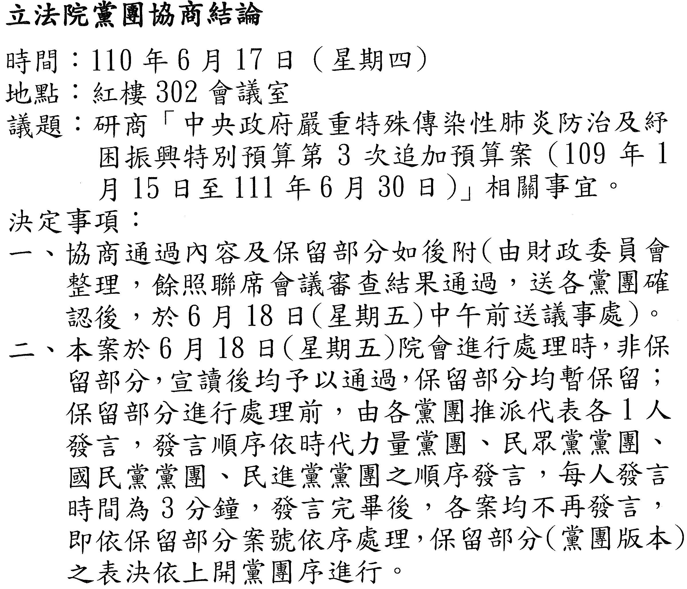 主席:現在繼續開會。進行已經完成協商之討論事項第一案「中央政府嚴重特殊傳染性肺炎防治及紓困振興特別預算第3次追加預算案(109年1月15日至111年6月30日)」,本案經本次會議決議,請游院長召集協商,協商後提出本次會議處理。報告院會,本案現已完成協商,請宣讀協商結論。