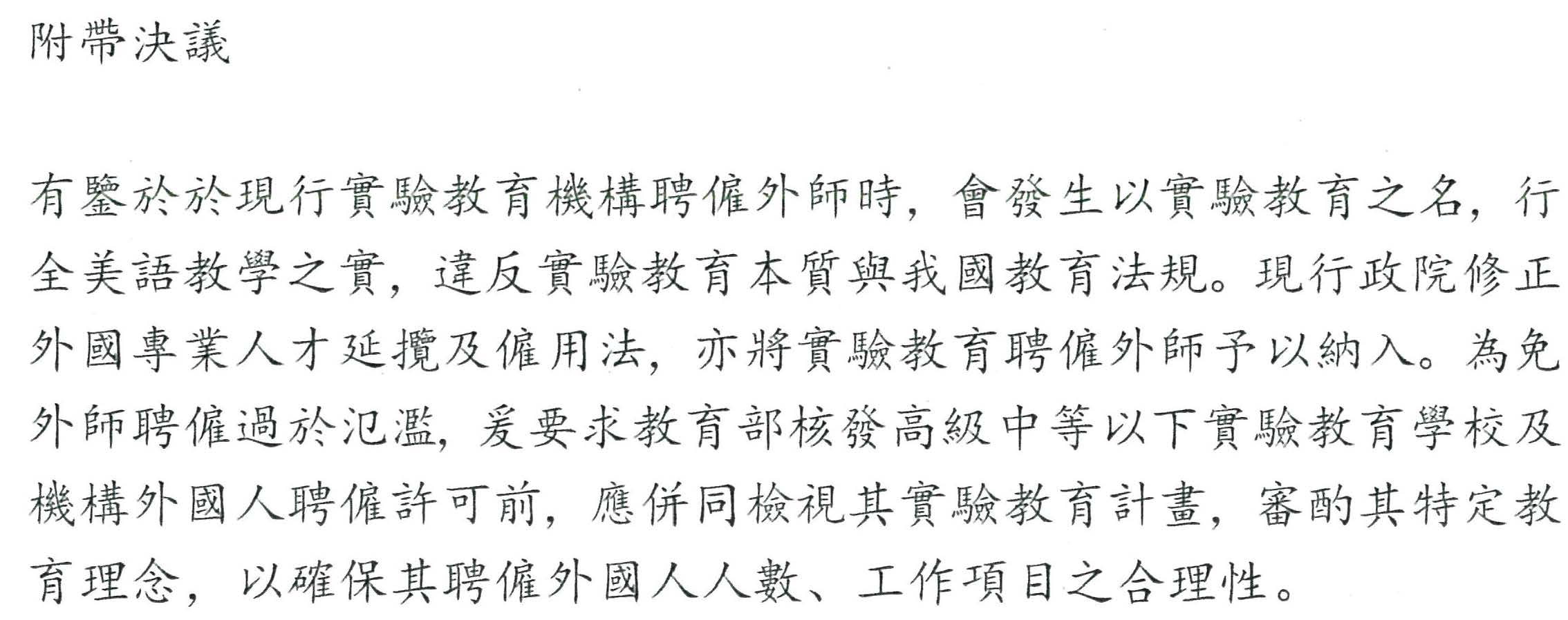 一、有鑒於於現行實驗教育機構聘僱外師時,會發生以實驗教育之名,行全美語教學之實,違反實驗教育本質與我國教育法規。現行政院修正外國專業人才延攬及僱用法,亦將實驗教育聘僱外師予以納入。為免外師聘僱過於氾濫,爰要求教育部核發高級中等以下實驗教育學校及機構外國人聘僱許可前,應併同檢視其實驗教育計畫,審酌其特定教育理念,以確保其聘僱外國人人數、工作項目之合理性。