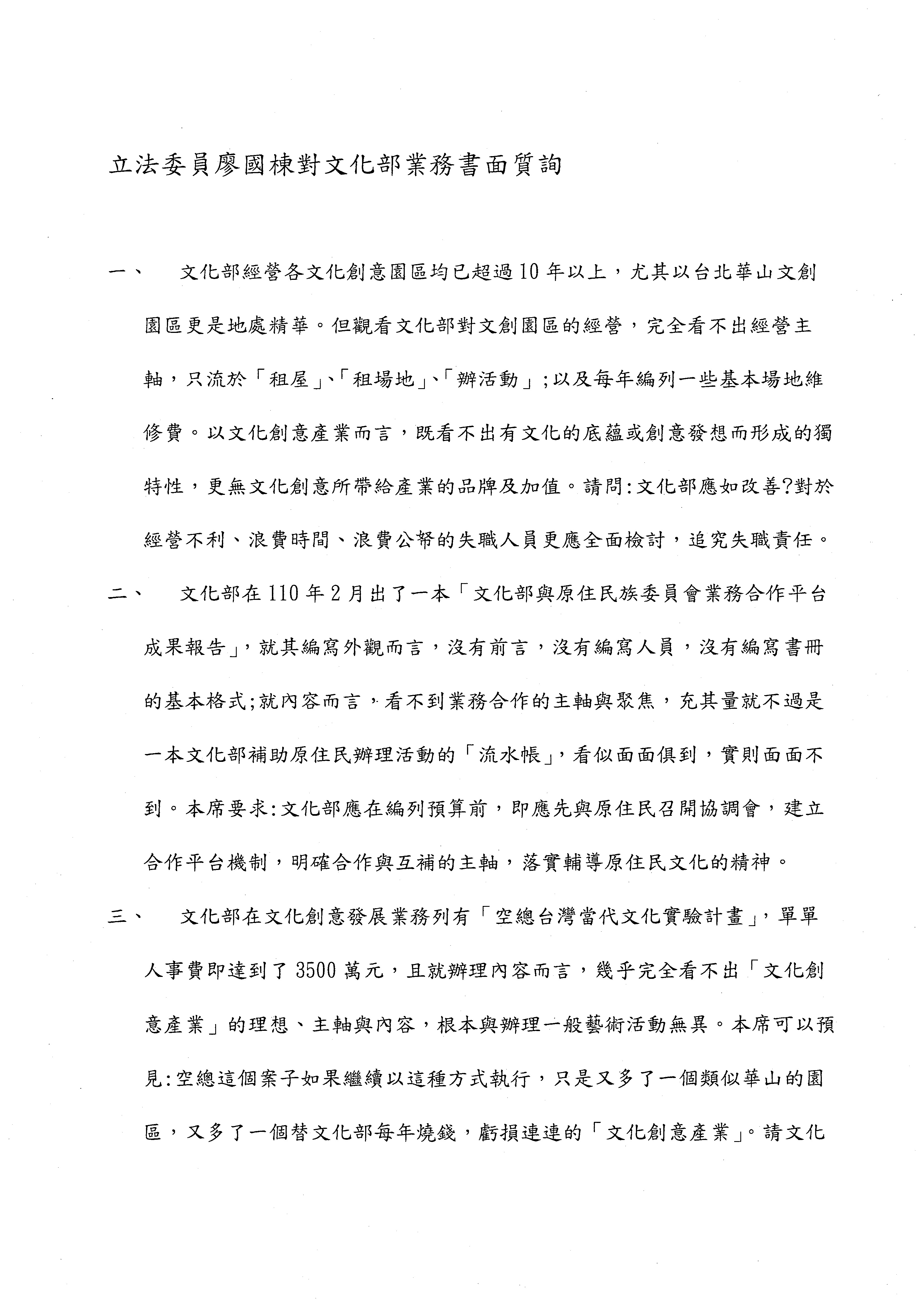 廖委員國棟:對啊,你們那麼多文化人,應該是最會寫文字、最知道編輯才對啊,這樣會讓人覺得有一點粗,我不好意思講那個成語啦,就是很粗略啦。