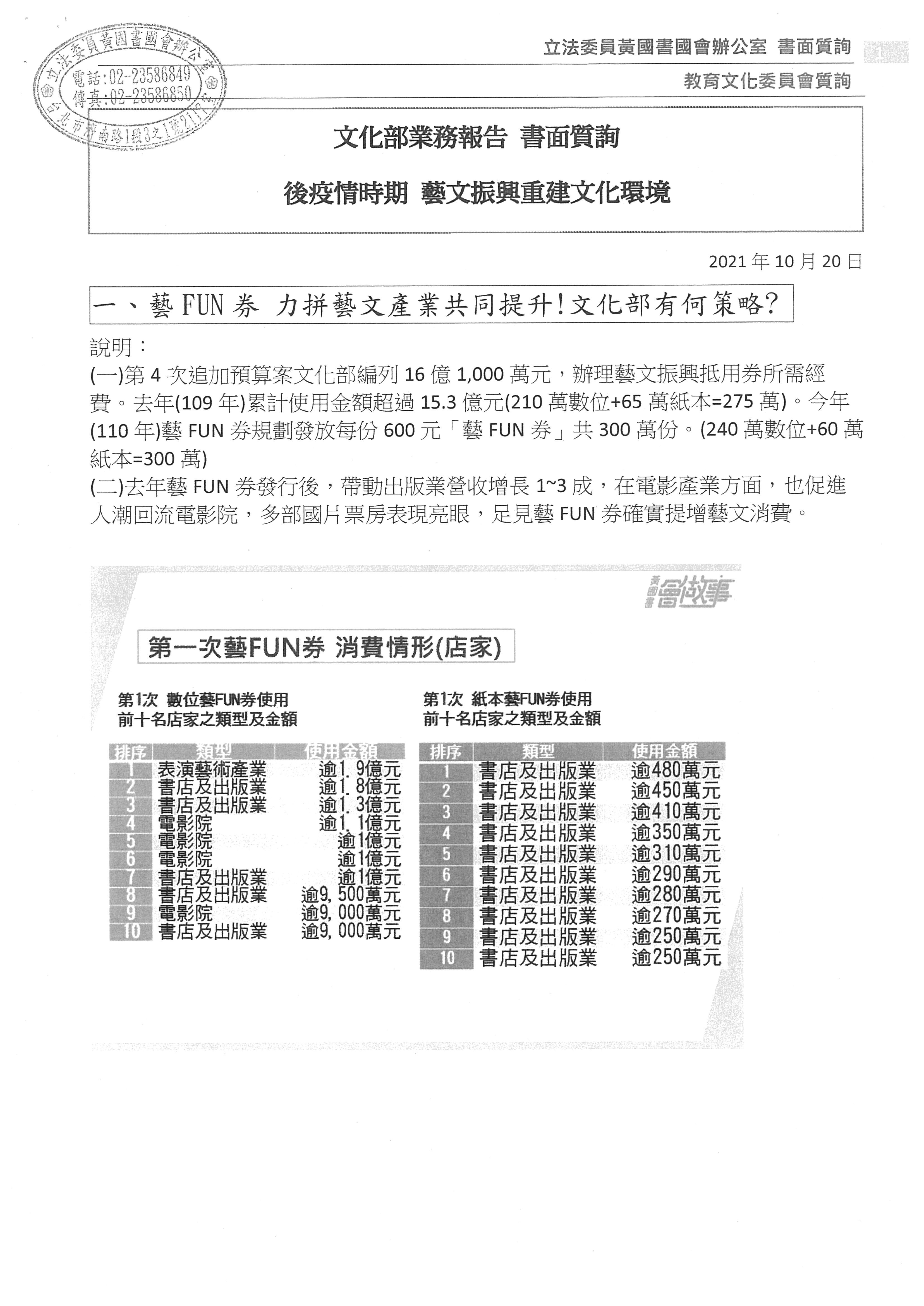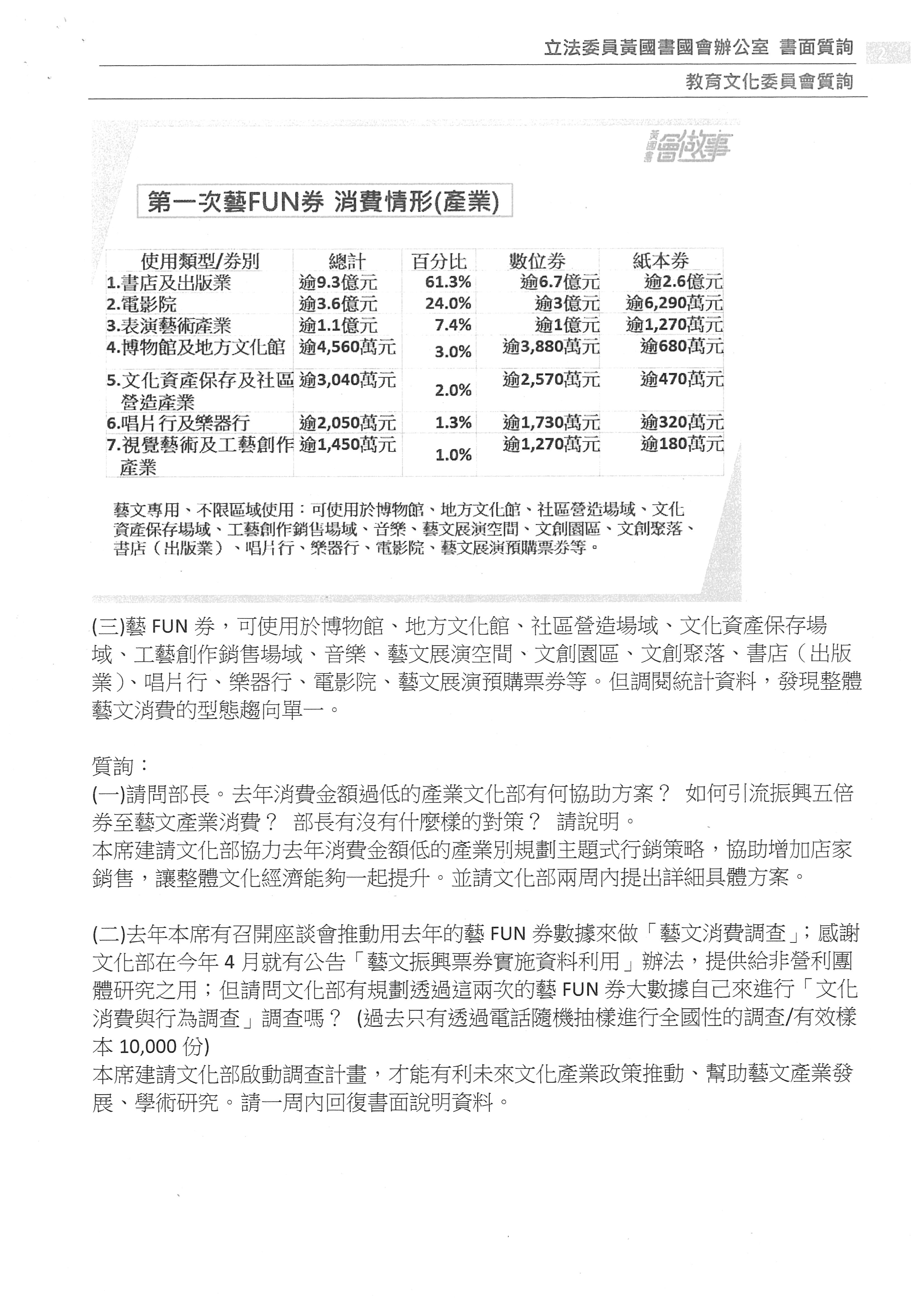在振興政策方面,感謝全國民眾的支持,去年藝FUN券領券率及使用率皆超過9成。今年配合行政院振興五倍券政策,我們再度規劃發放每份600元的「藝FUN券」共300萬份,包含240萬份數位券及60萬份紙本券,上週已抽出81萬份,今天下午將進行第二次抽籤,今年仍以「藝文專用、不限區域使用」為原則,擴大增加線上展演票券、文創原創商品線上交易,以及文化觀光主題旅遊等項目,期待讓更多的藝文產業領域受惠。