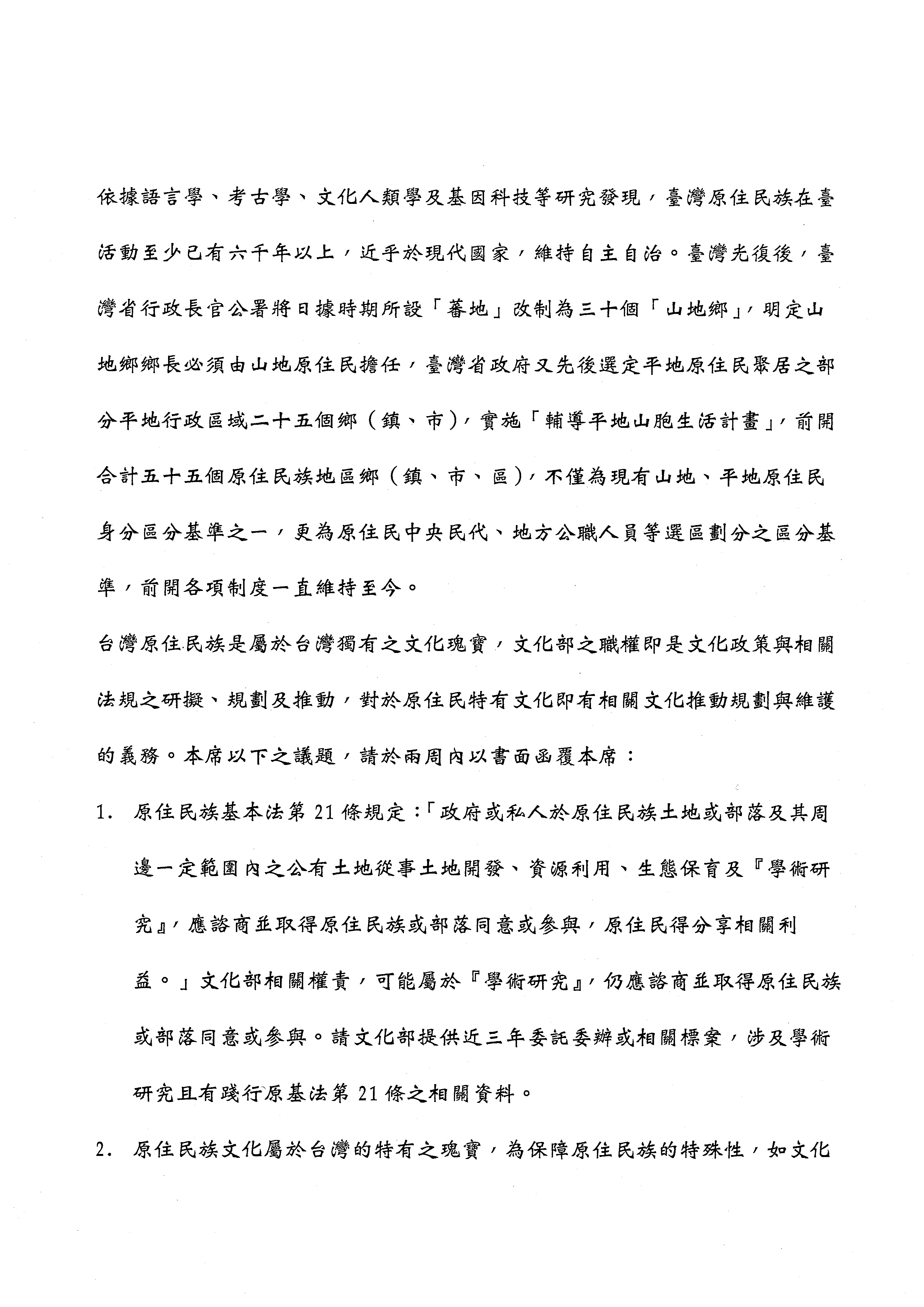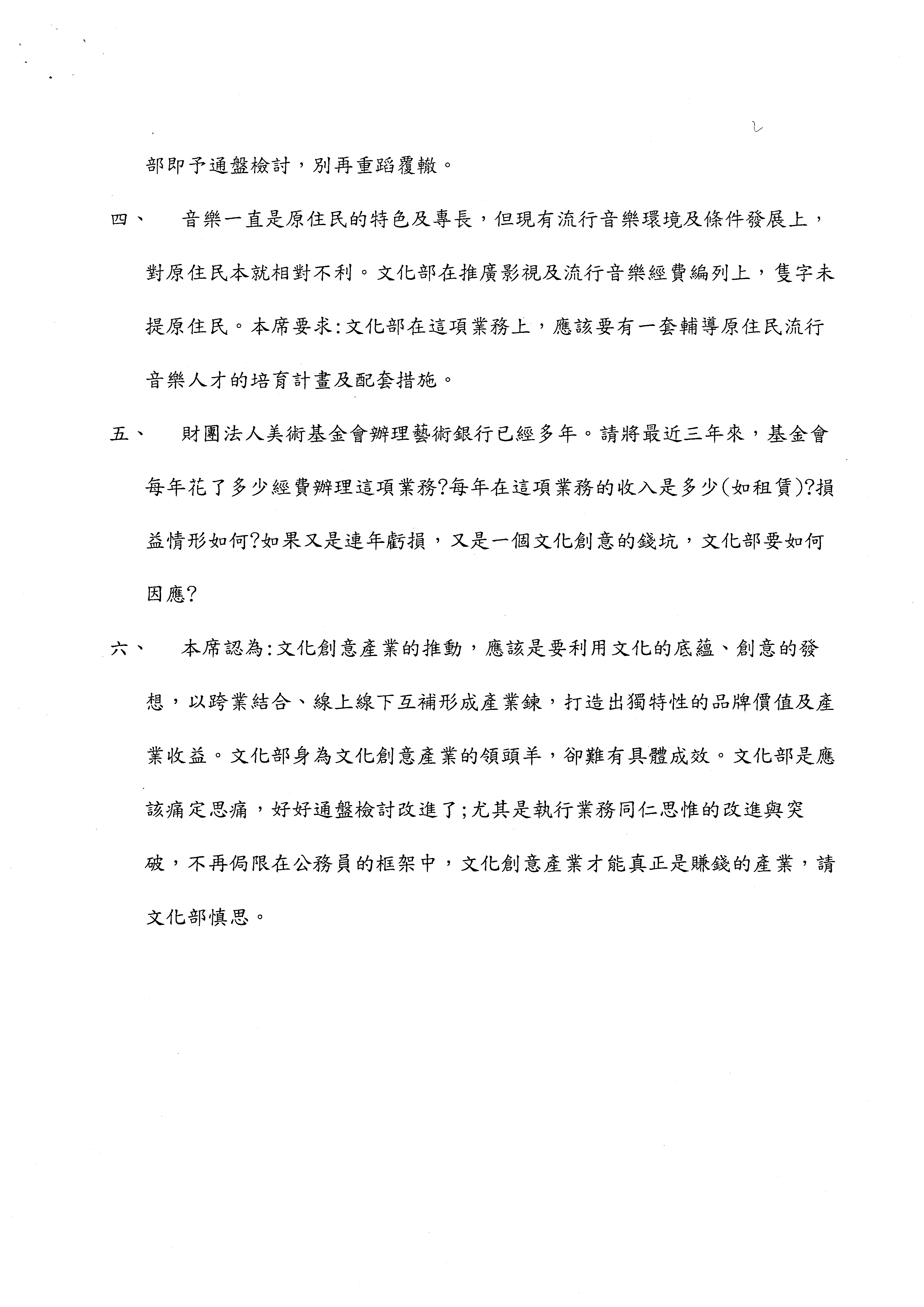 主席:原住民的部分,當然要請文化部部長這邊多多給予協助,我想廖國棟委員也非常關心。
