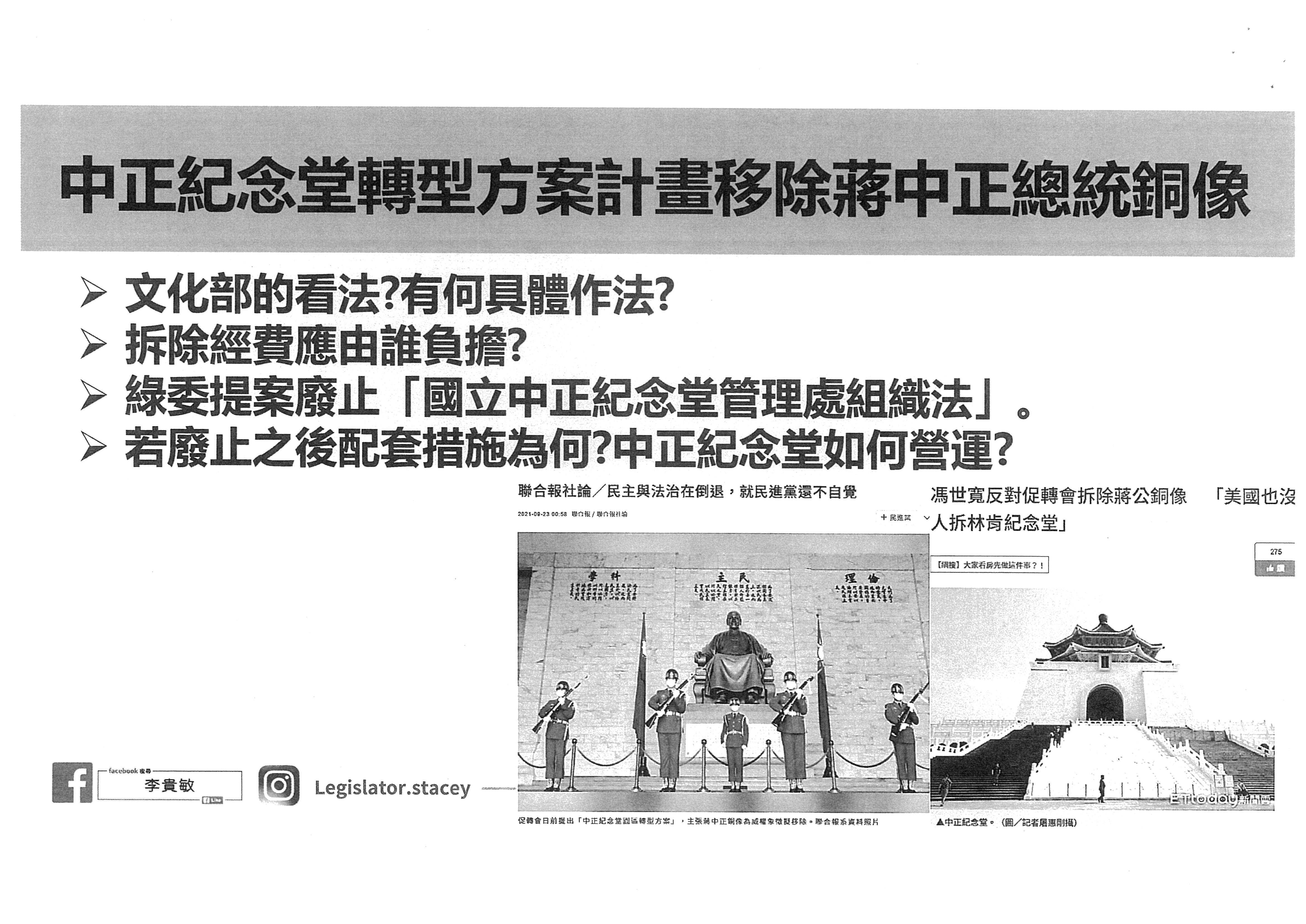 李部長永得:謝謝蔡委員,我覺得這段歷史的確是很重要,可以鼓勵地方的文史工作者再進一步去把更多的故事找出來。文化部目前包括社區營造、國民記憶庫,都有一些資源可以協助地方的文史工作者來做這方面史料的調查及整理。