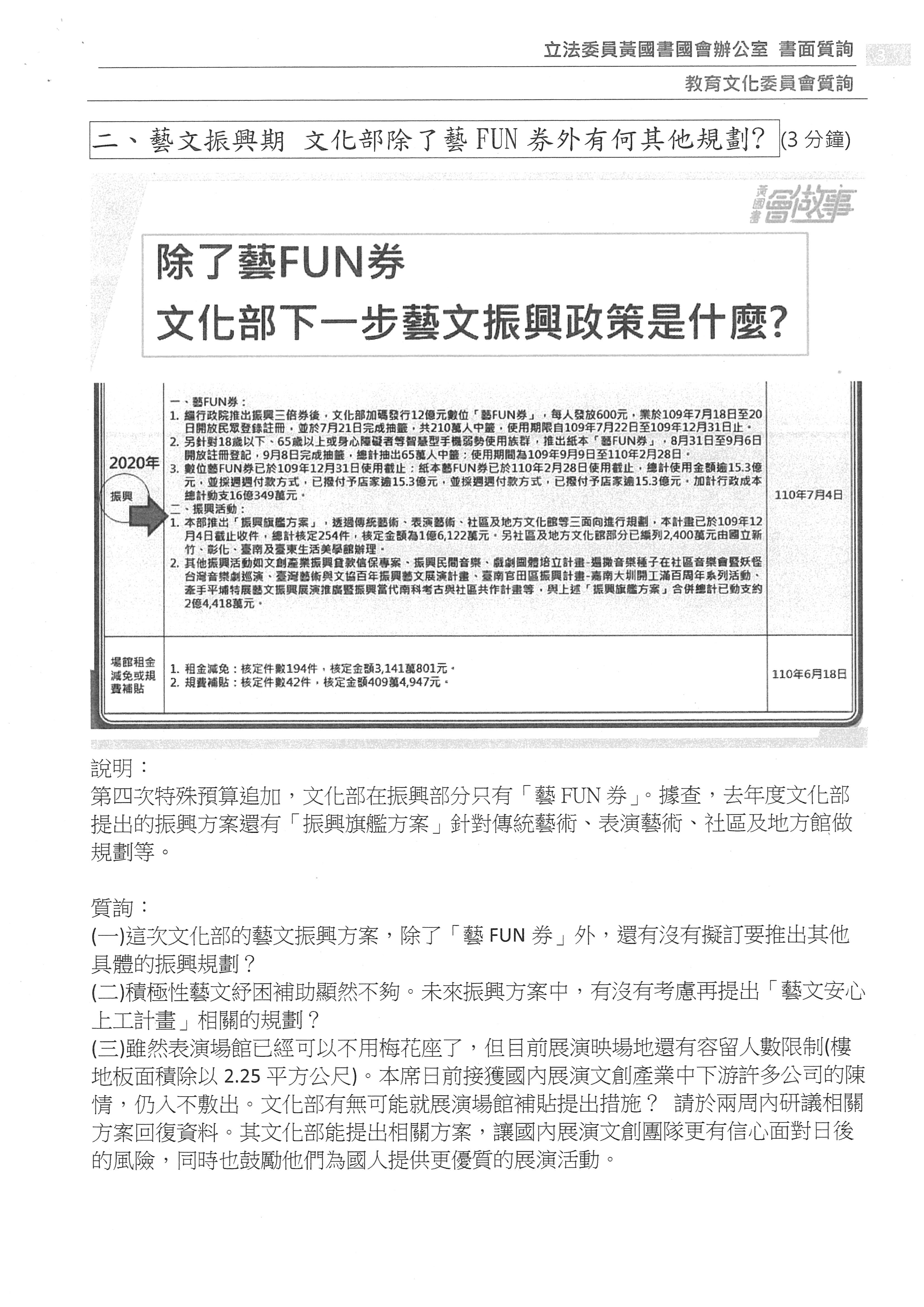 最後,感謝大院諸位委員鼎力支持本部各項施政,本部也更積極地規劃推動各項紓困計畫及振興措施,持續陪伴藝文工作者及產業共同面對難關,期盼各位委員持續給予支持及指教,謝謝大家。