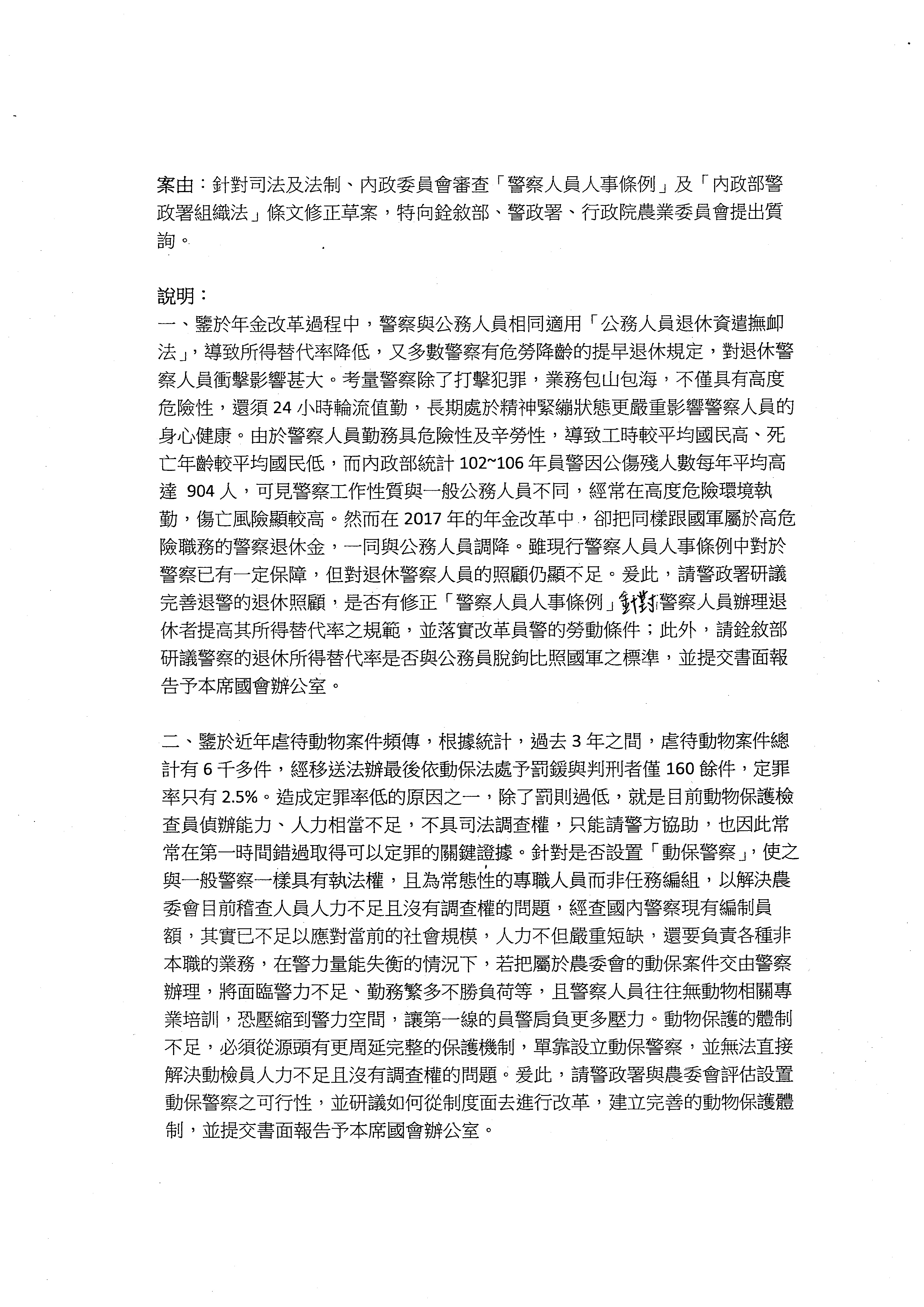 所以我們希望在警政署下面可以增設這個特種的動物保護警察局,才能夠專責做動物保護,而且相關的警員要以特別的警力去執行,這部分我也看到銓敘部提到可能包含員額上的配置也要做一併討論。所以各部會對於我們的修法有表達贊成的部分,我很感謝,但是表達反對的部分,本席也在此做一個說明,謝謝。
