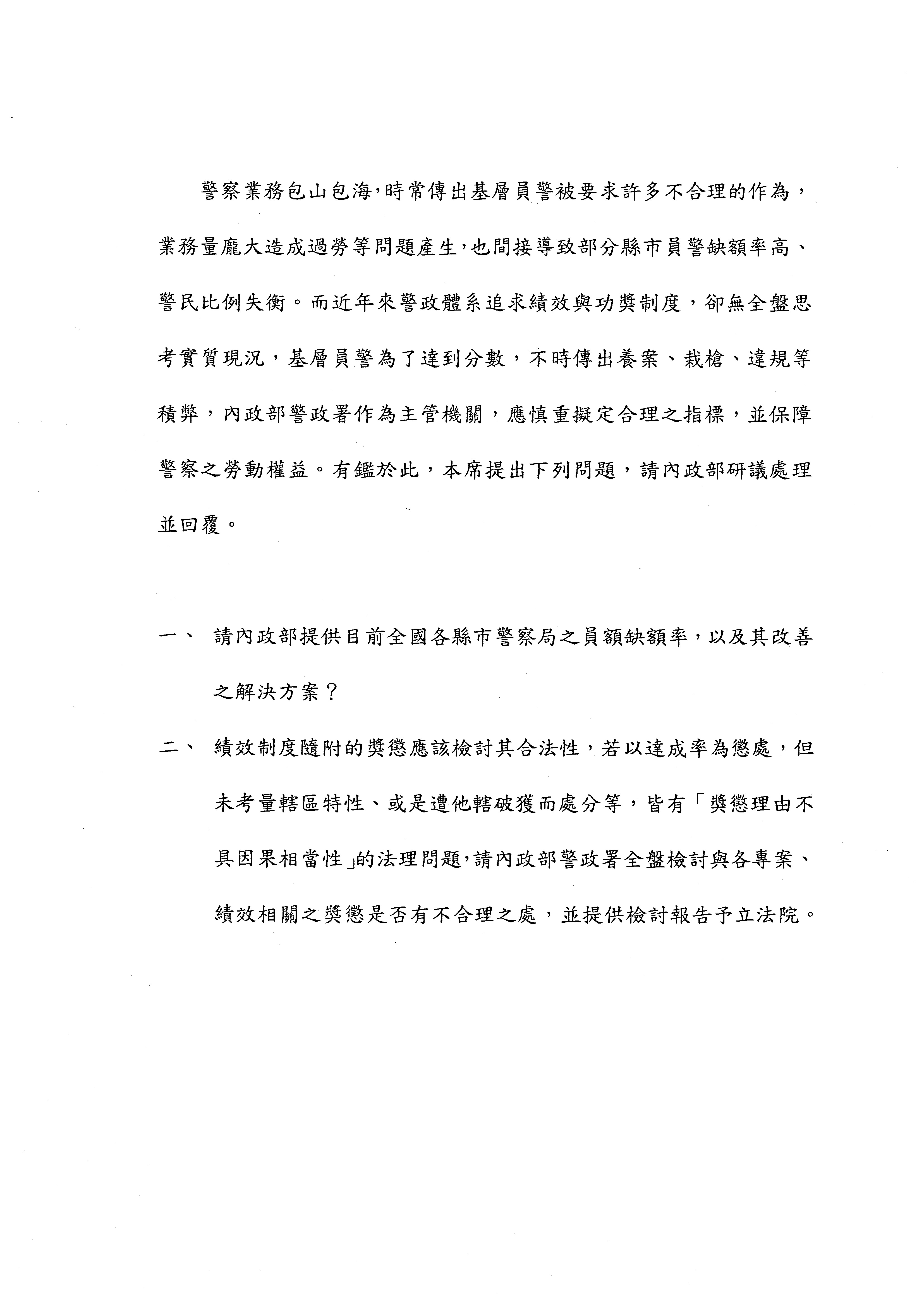 陳次長宗彥:所以我一開始在總體說明的時候,就有說總員額是被匡住的,總員額是有上限的,我也只能就總員額下在警察人員的分工上做調整。