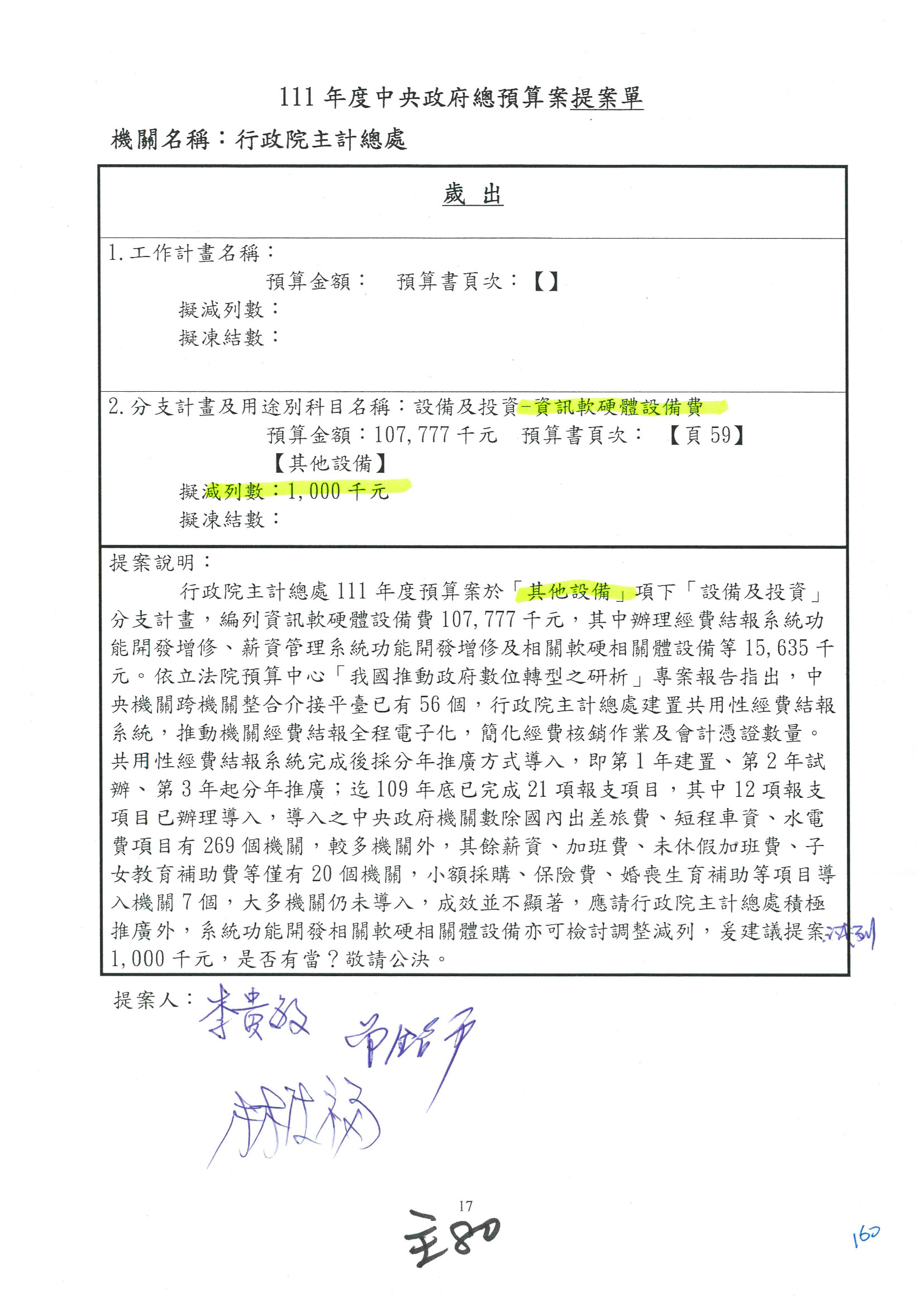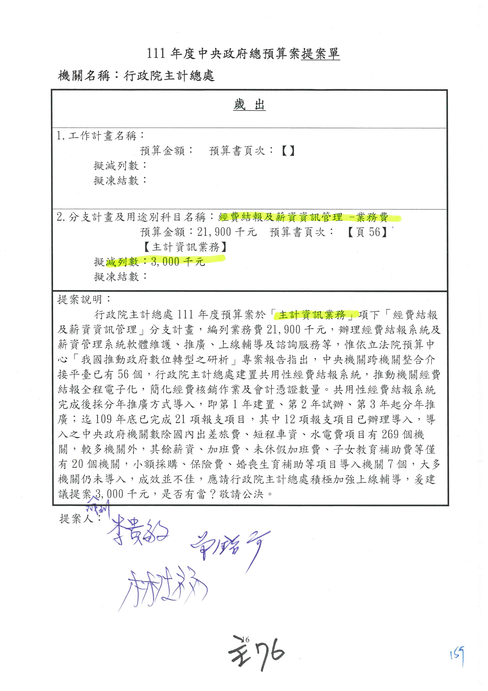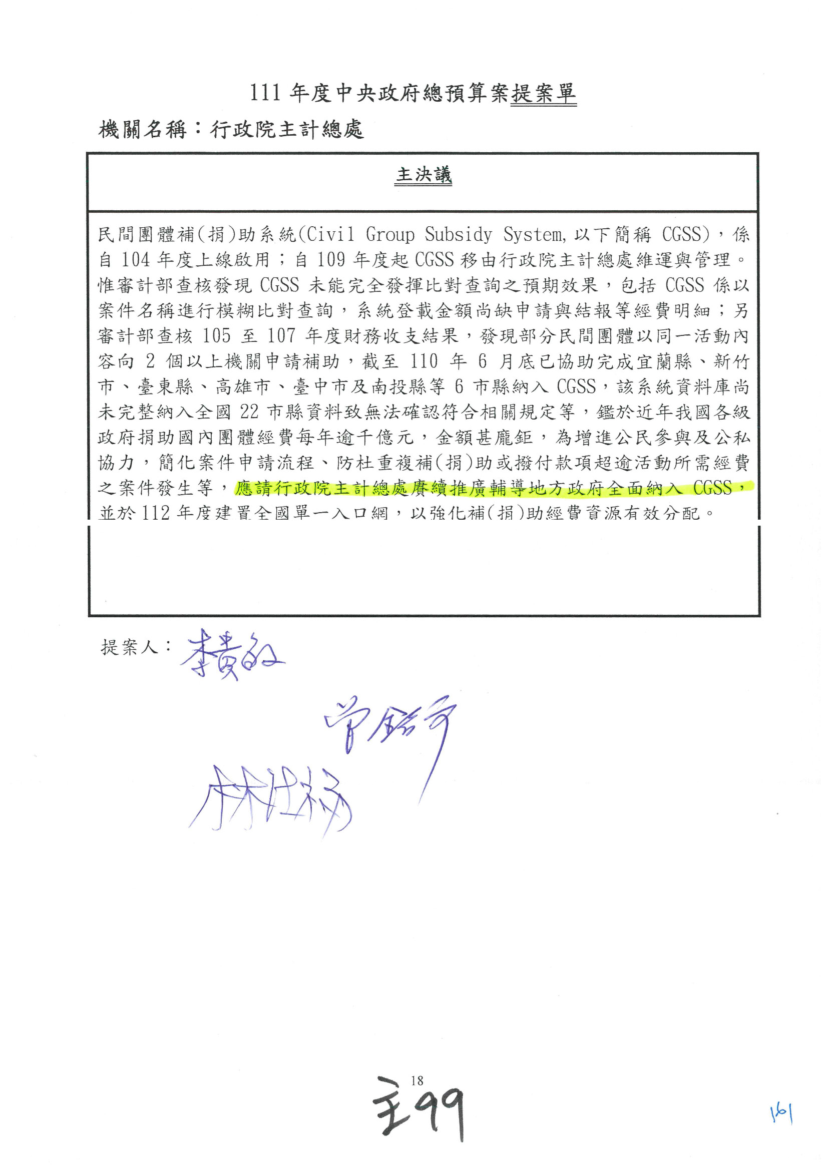 主席:賴委員,剛剛主計總處有一個提案也是一樣的,相同的提案提了2個啦!兩邊都有提,現在是以主計為主,審計為輔。