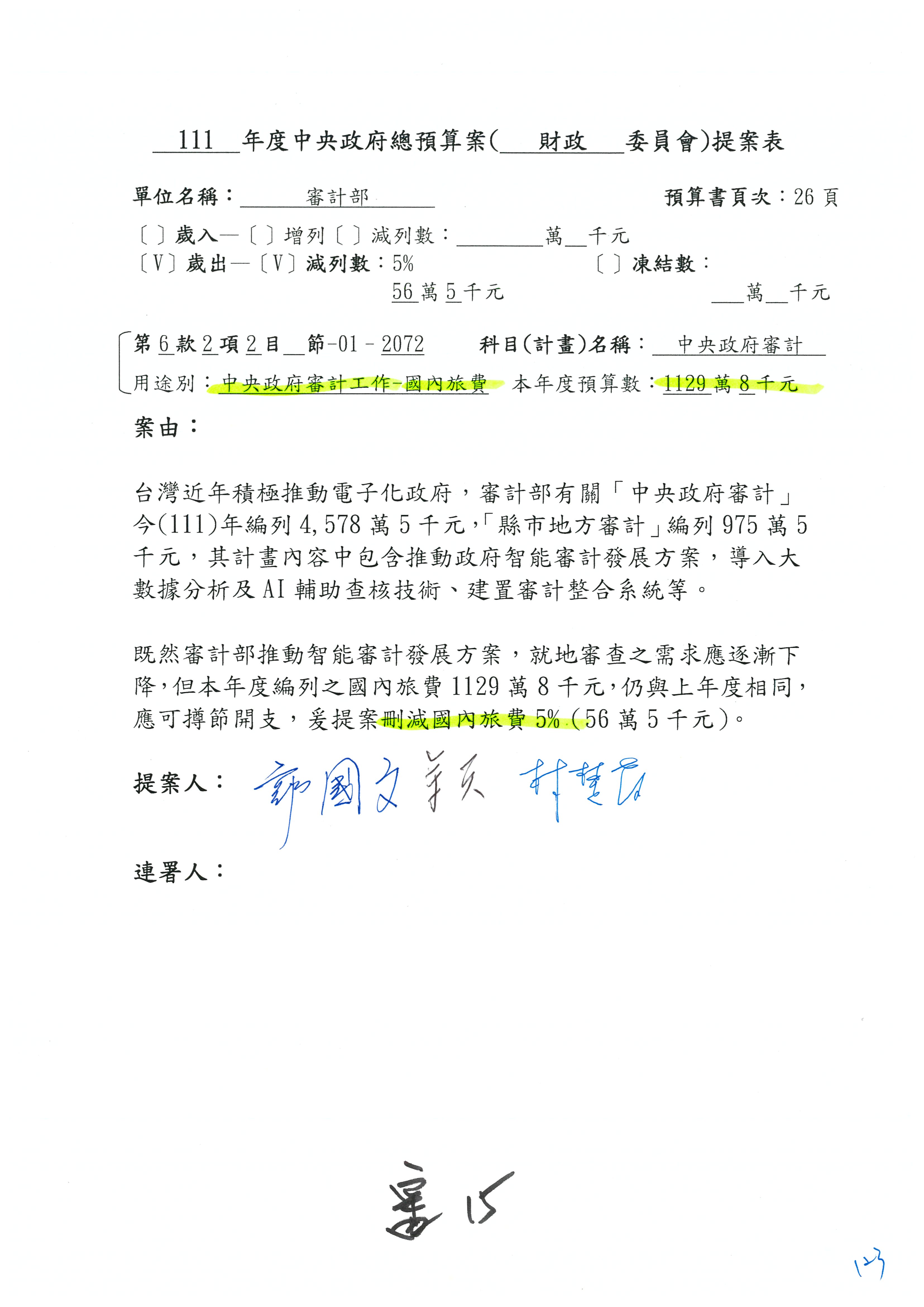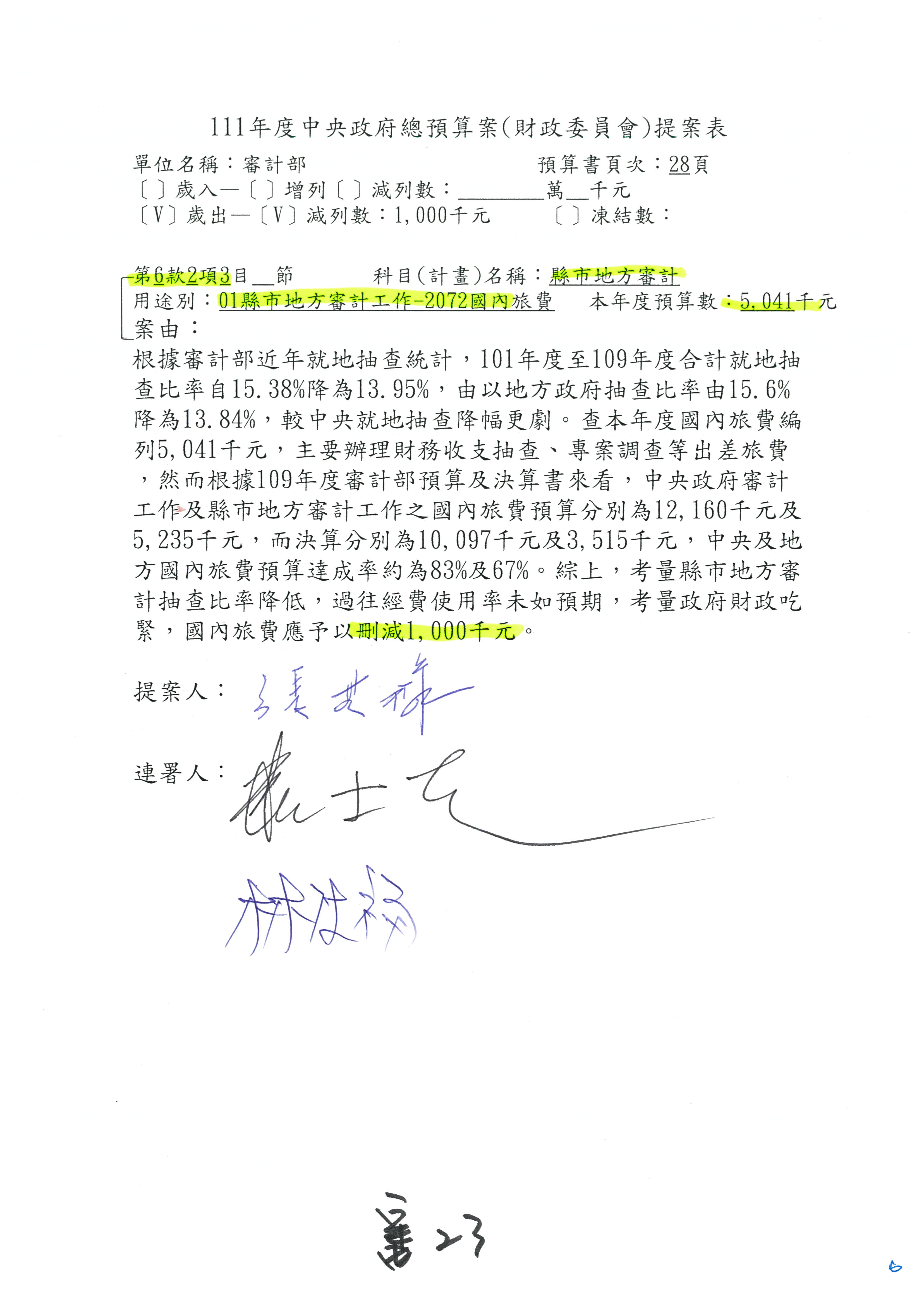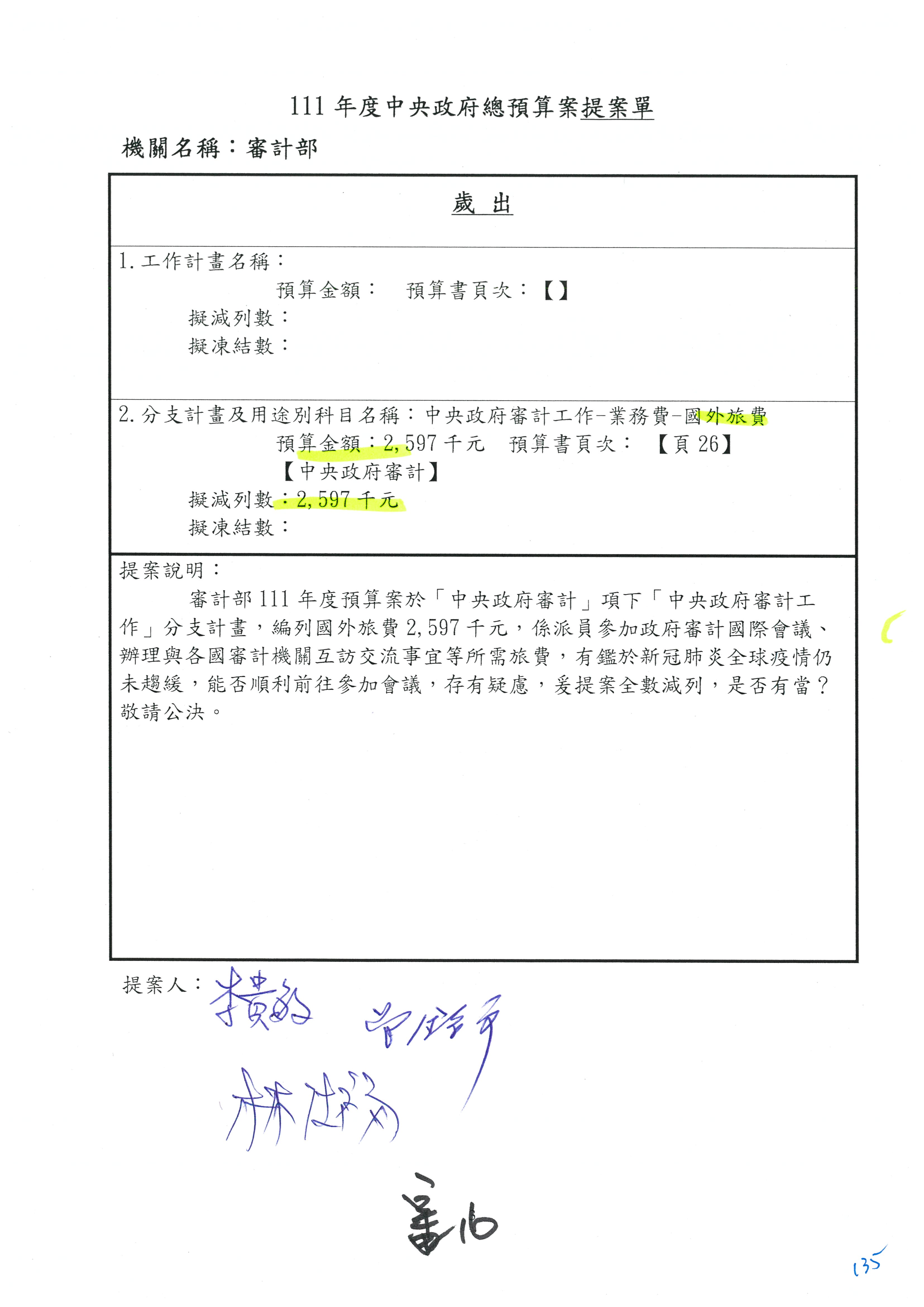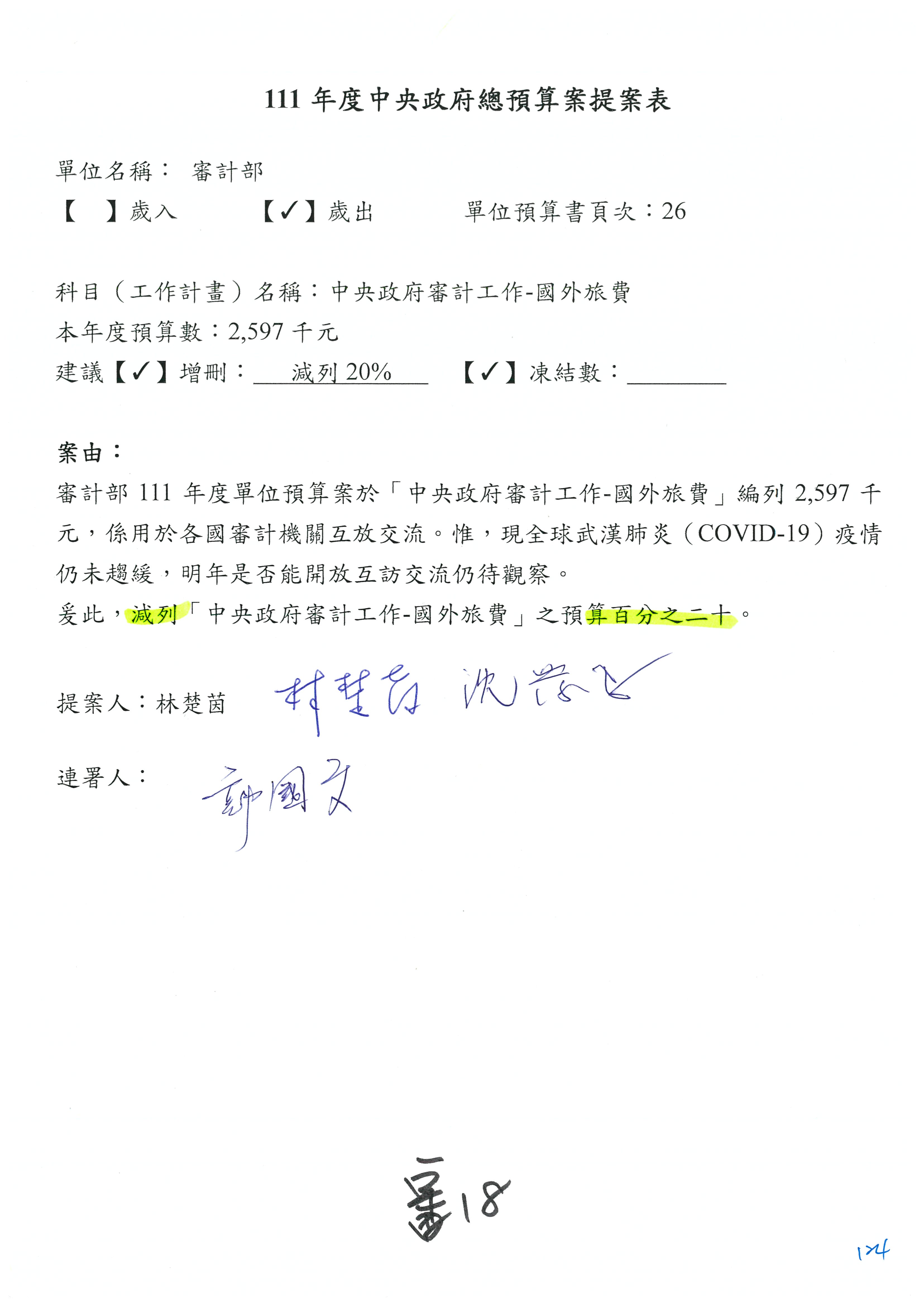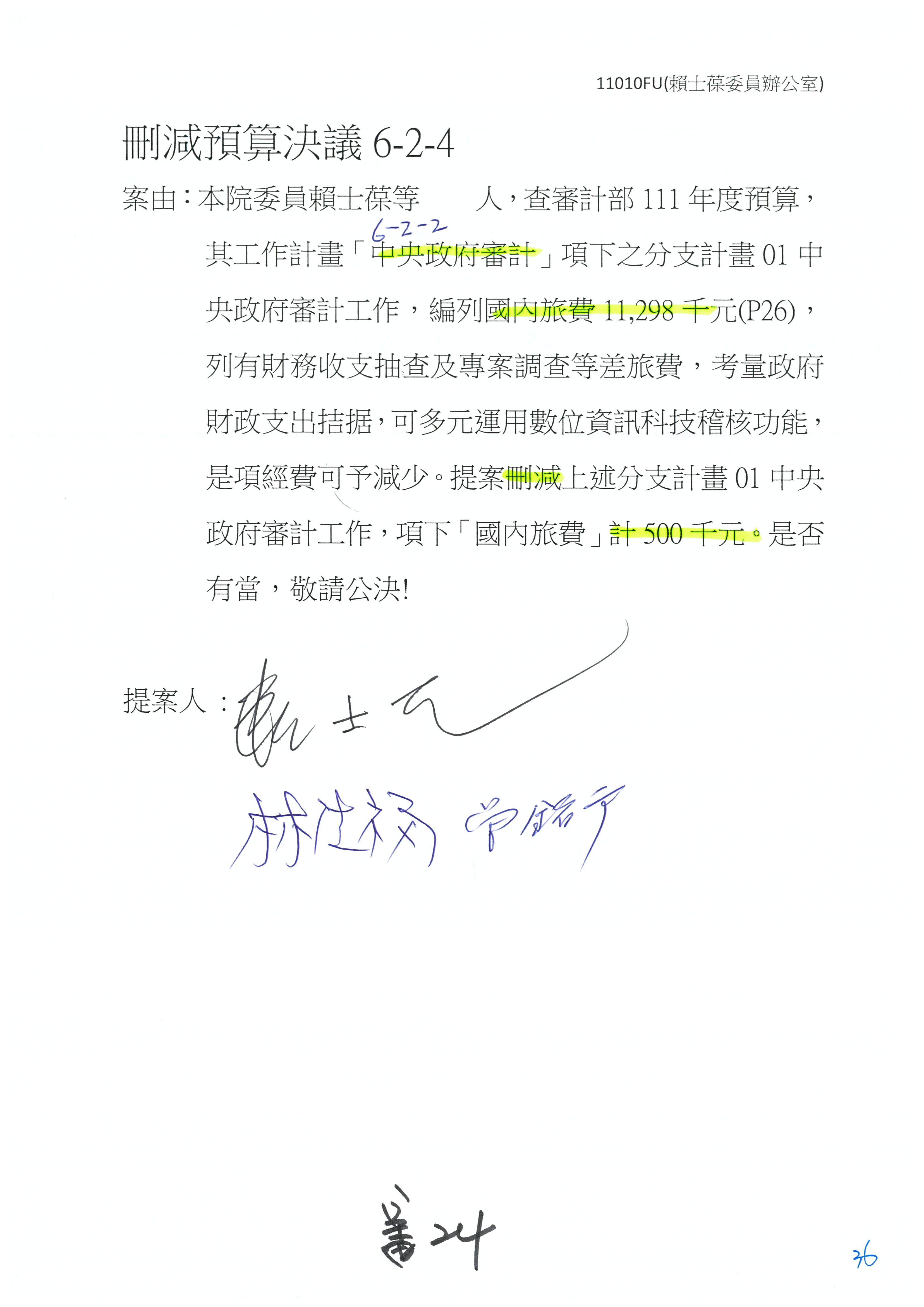 賴委員士葆:國民黨團有關於審計部國內旅費的部分,我們要求他多做審計,所以我們要刪減的都撤案,請你們處理。