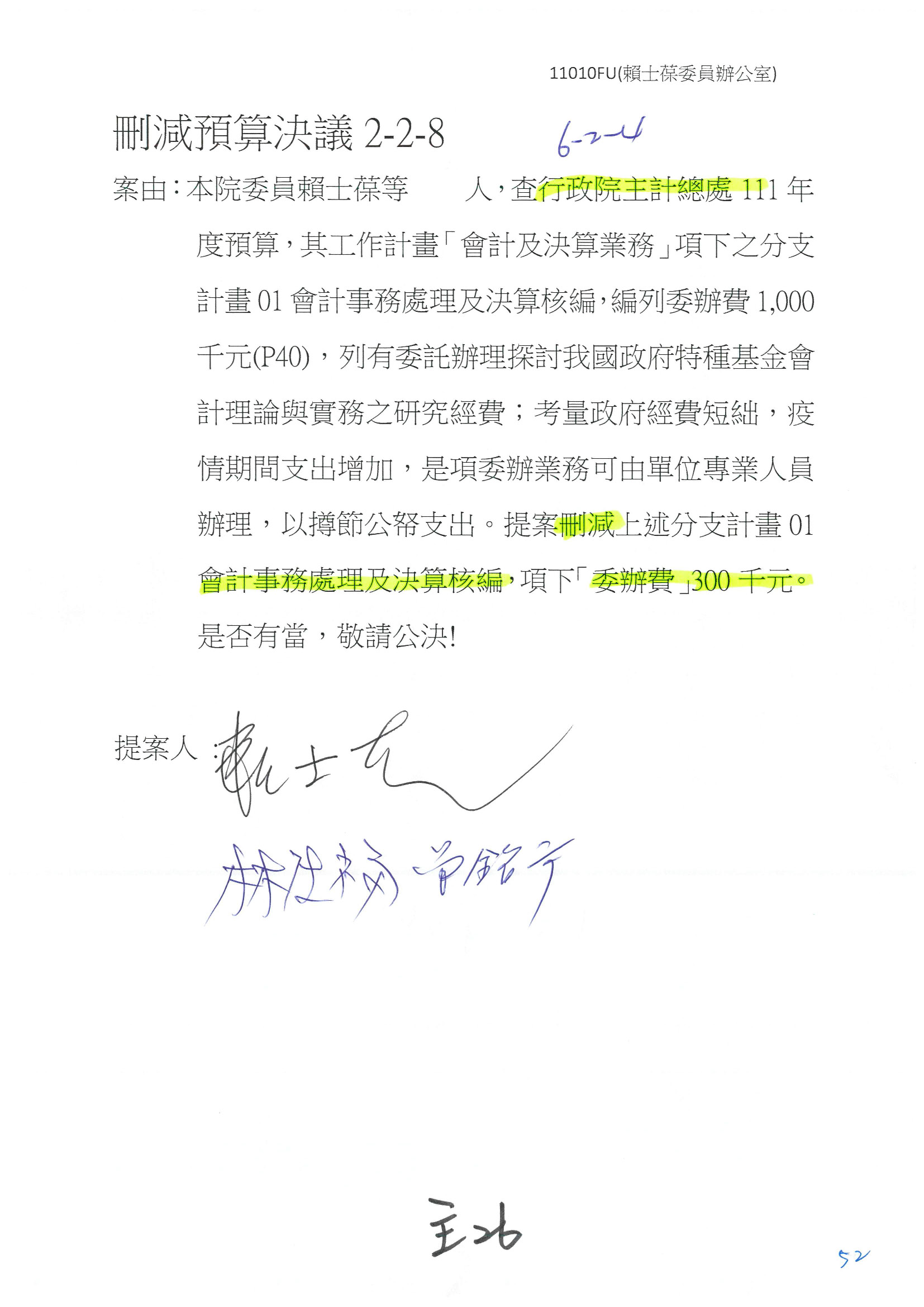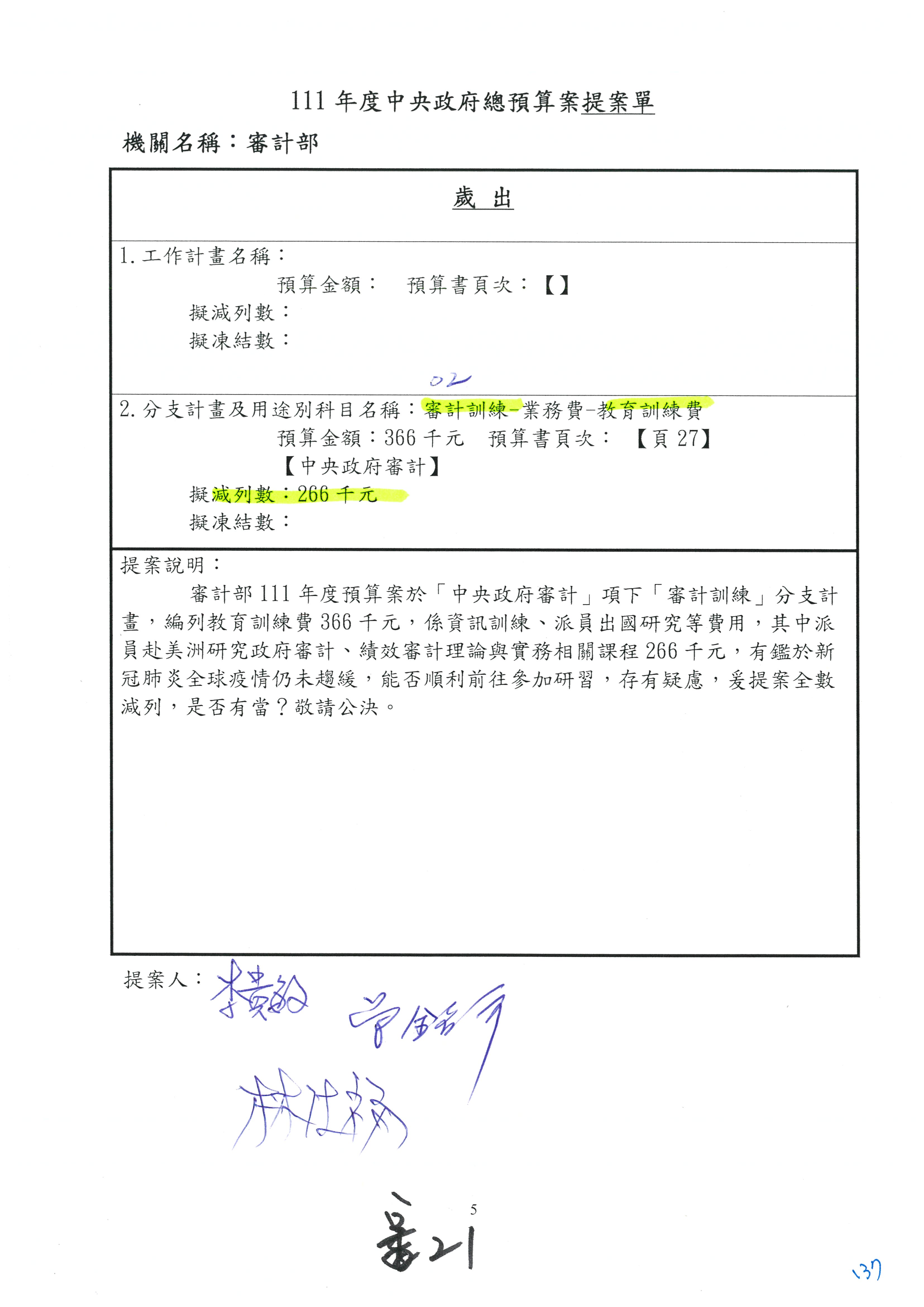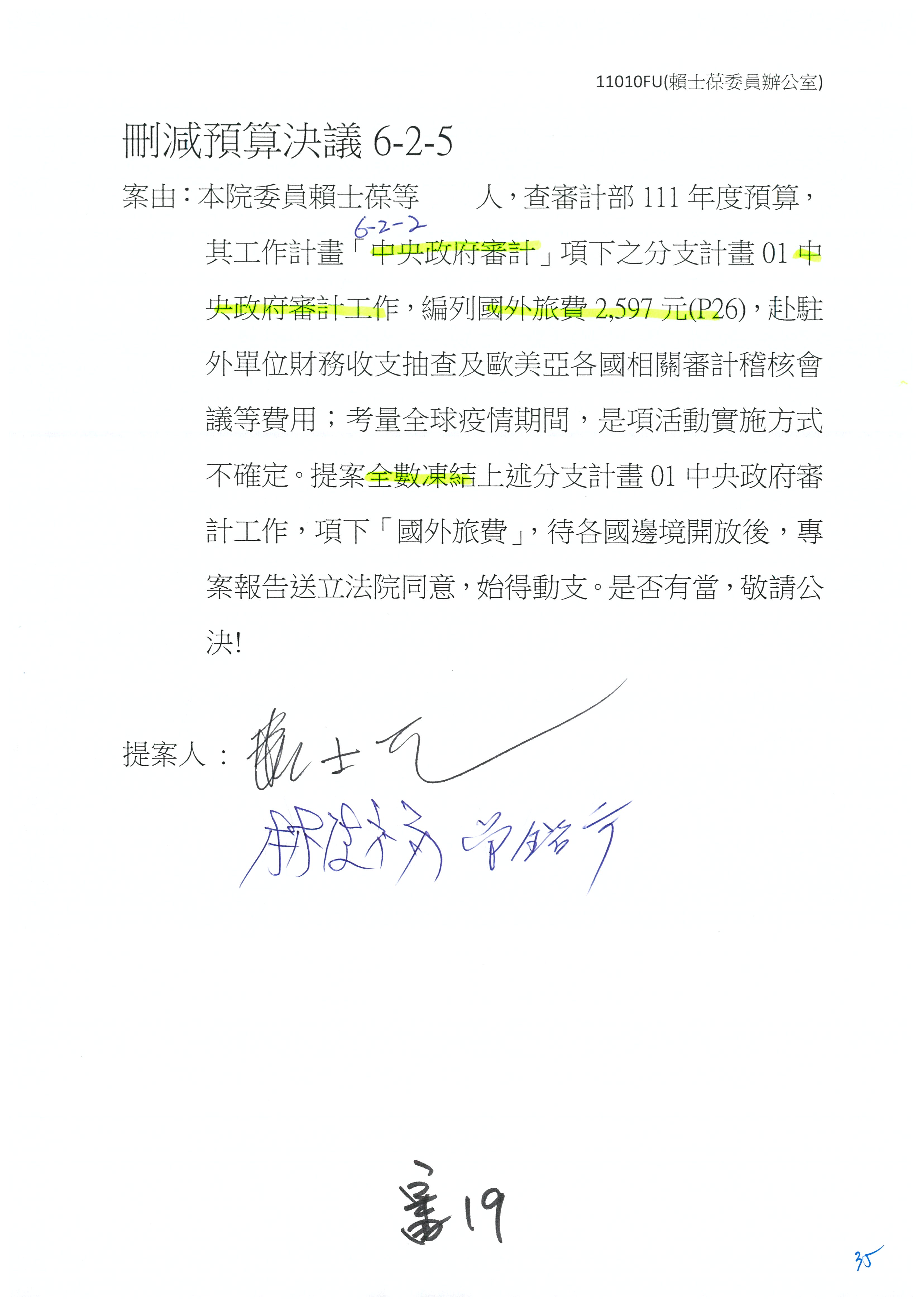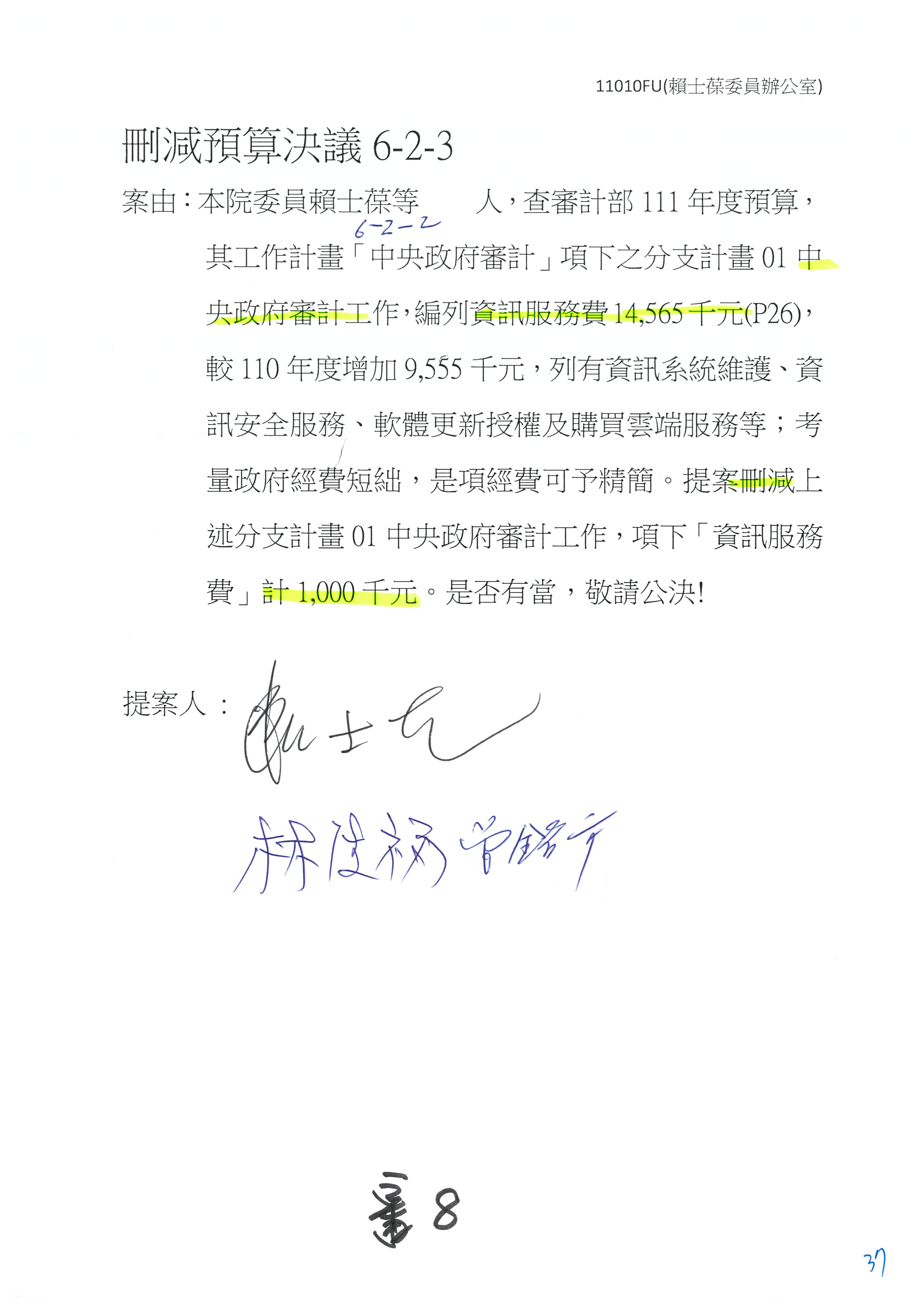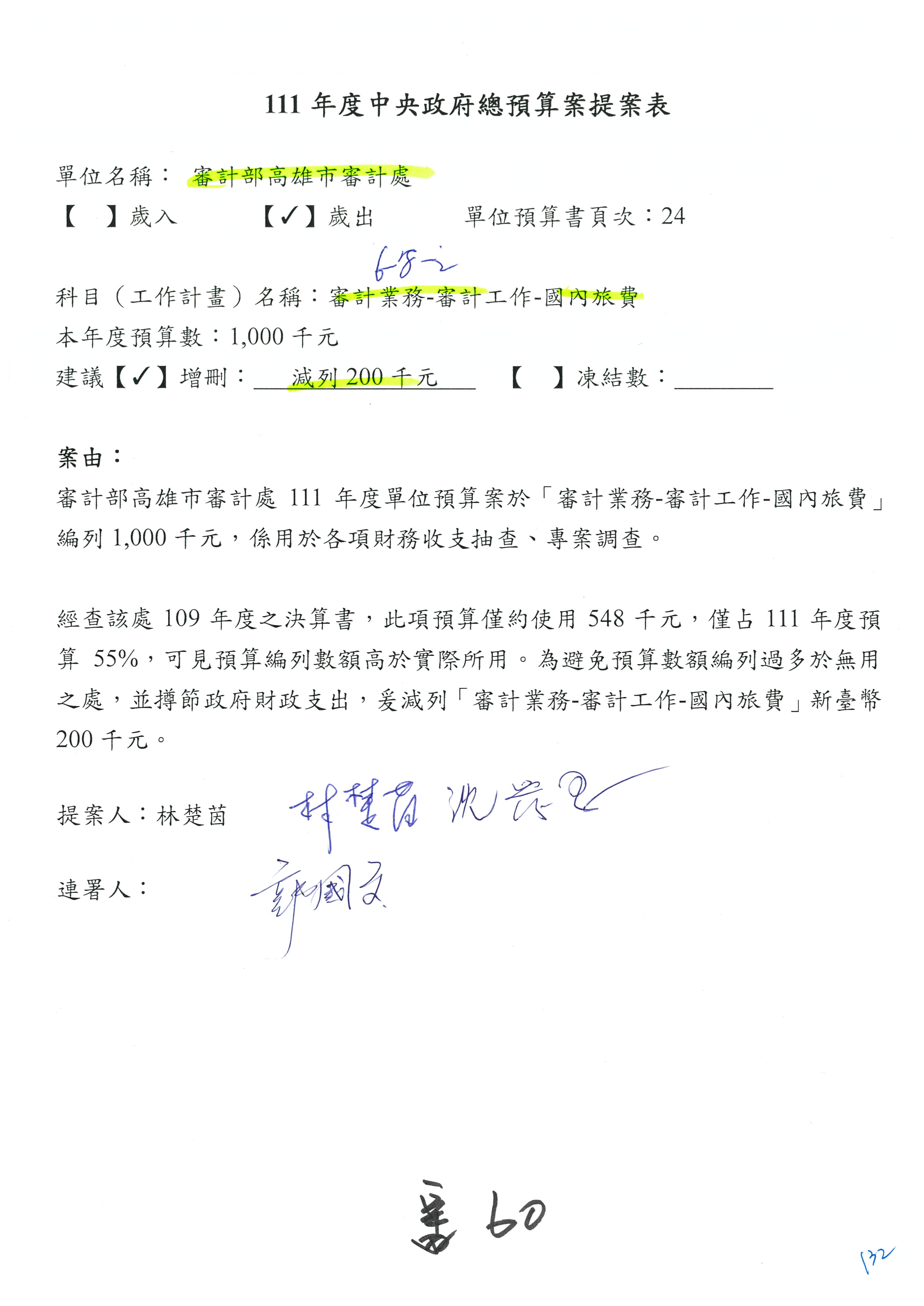 賴委員士葆:國民黨團有關於審計部國內旅費的部分,我們要求他多做審計,所以我們要刪減的都撤案,請你們處理。