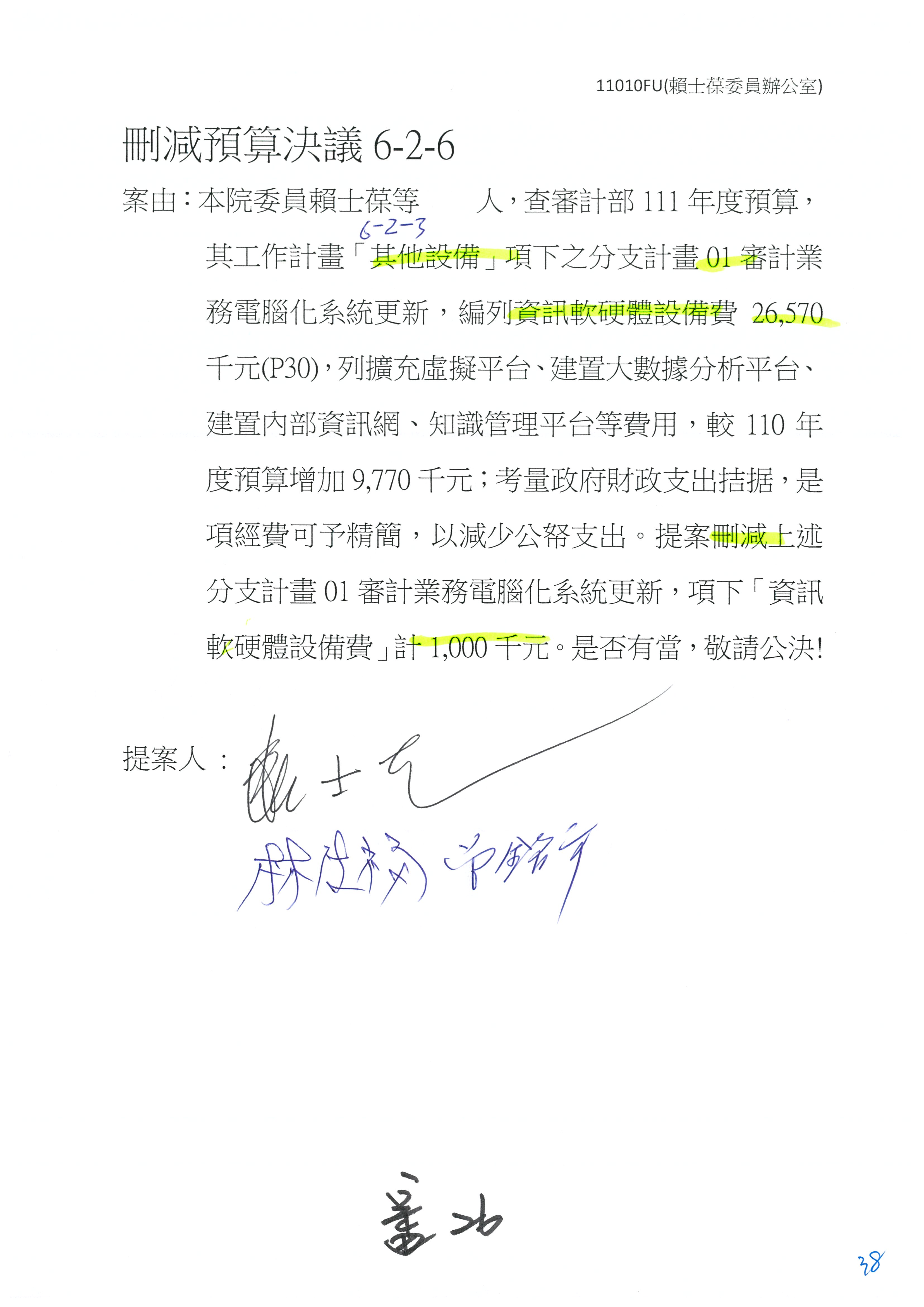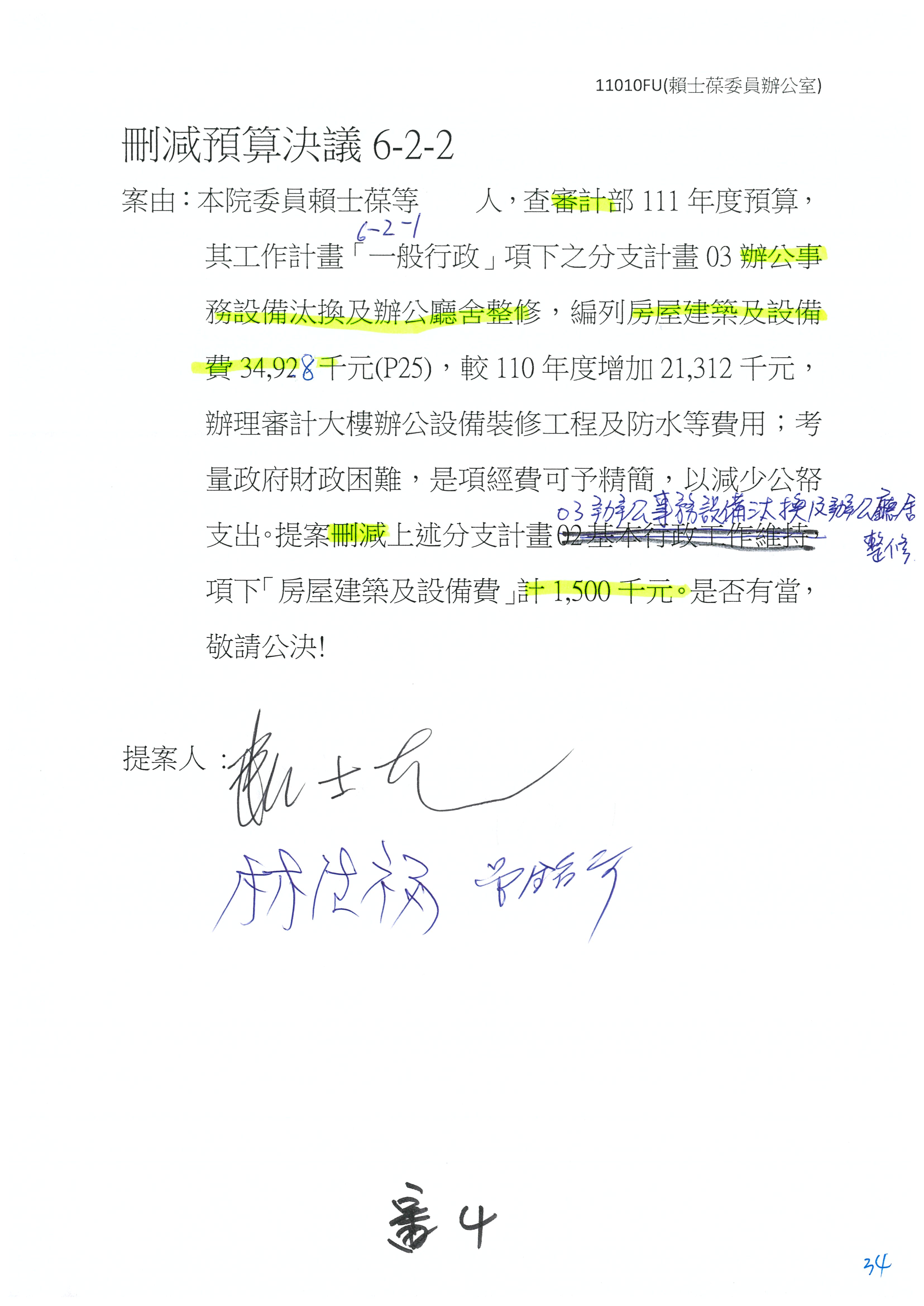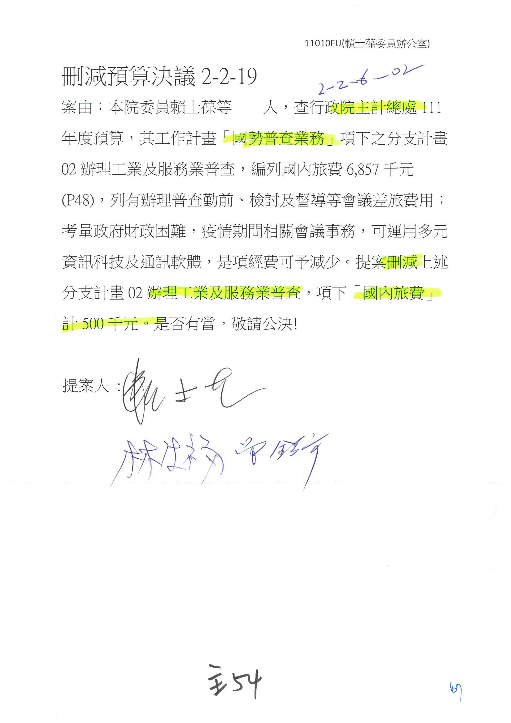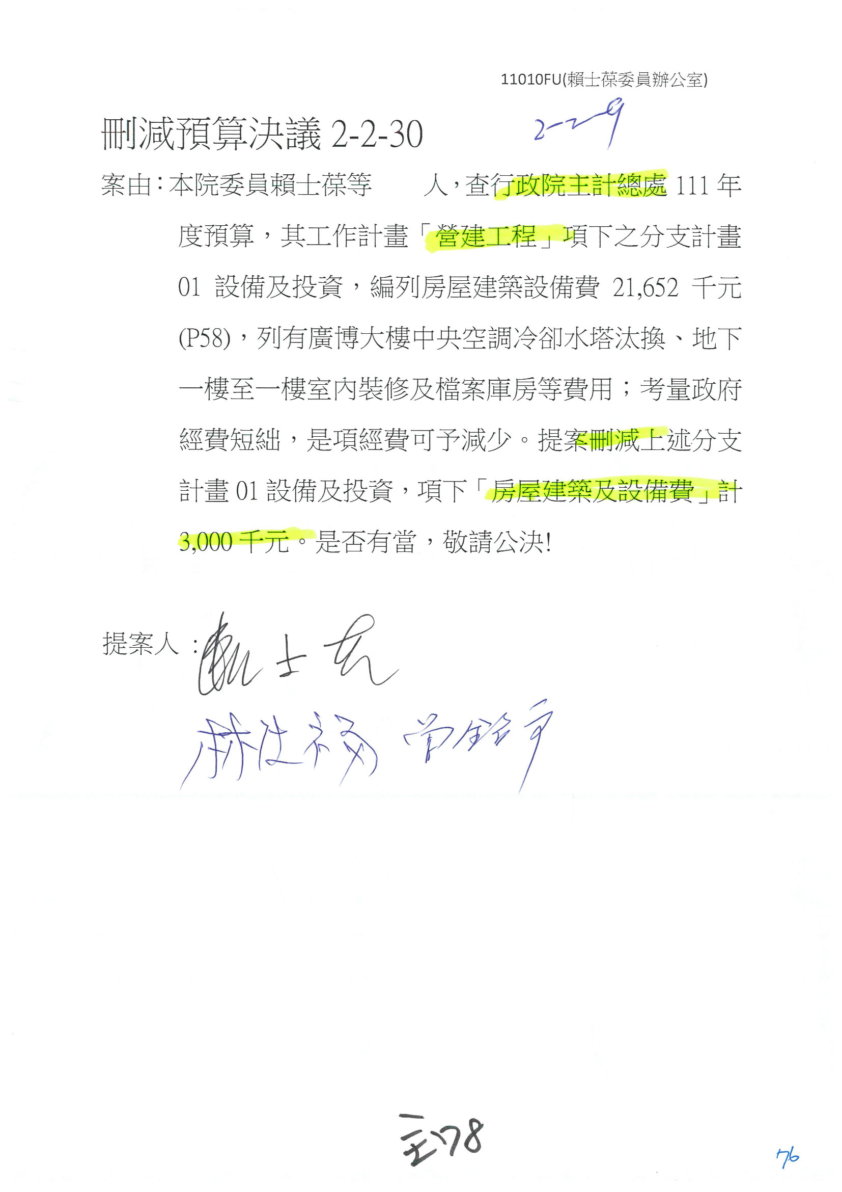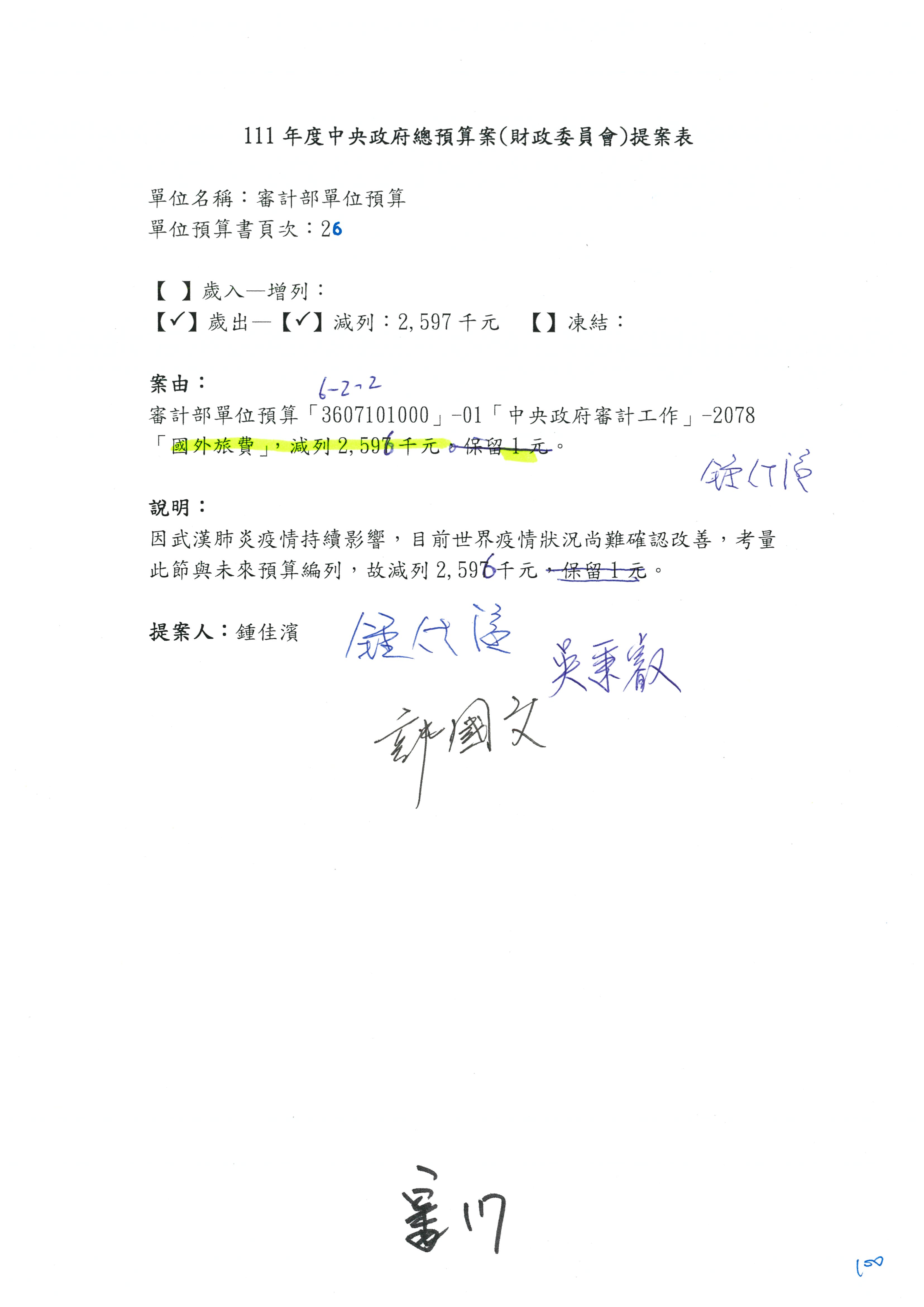 賴委員士葆:國民黨團有關於審計部國內旅費的部分,我們要求他多做審計,所以我們要刪減的都撤案,請你們處理。