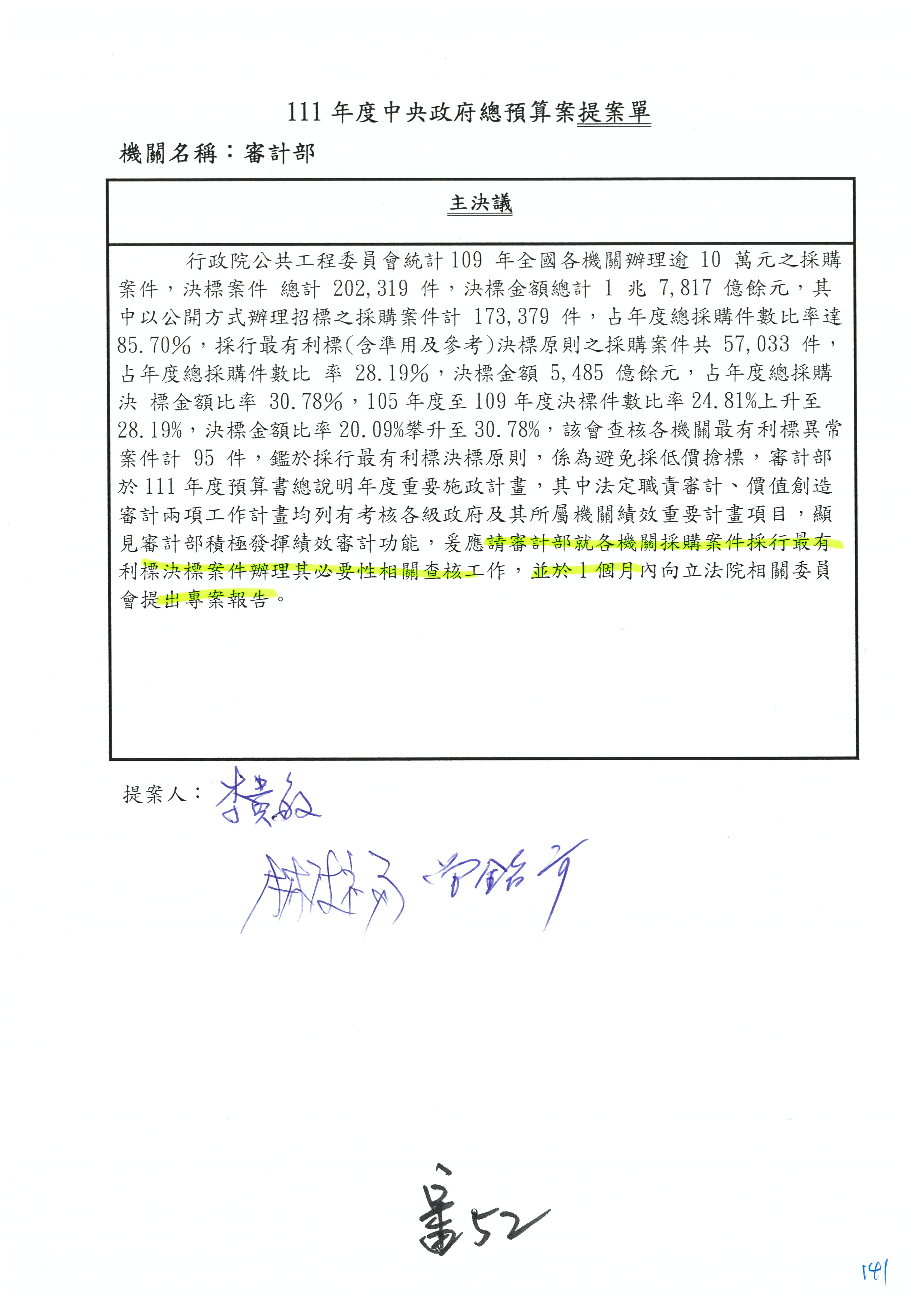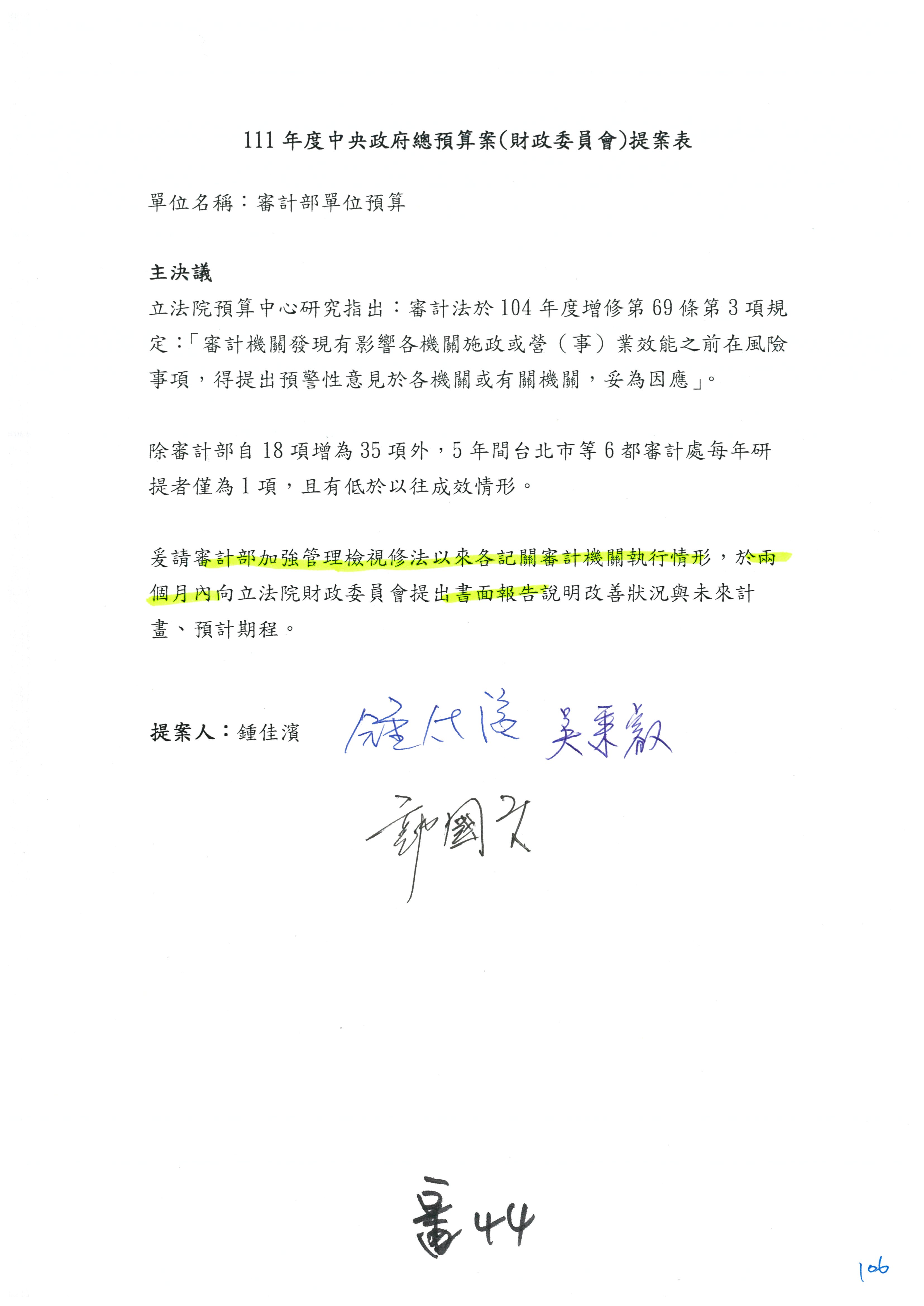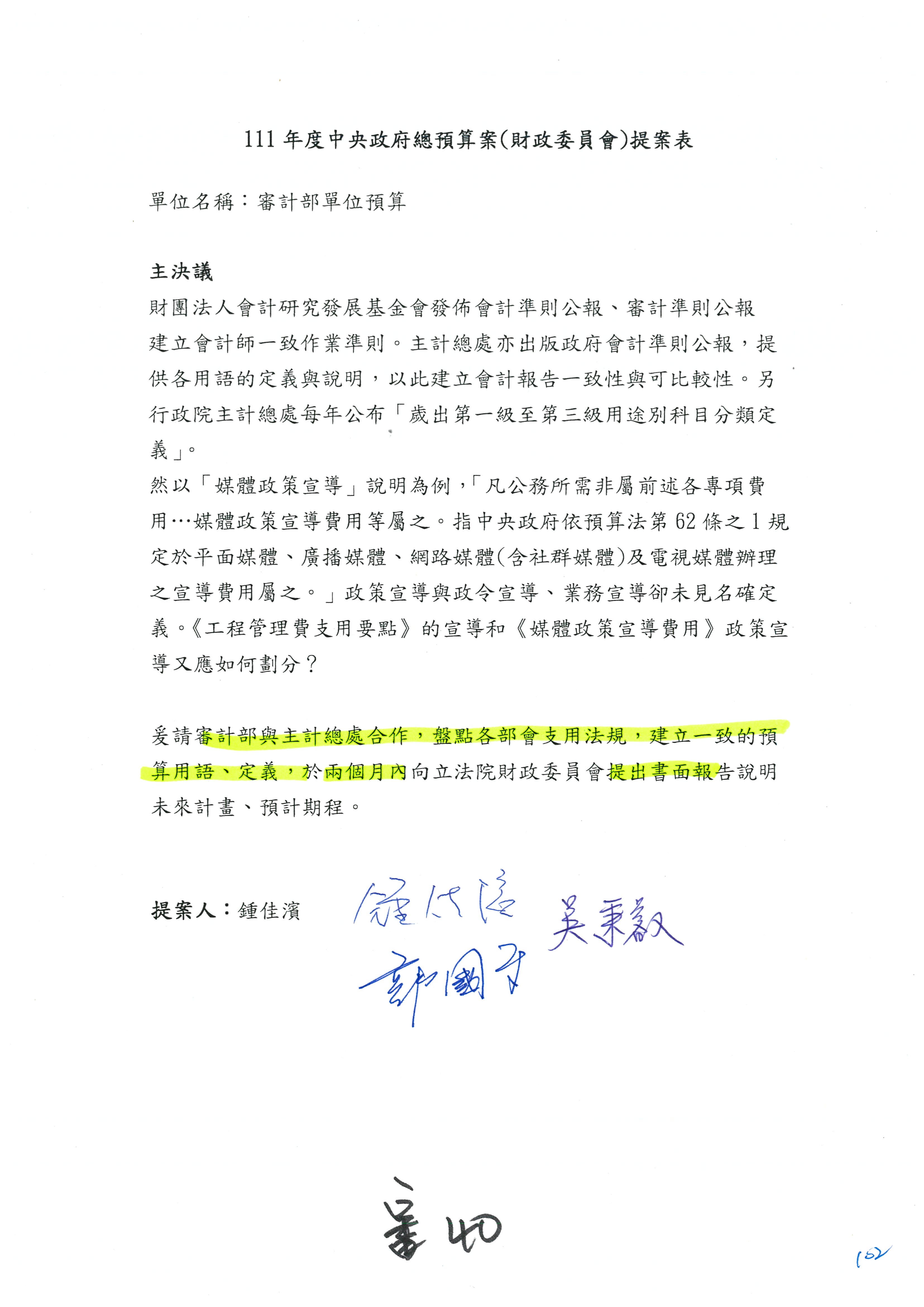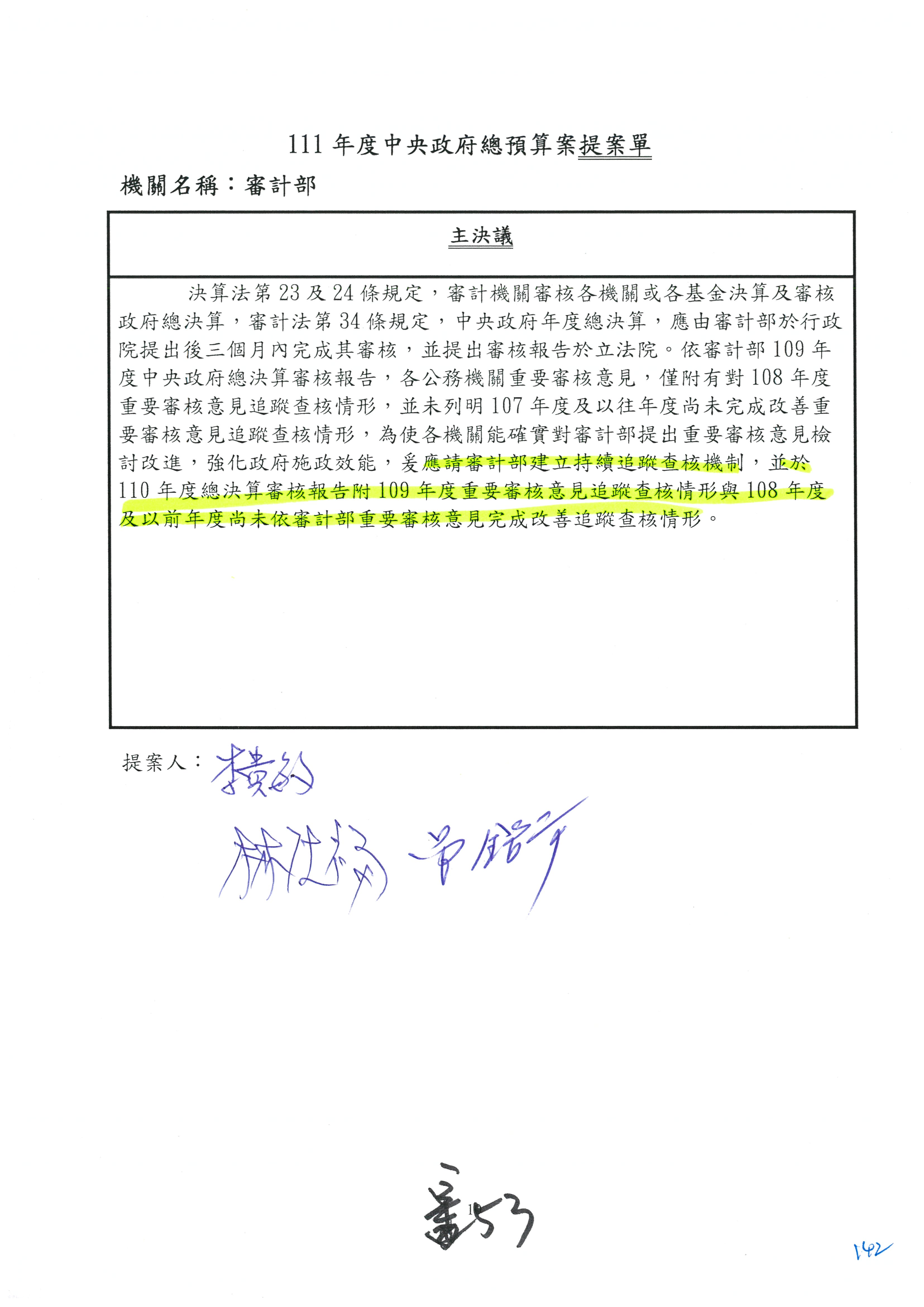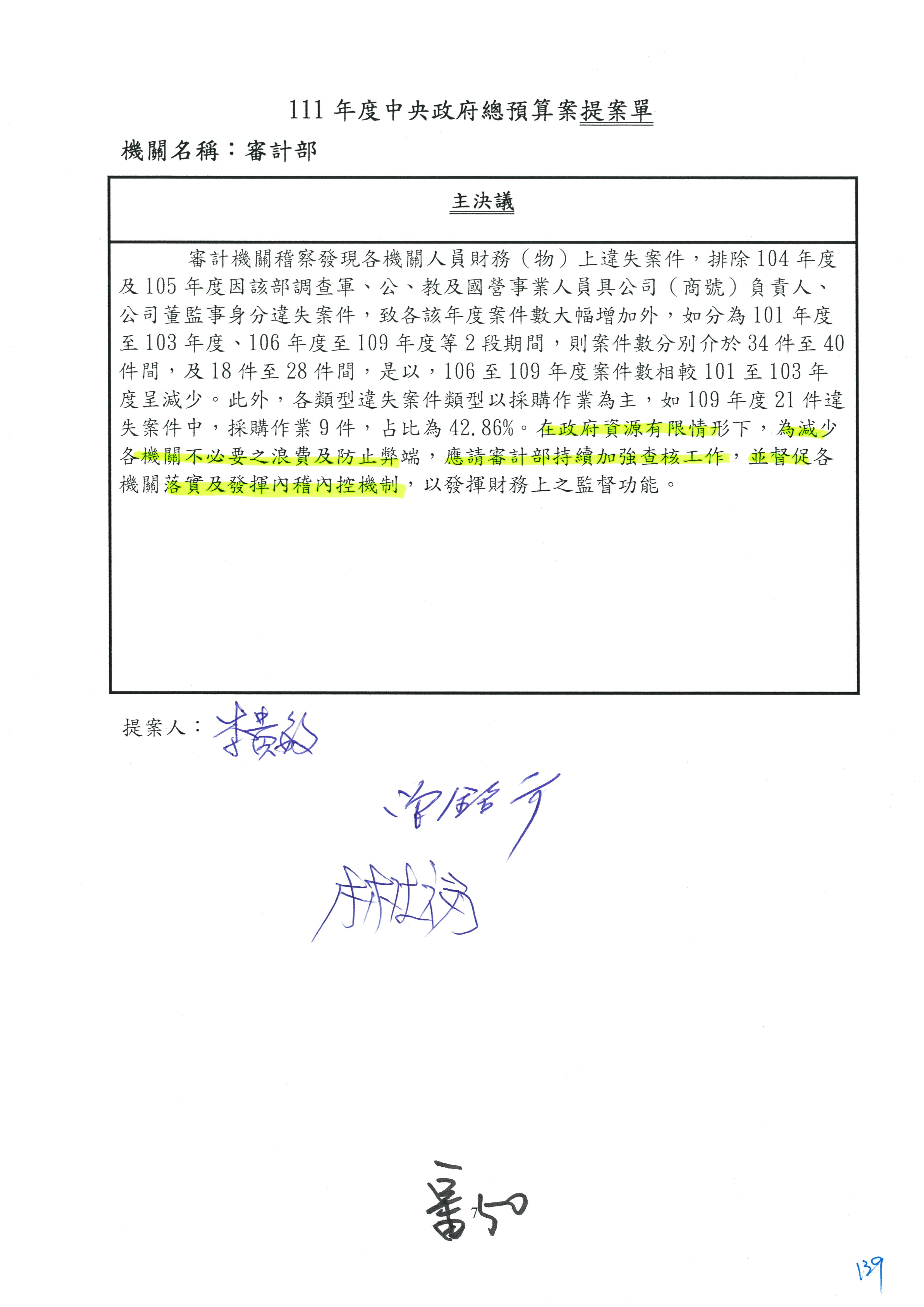 李副審計長順保:跟委員報告,倒數第三行後段文字建議修正為「爰應請審計部就109年度中央機關」,以下文字都一樣,最後一句話建議改成「提出書面報告」。