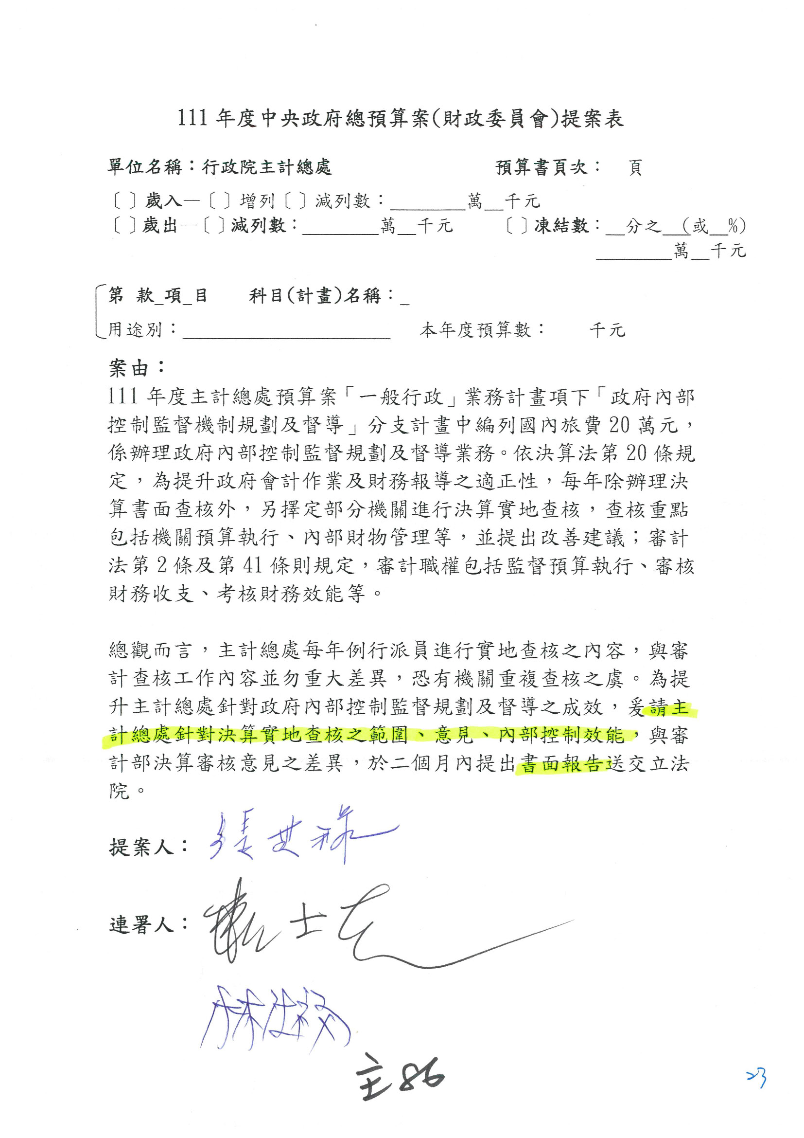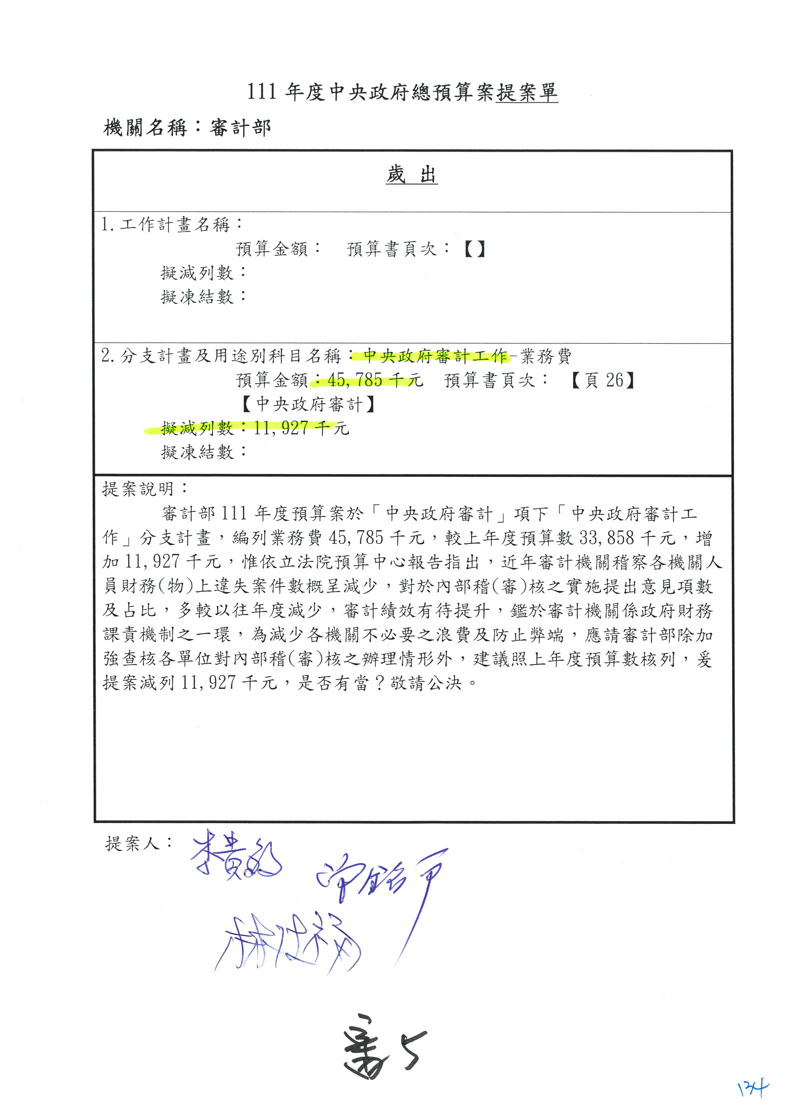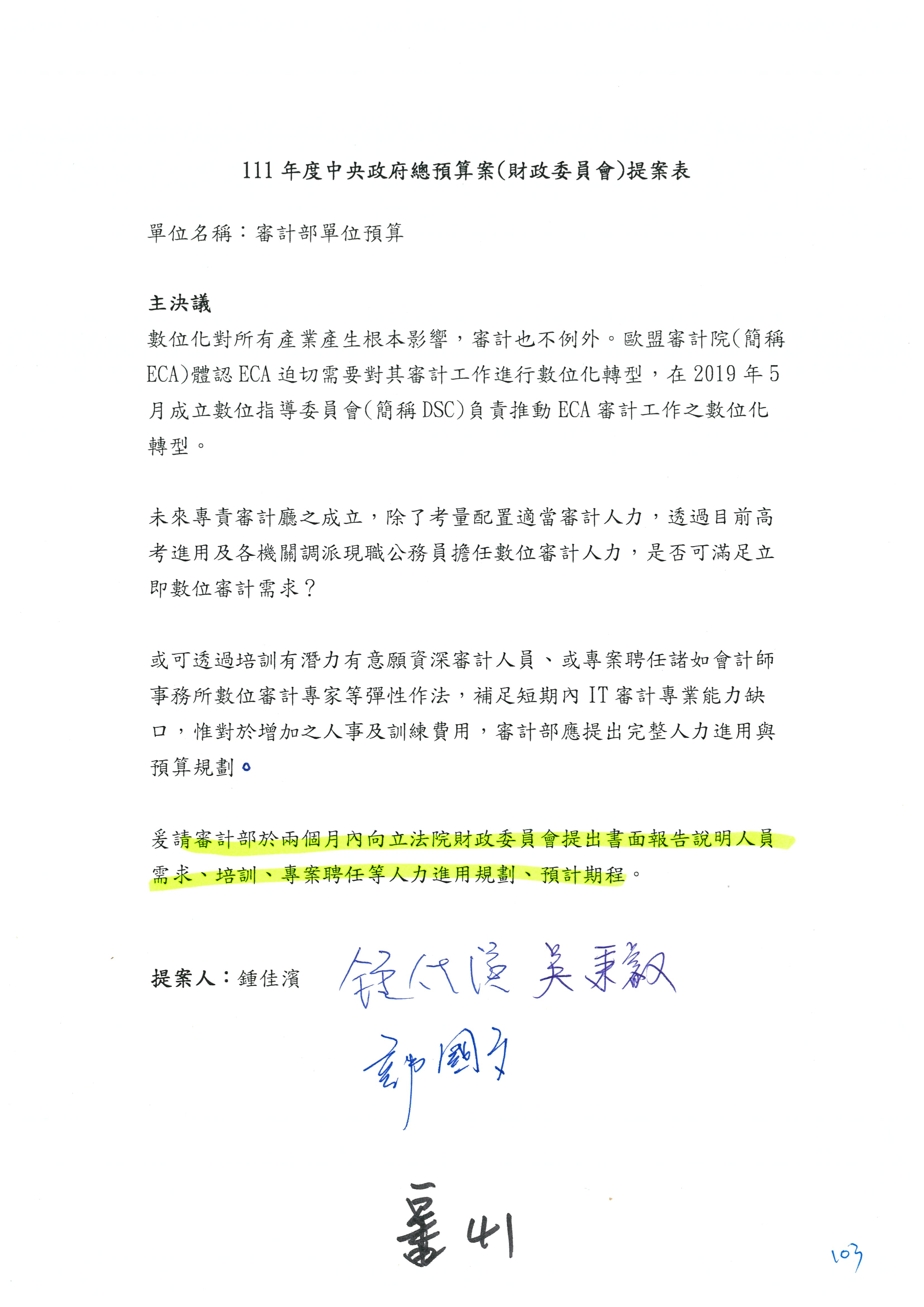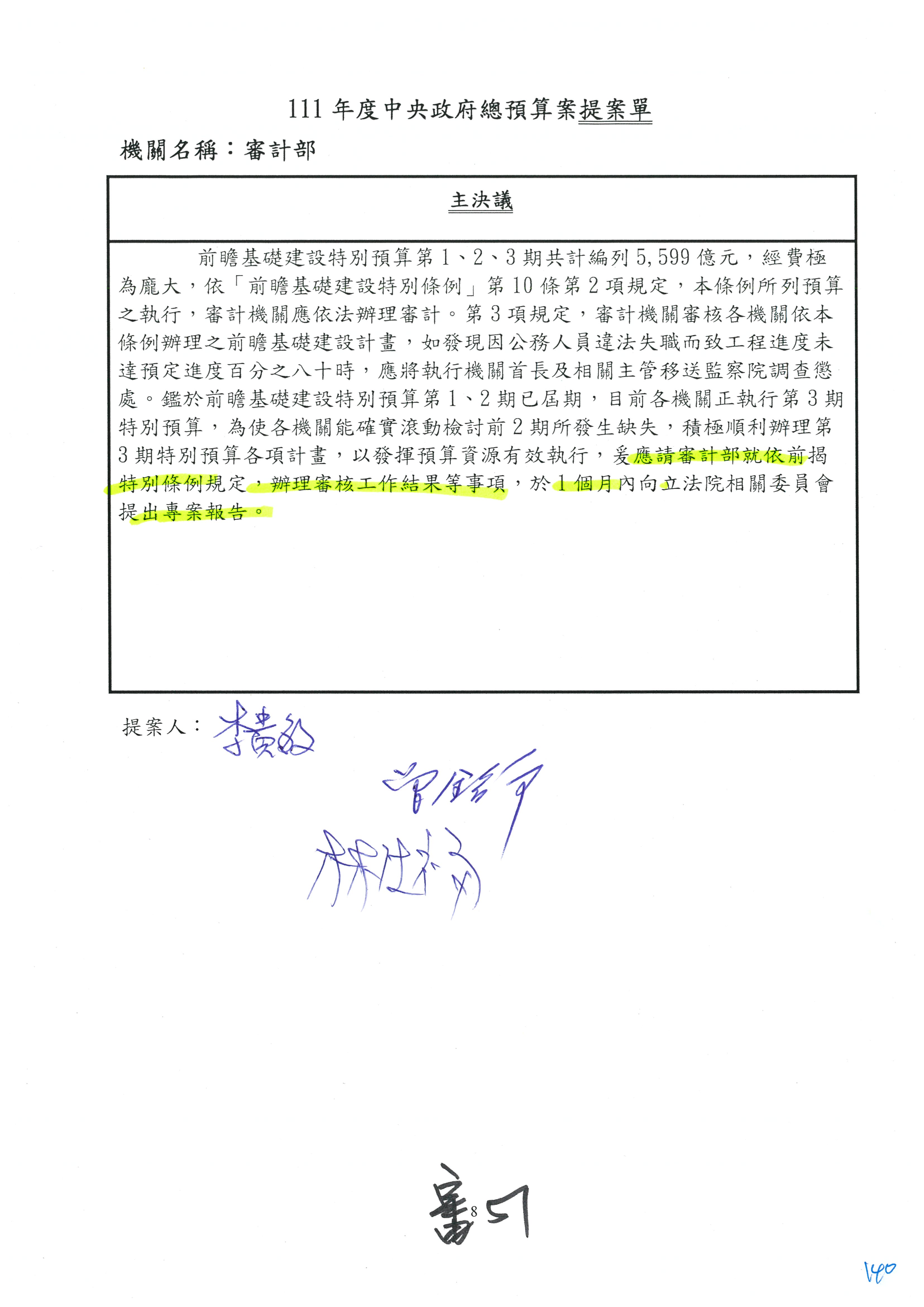 李副審計長順保:跟委員報告,倒數第三行後段文字建議修正為「爰應請審計部就109年度中央機關」,以下文字都一樣,最後一句話建議改成「提出書面報告」。