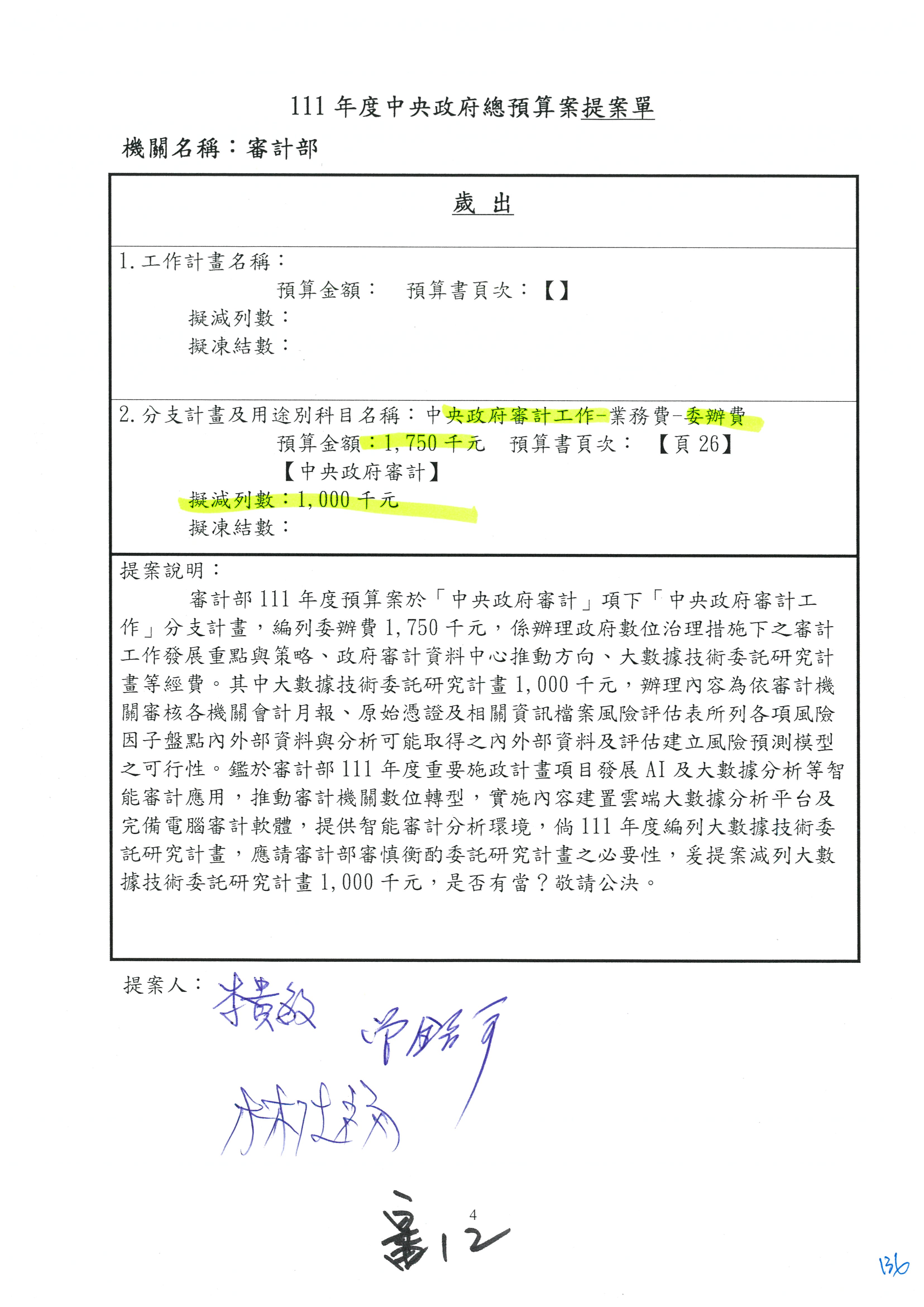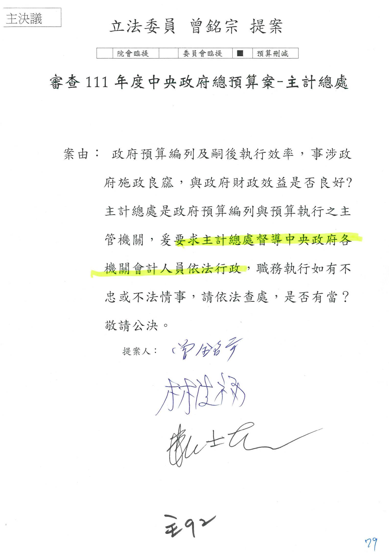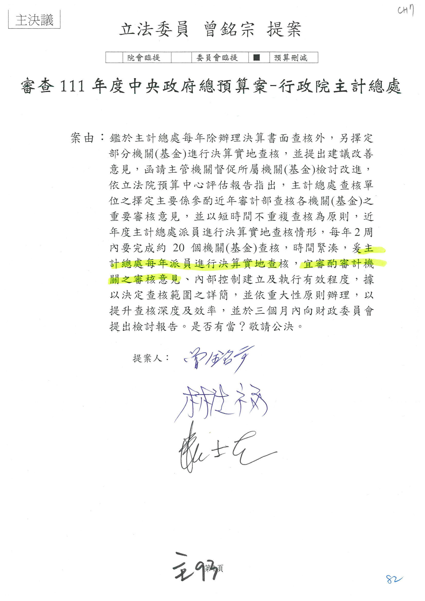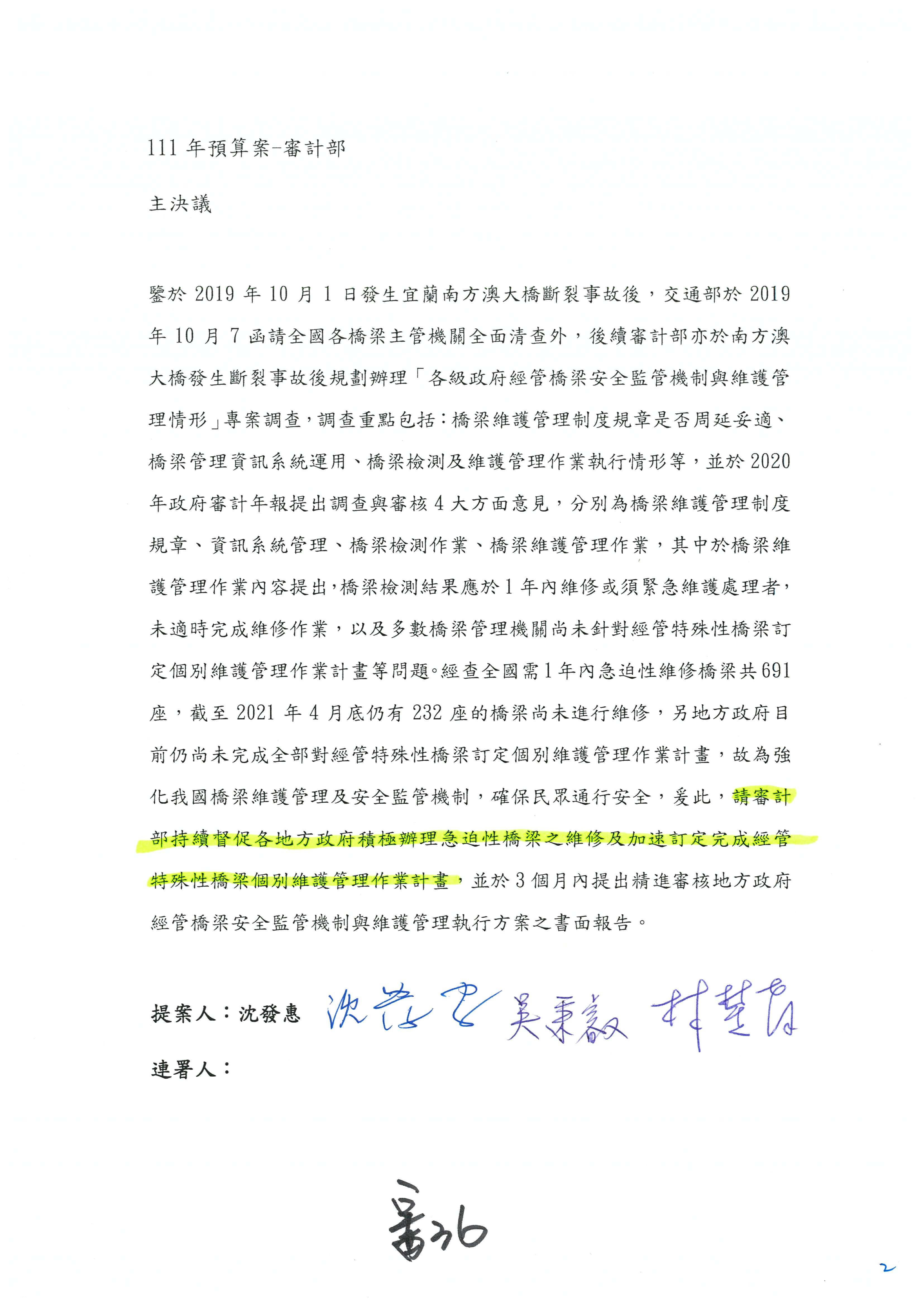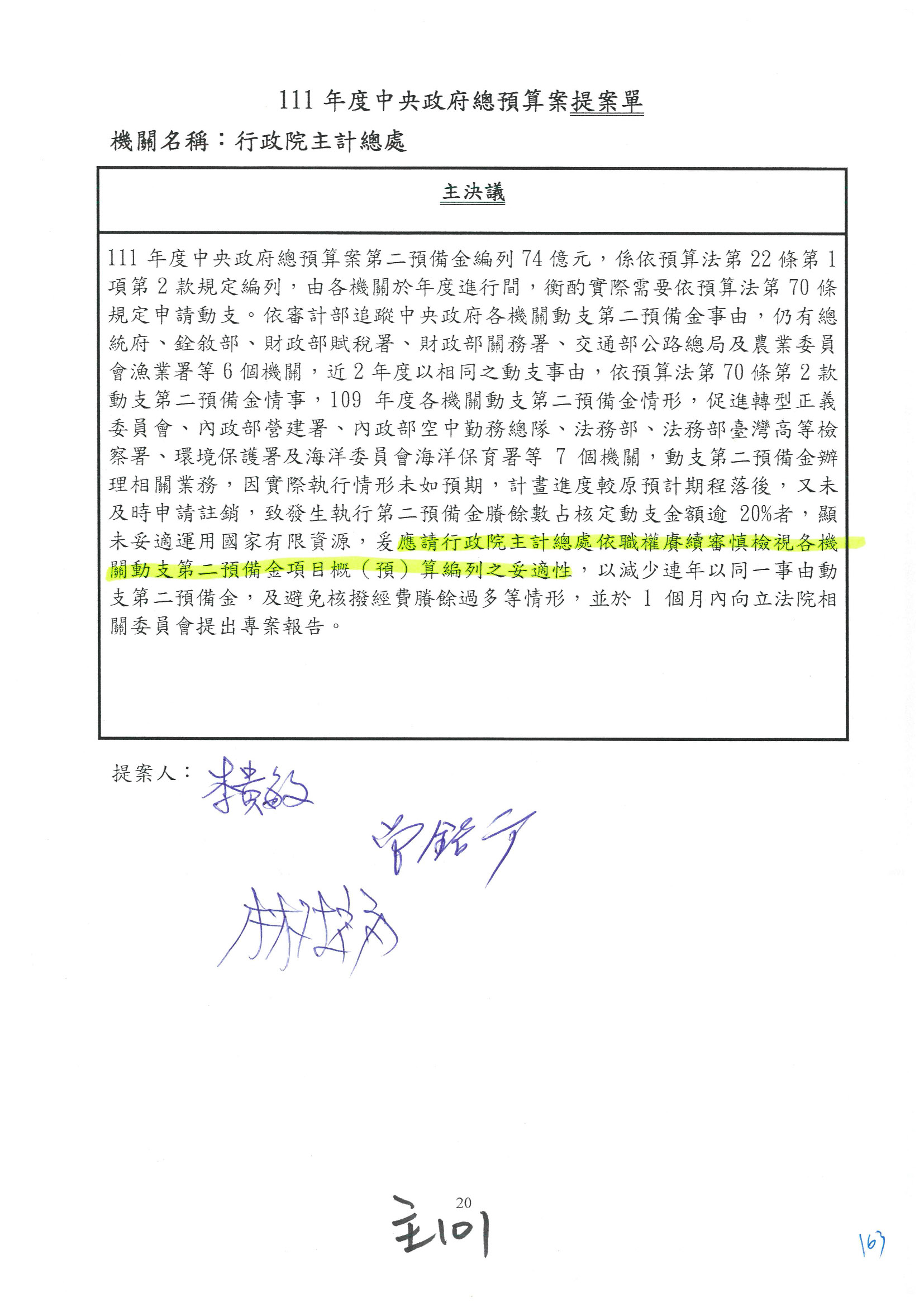 李副審計長順保:跟委員報告,倒數第三行後段文字建議修正為「爰應請審計部就109年度中央機關」,以下文字都一樣,最後一句話建議改成「提出書面報告」。