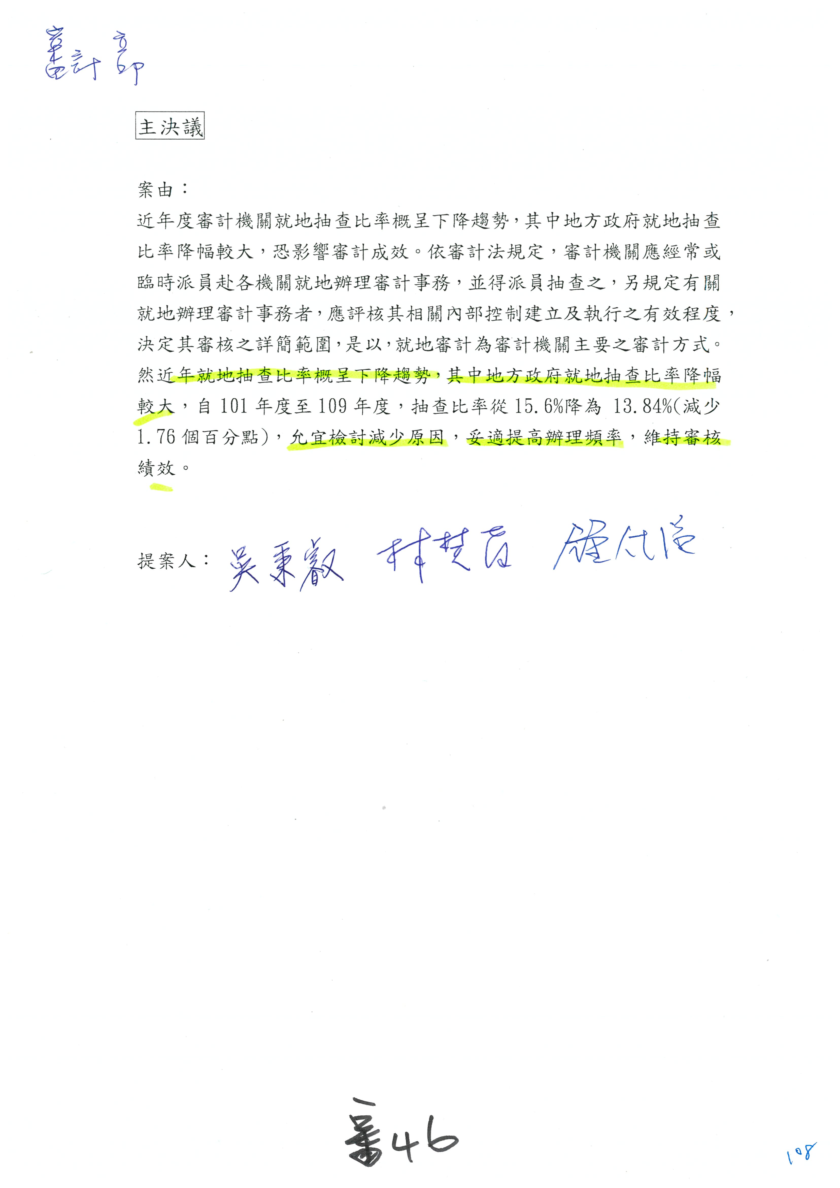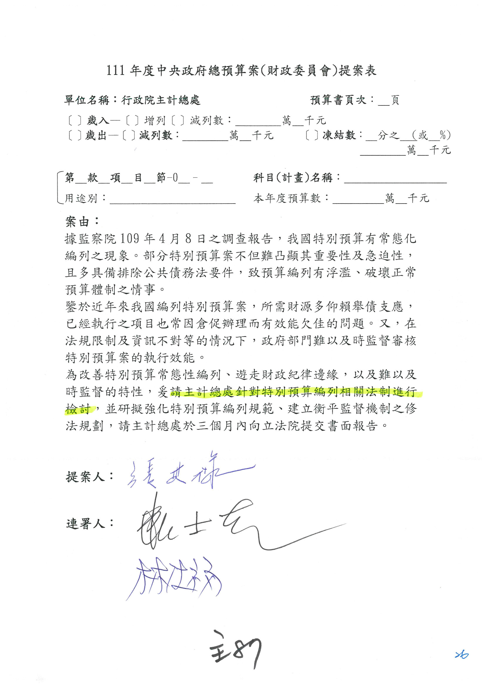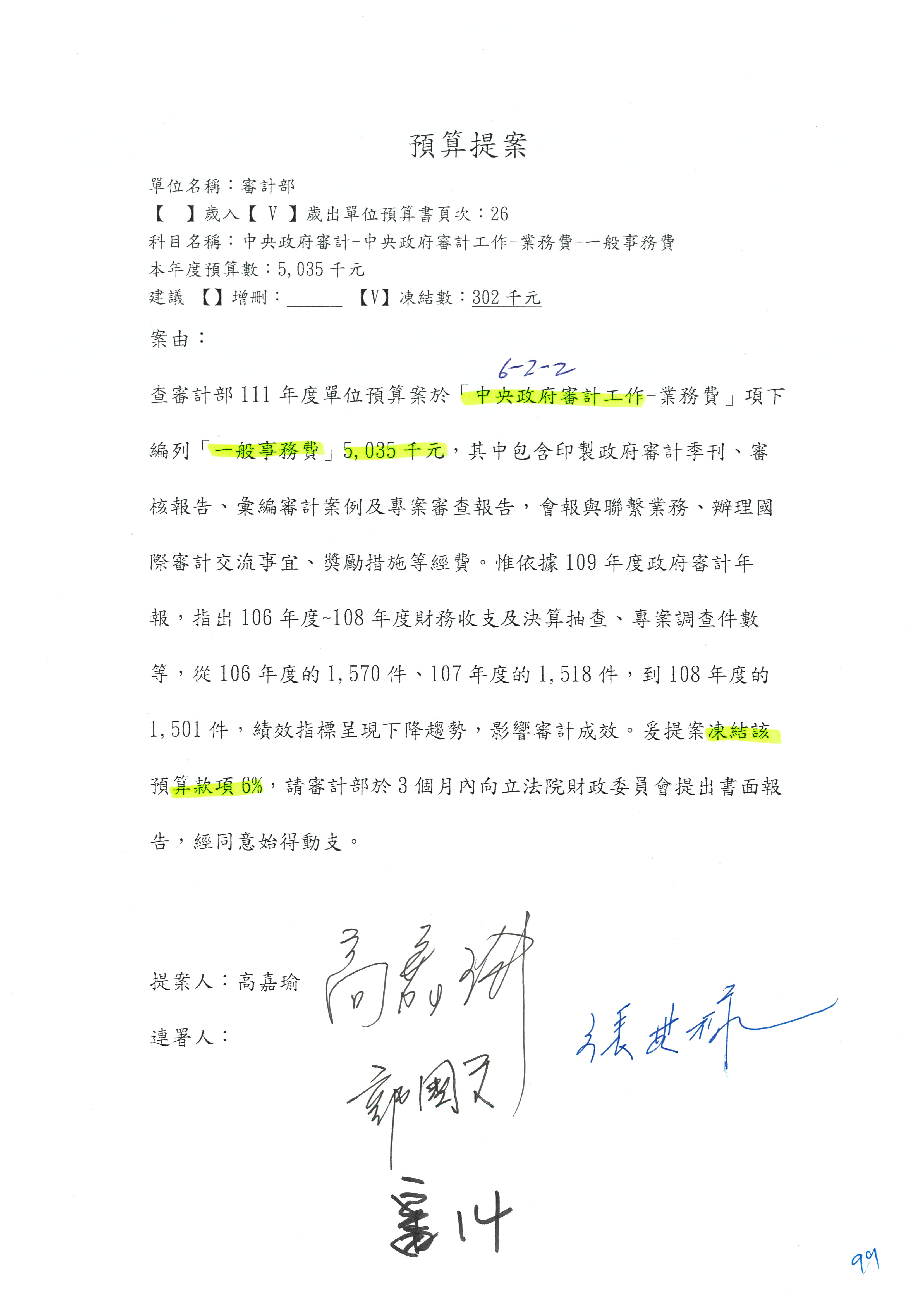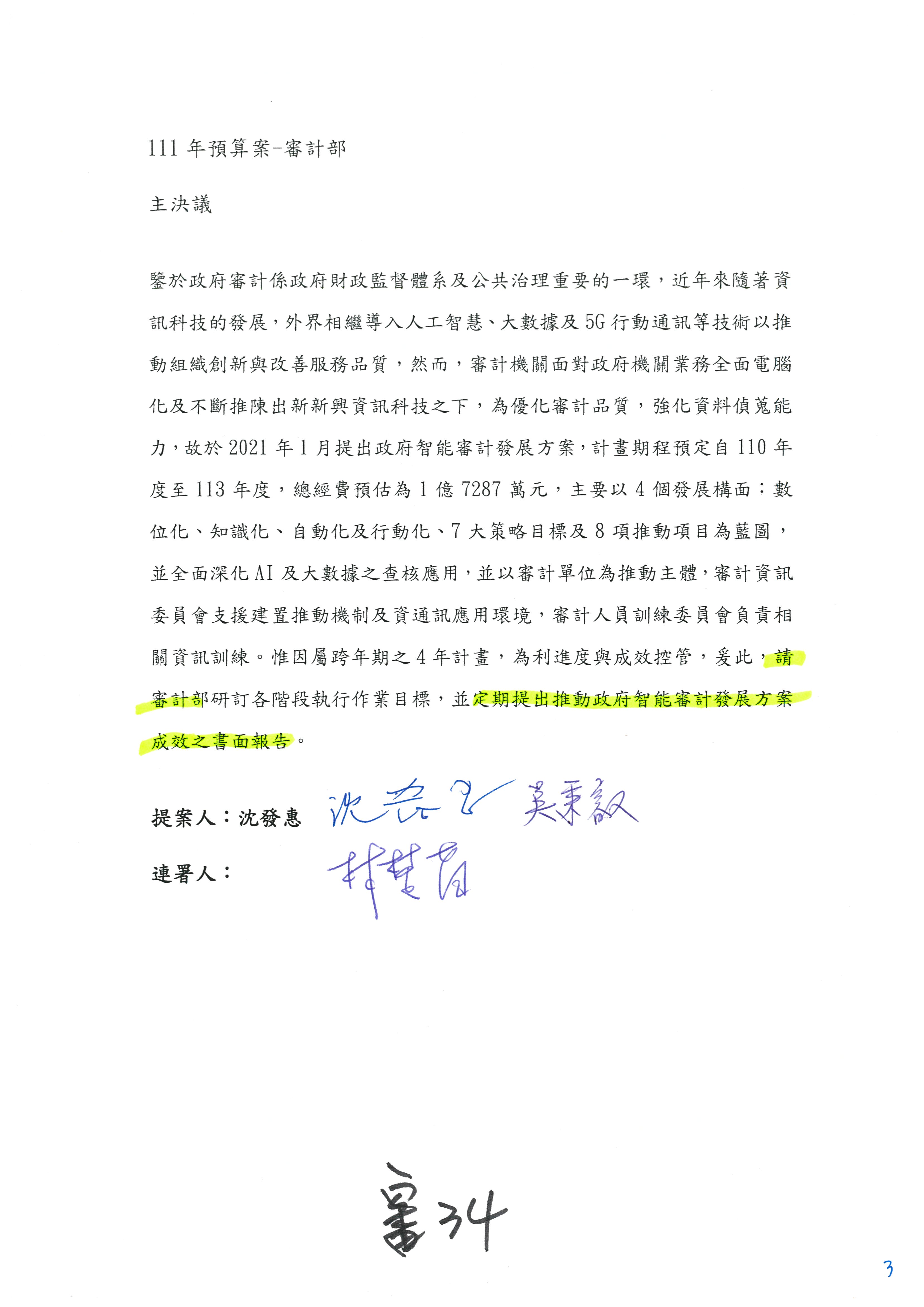 李副審計長順保:跟委員報告,倒數第三行後段文字建議修正為「爰應請審計部就109年度中央機關」,以下文字都一樣,最後一句話建議改成「提出書面報告」。