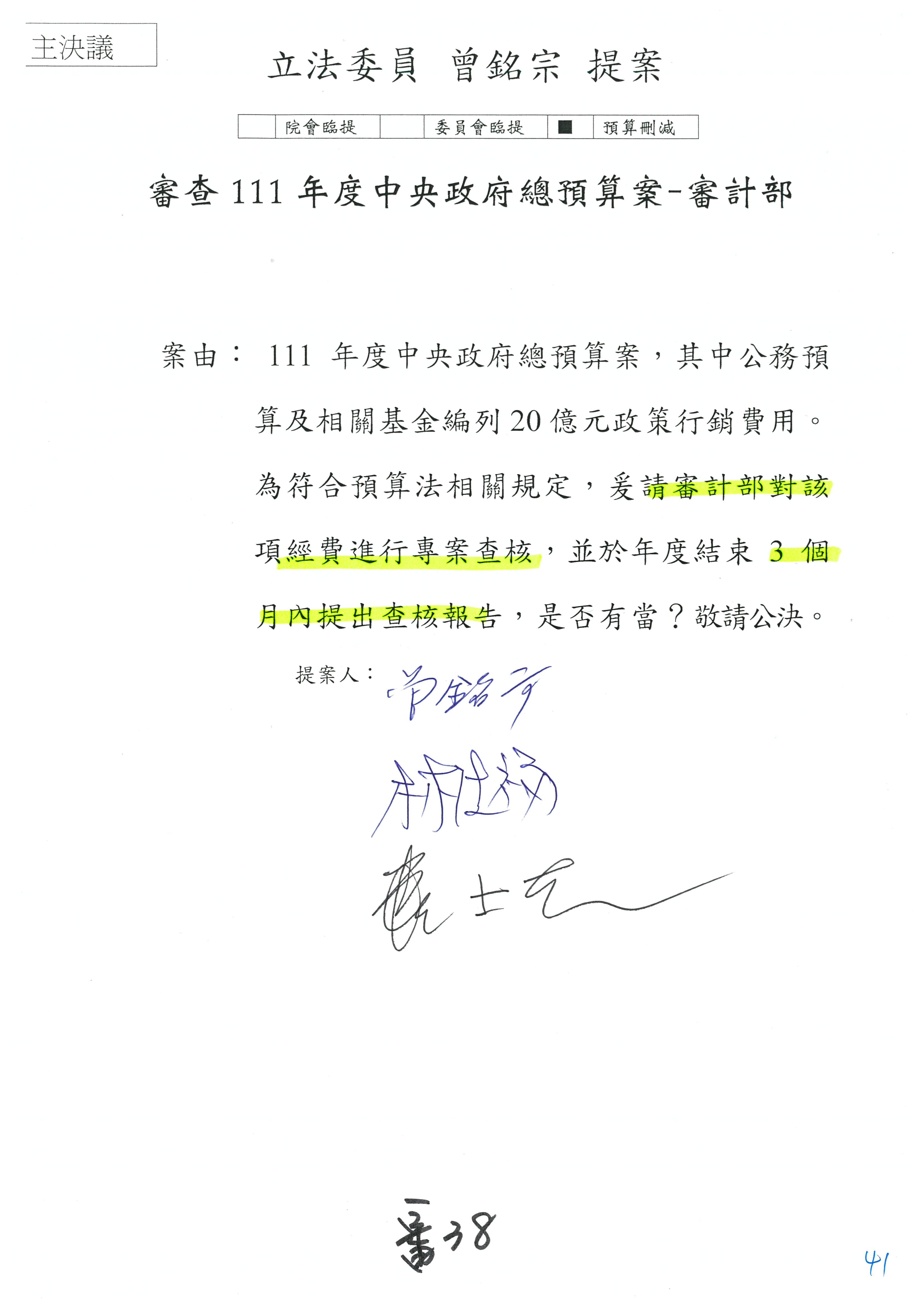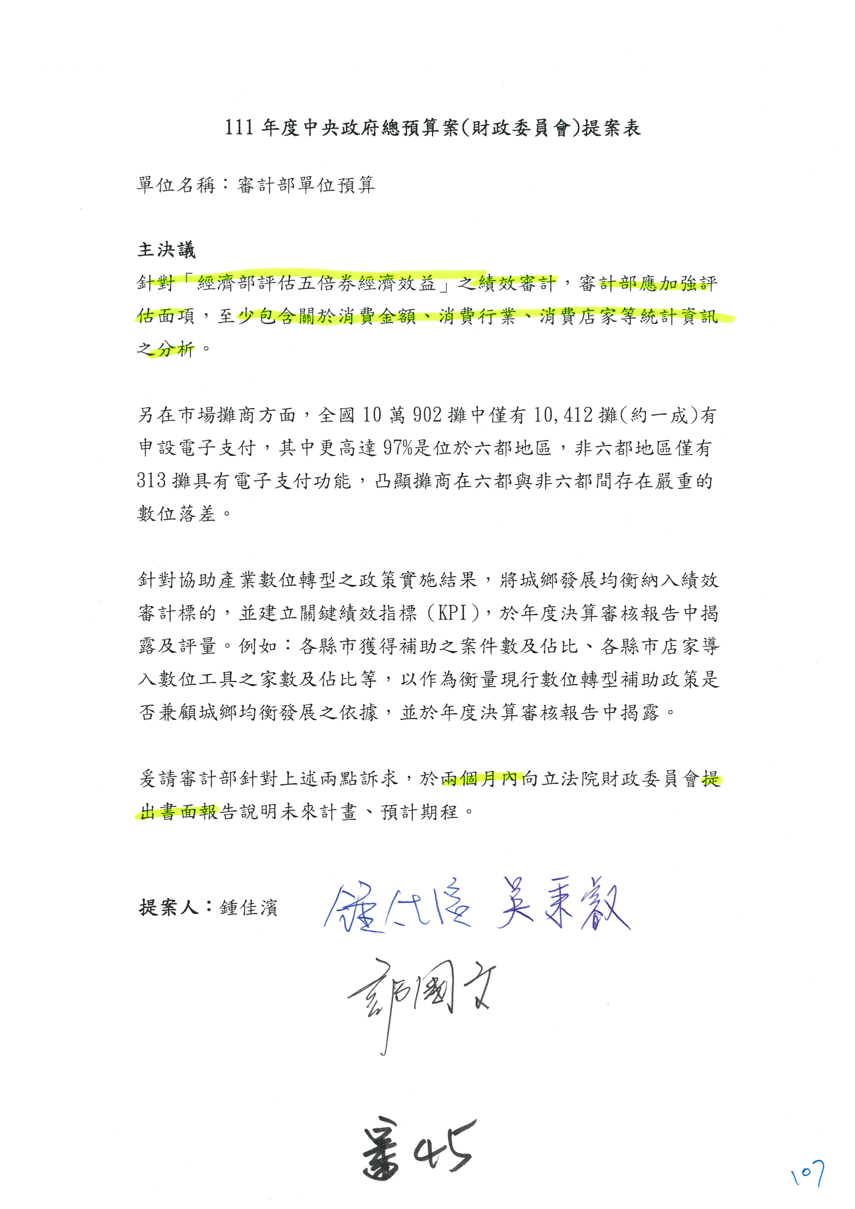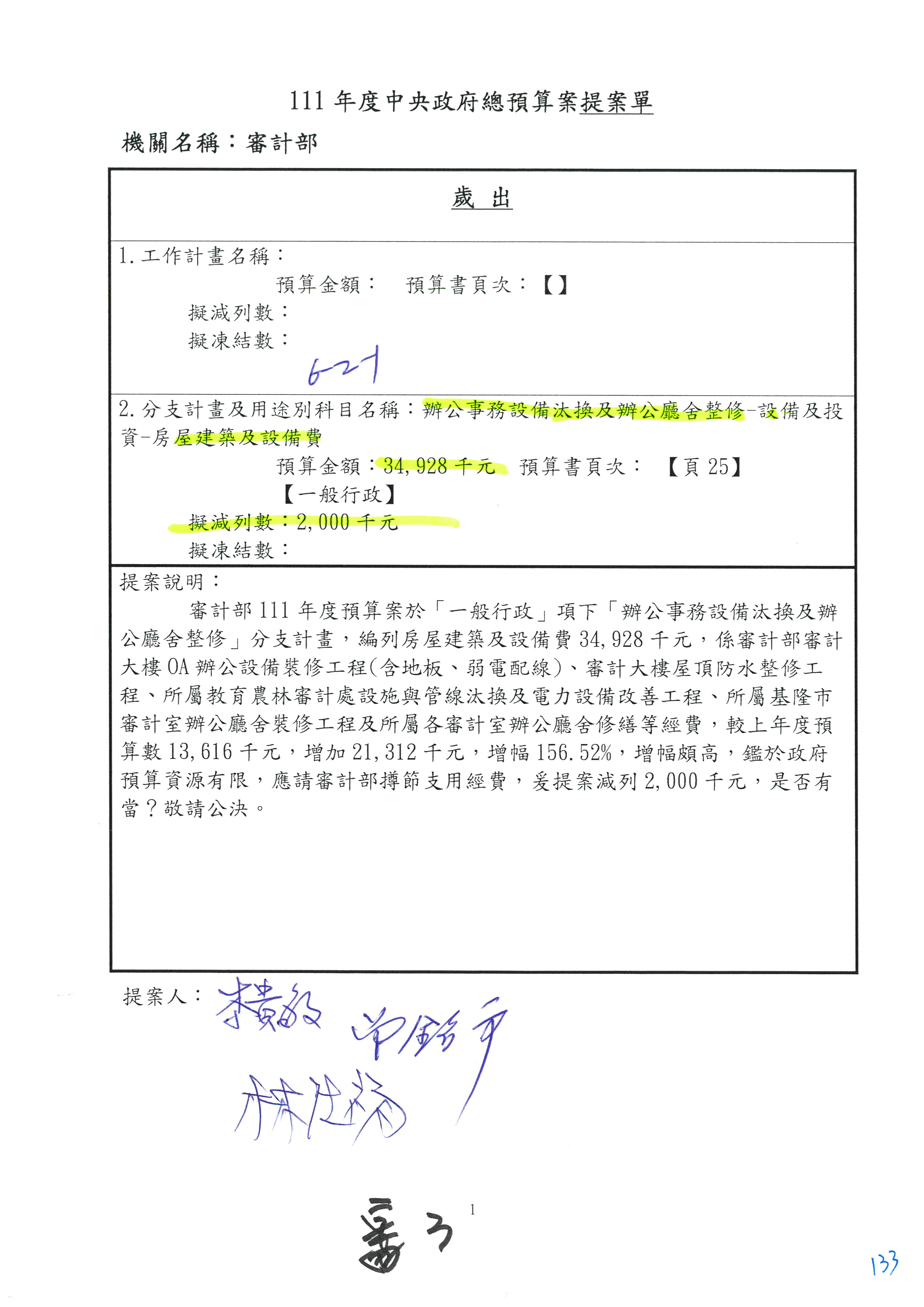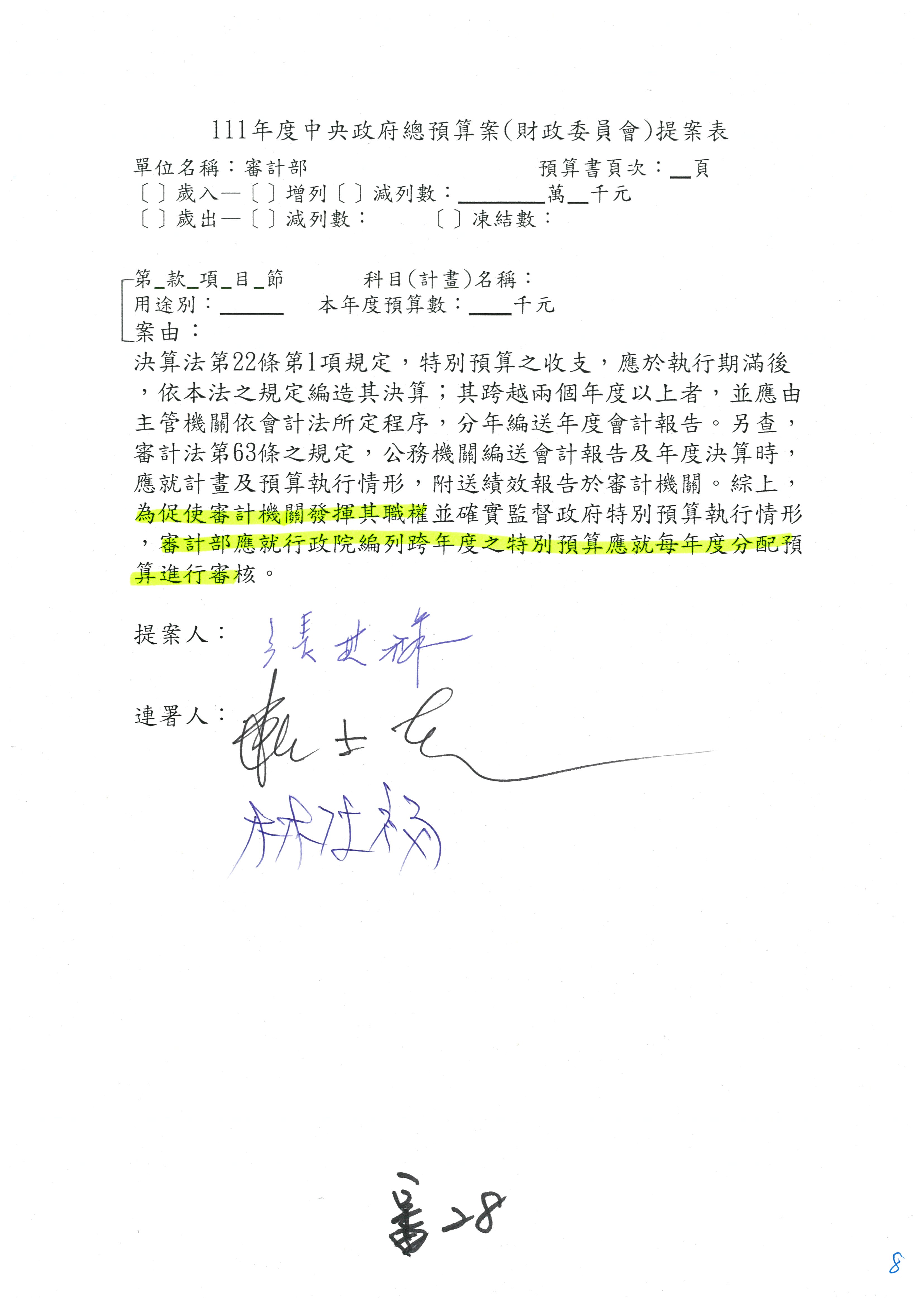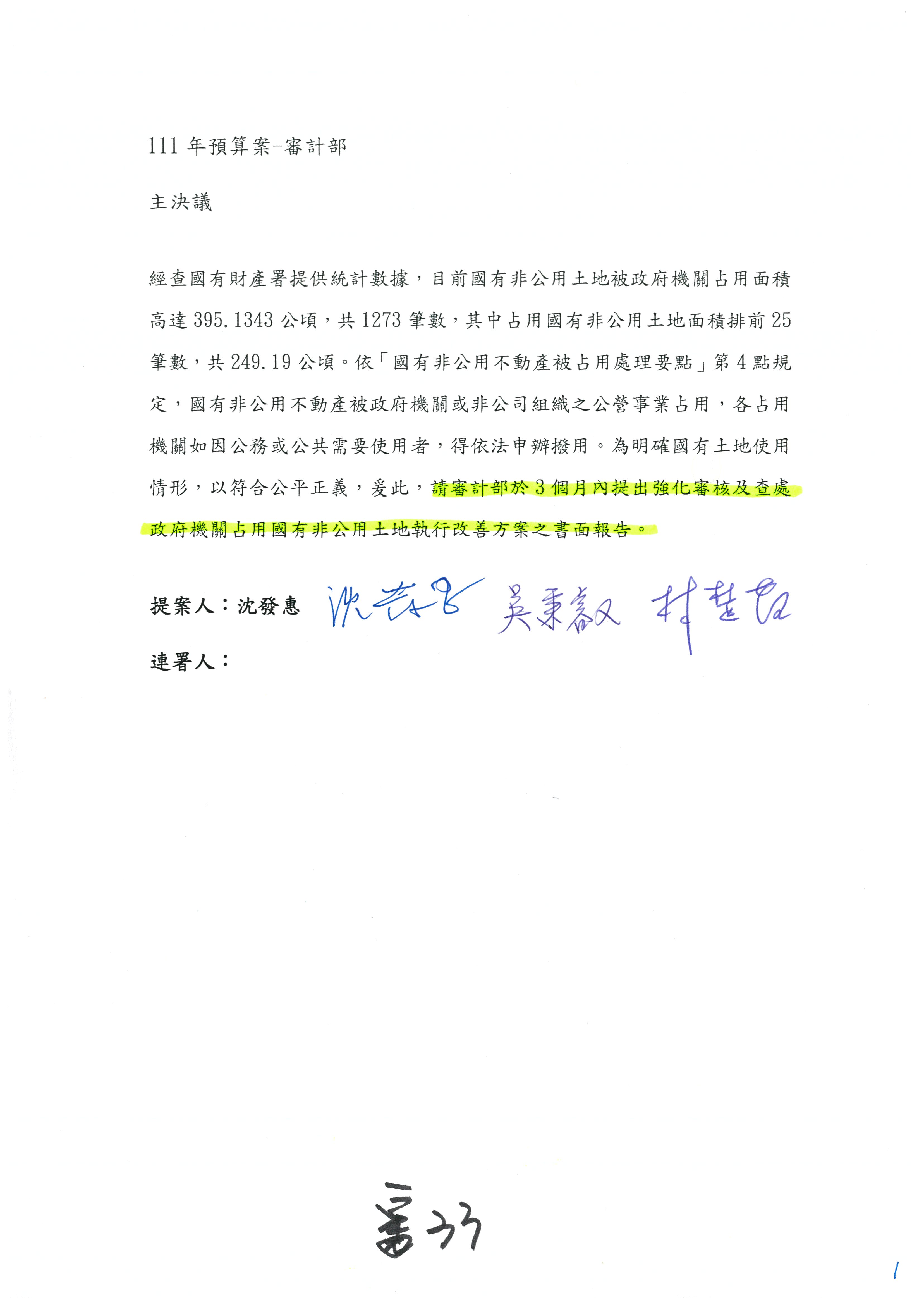李副審計長順保:跟委員報告,倒數第三行後段文字建議修正為「爰應請審計部就109年度中央機關」,以下文字都一樣,最後一句話建議改成「提出書面報告」。
