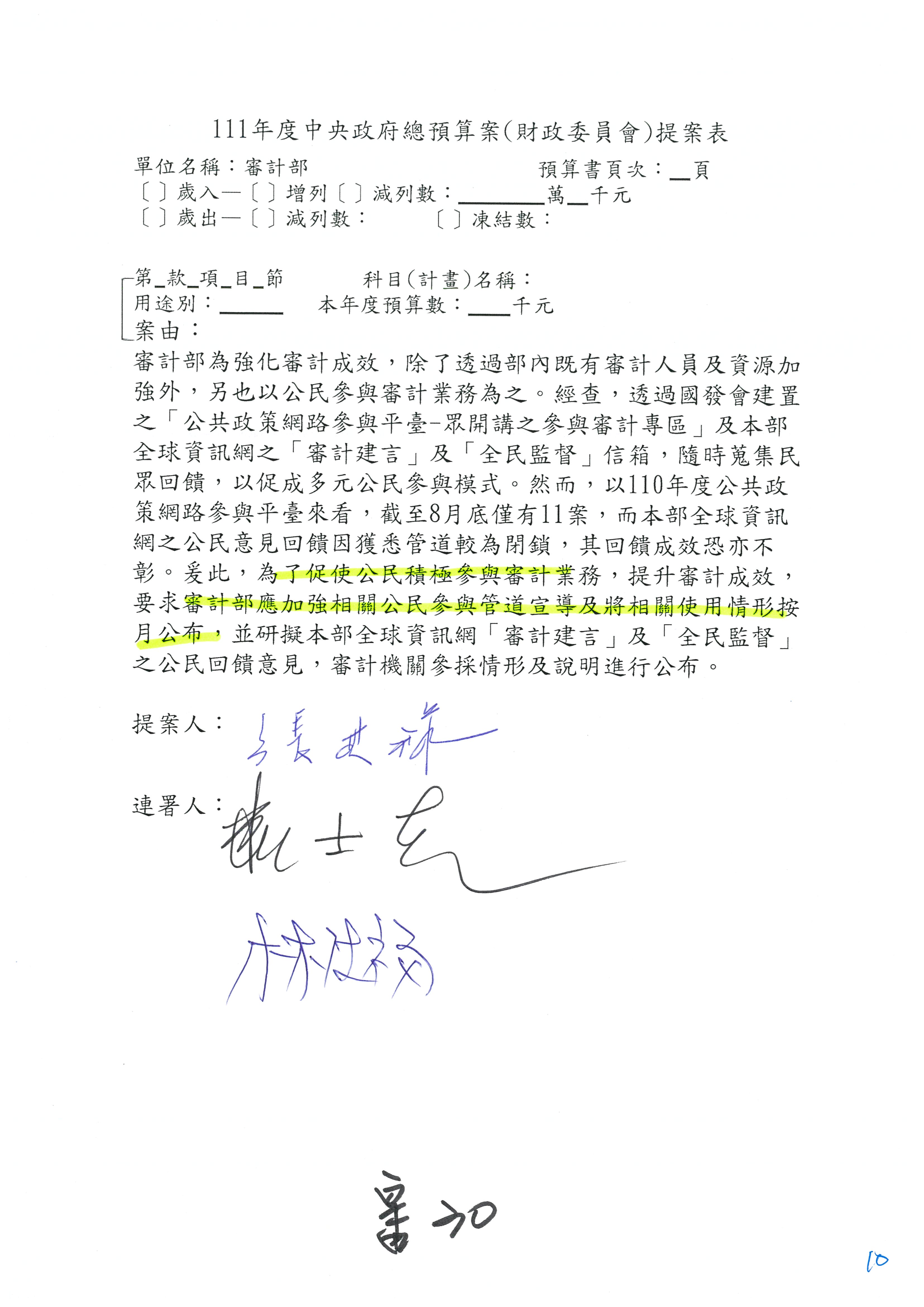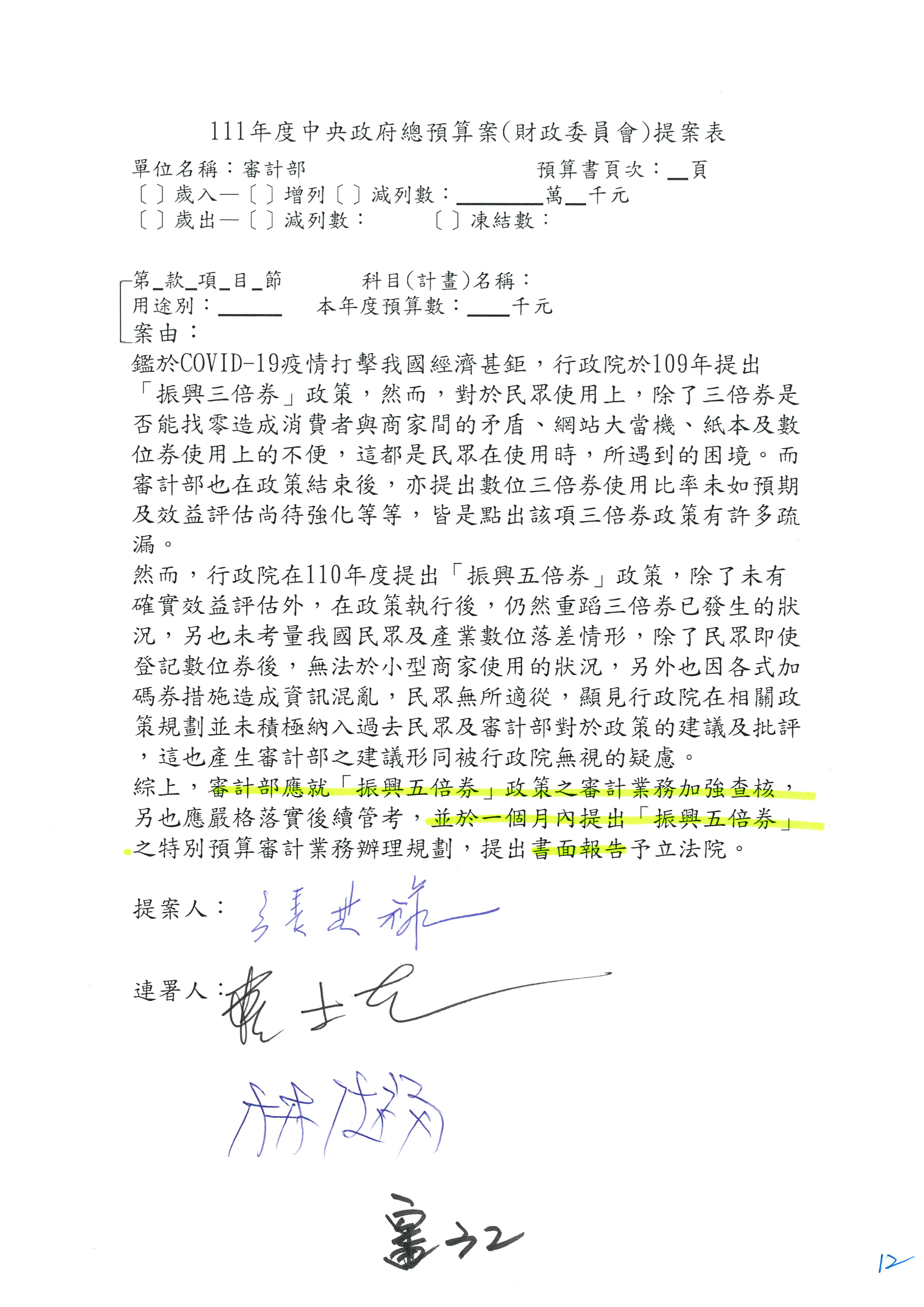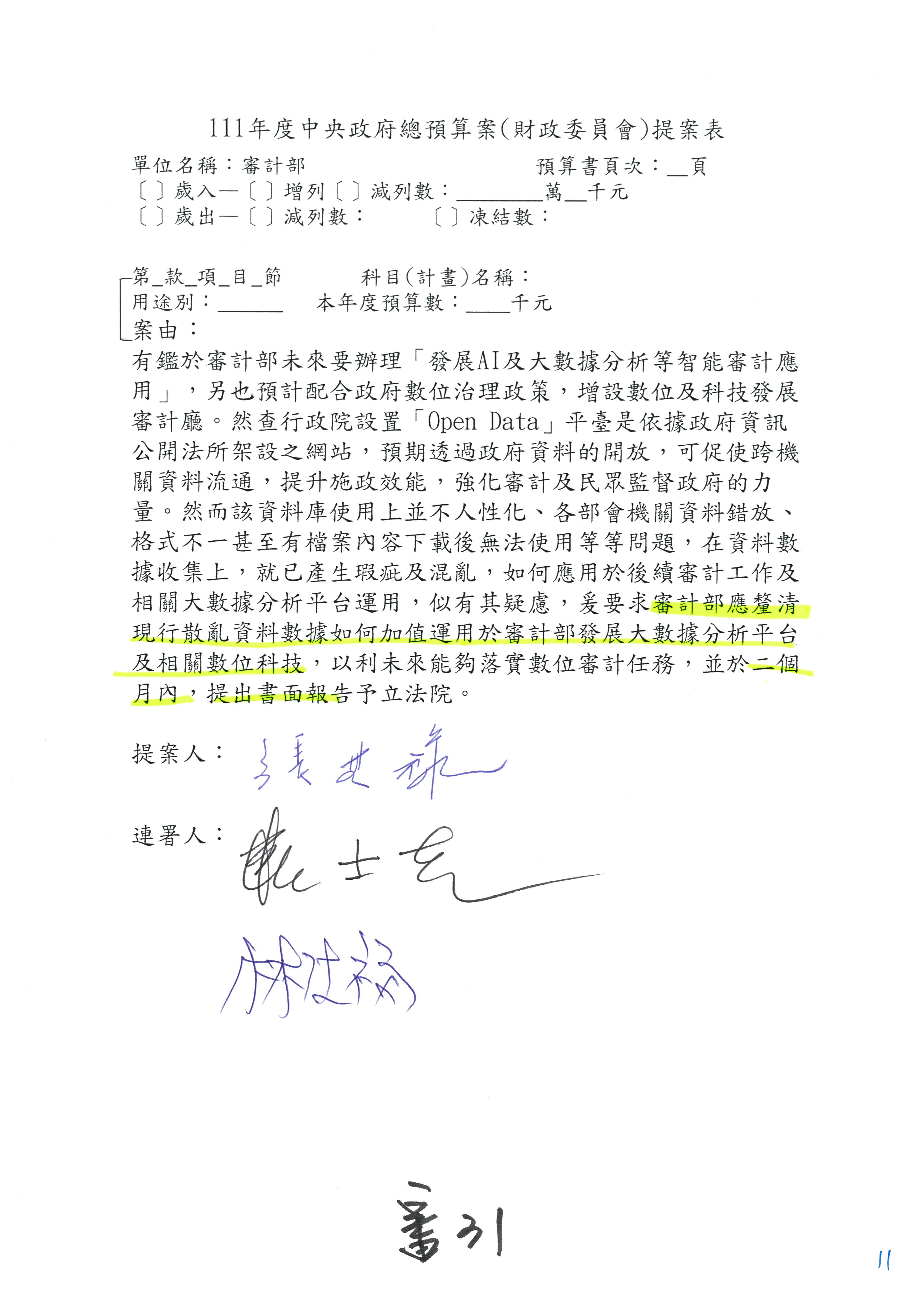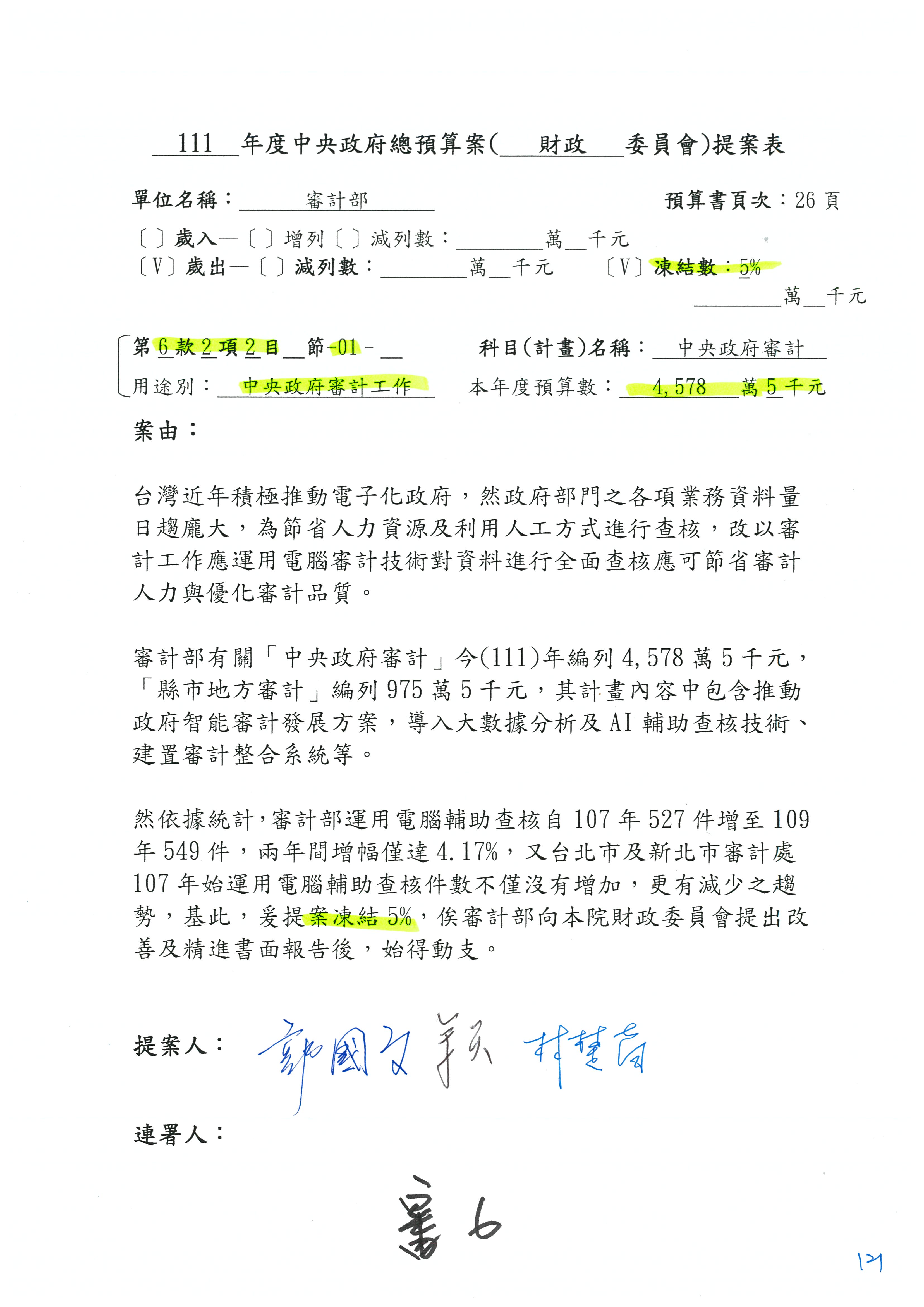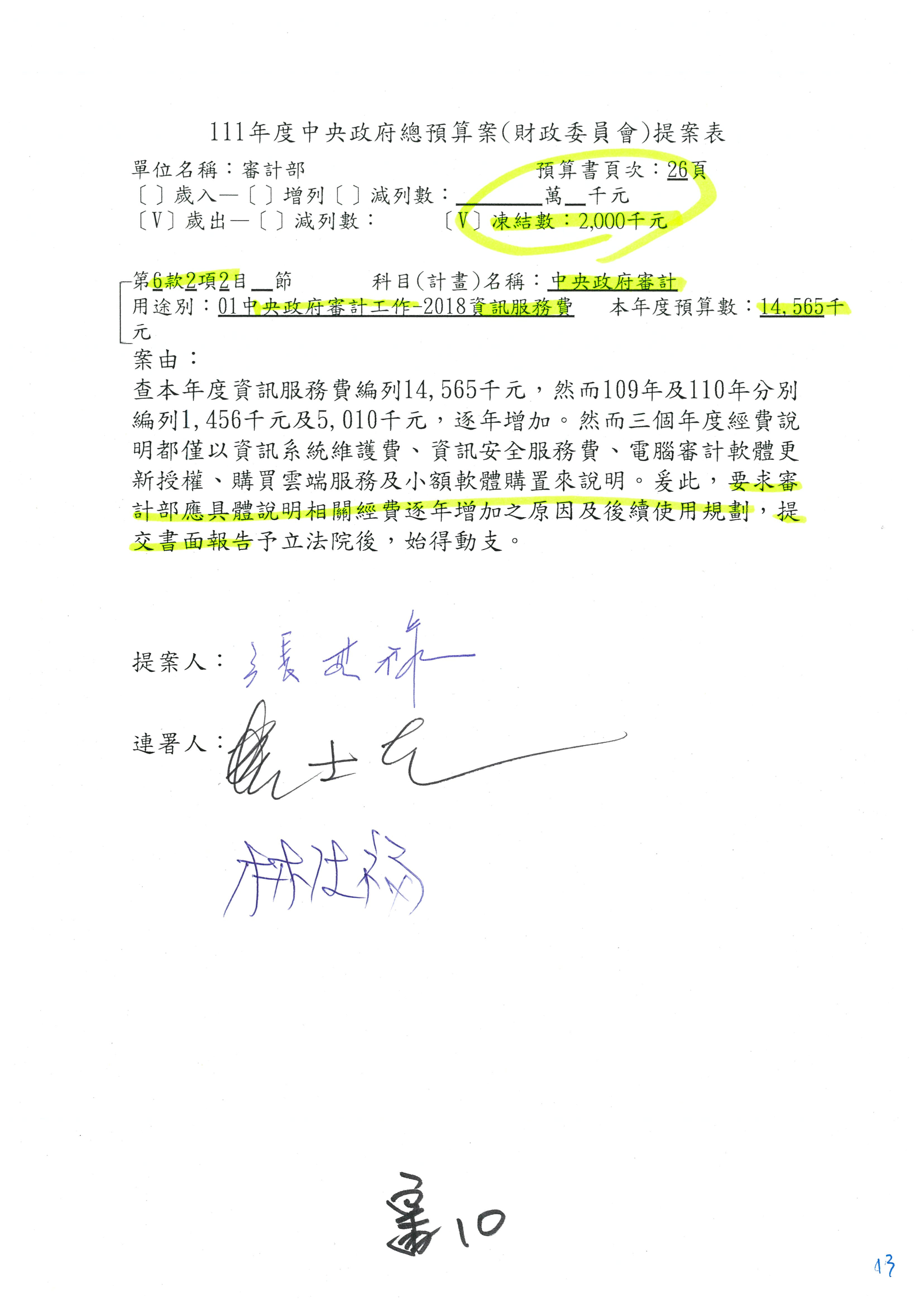 李副審計長順保:跟委員報告,倒數第三行後段文字建議修正為「爰應請審計部就109年度中央機關」,以下文字都一樣,最後一句話建議改成「提出書面報告」。
