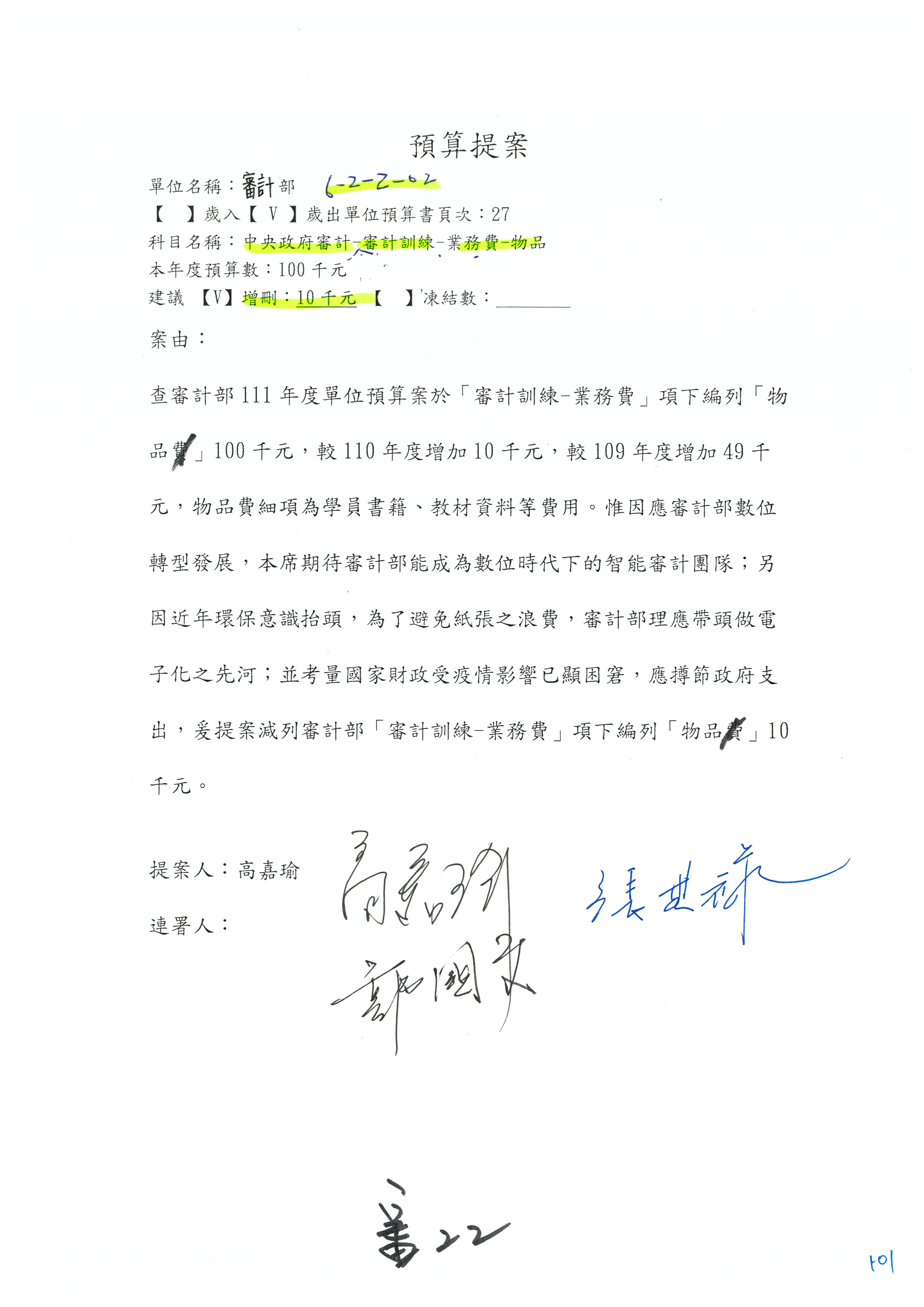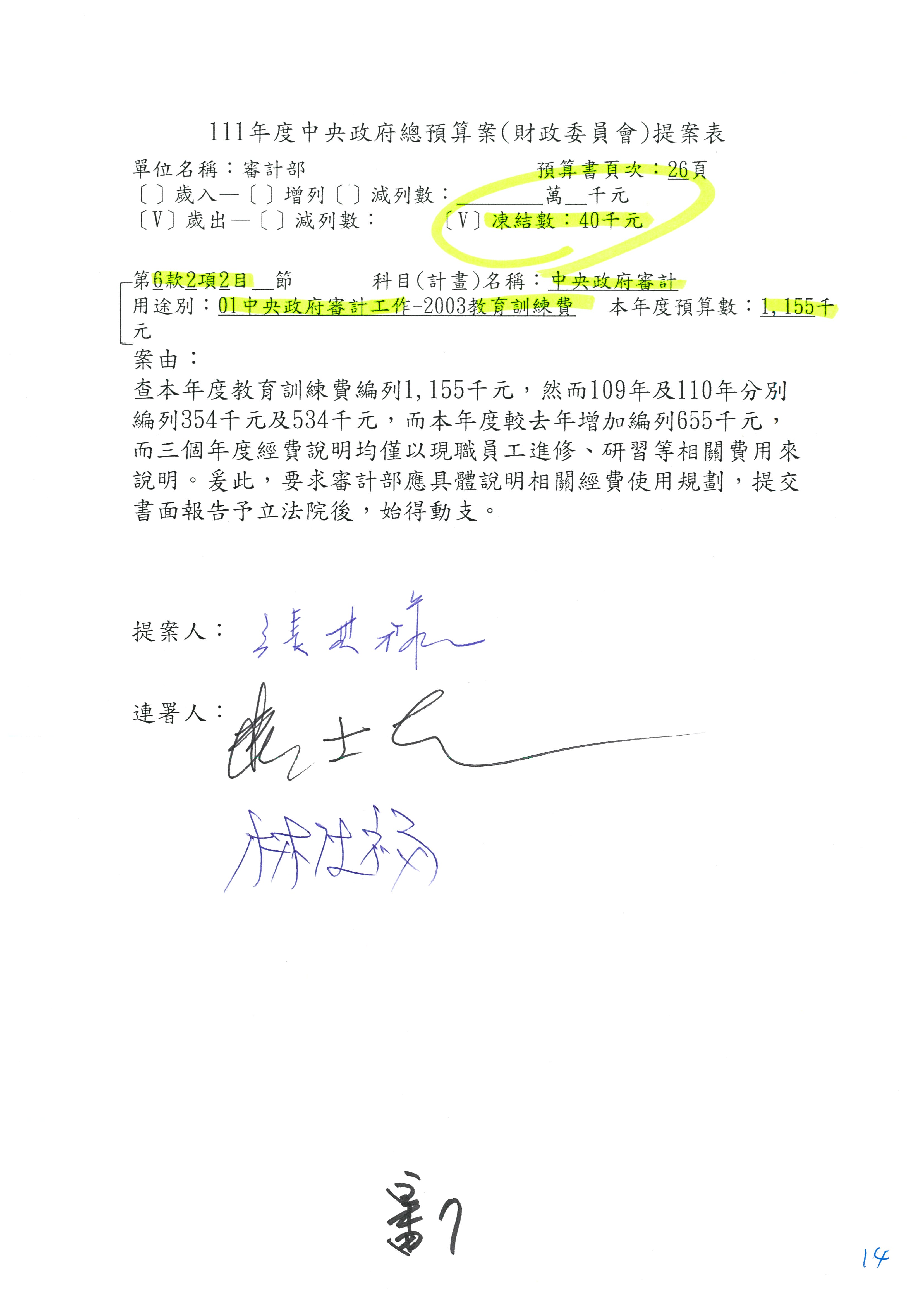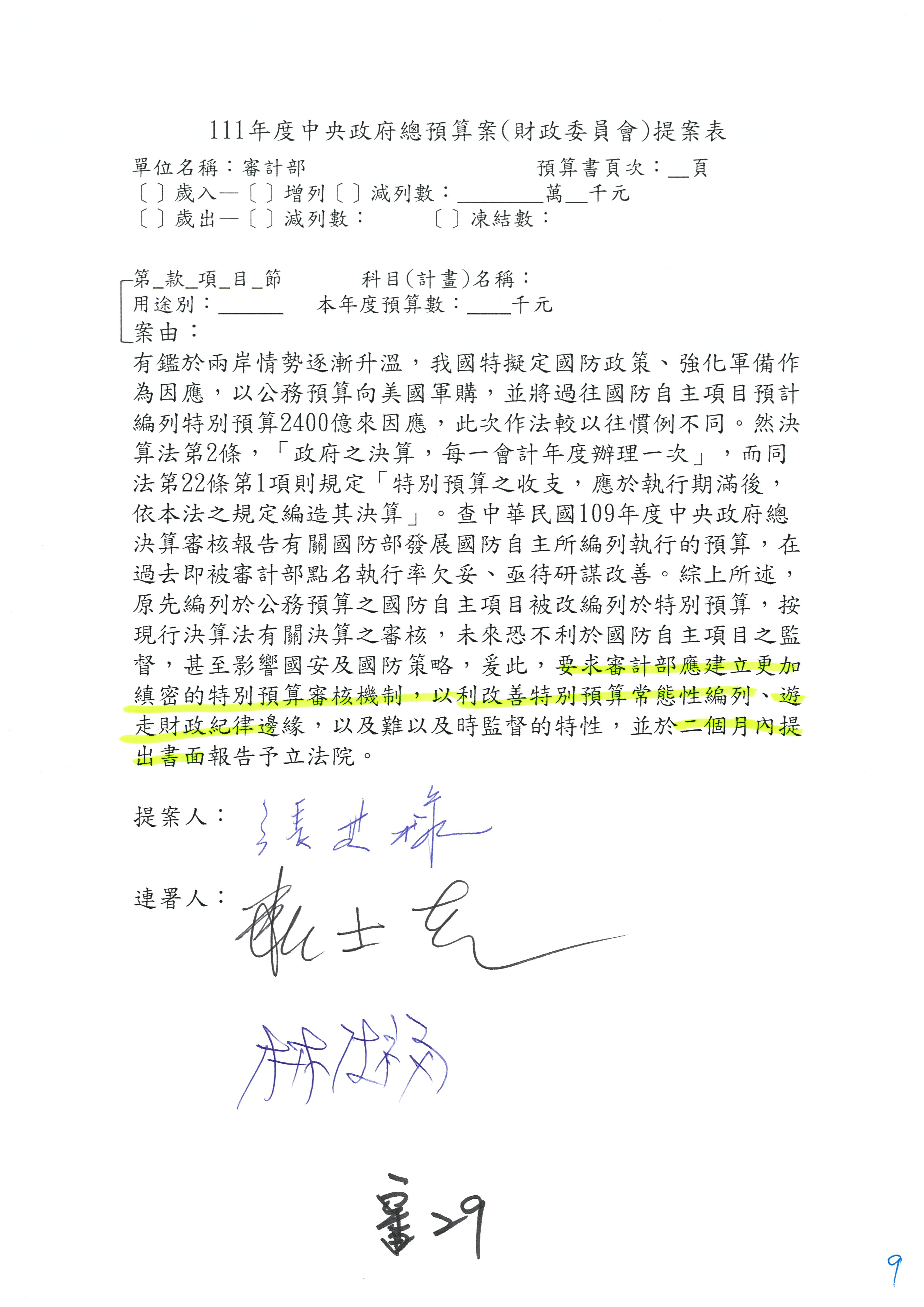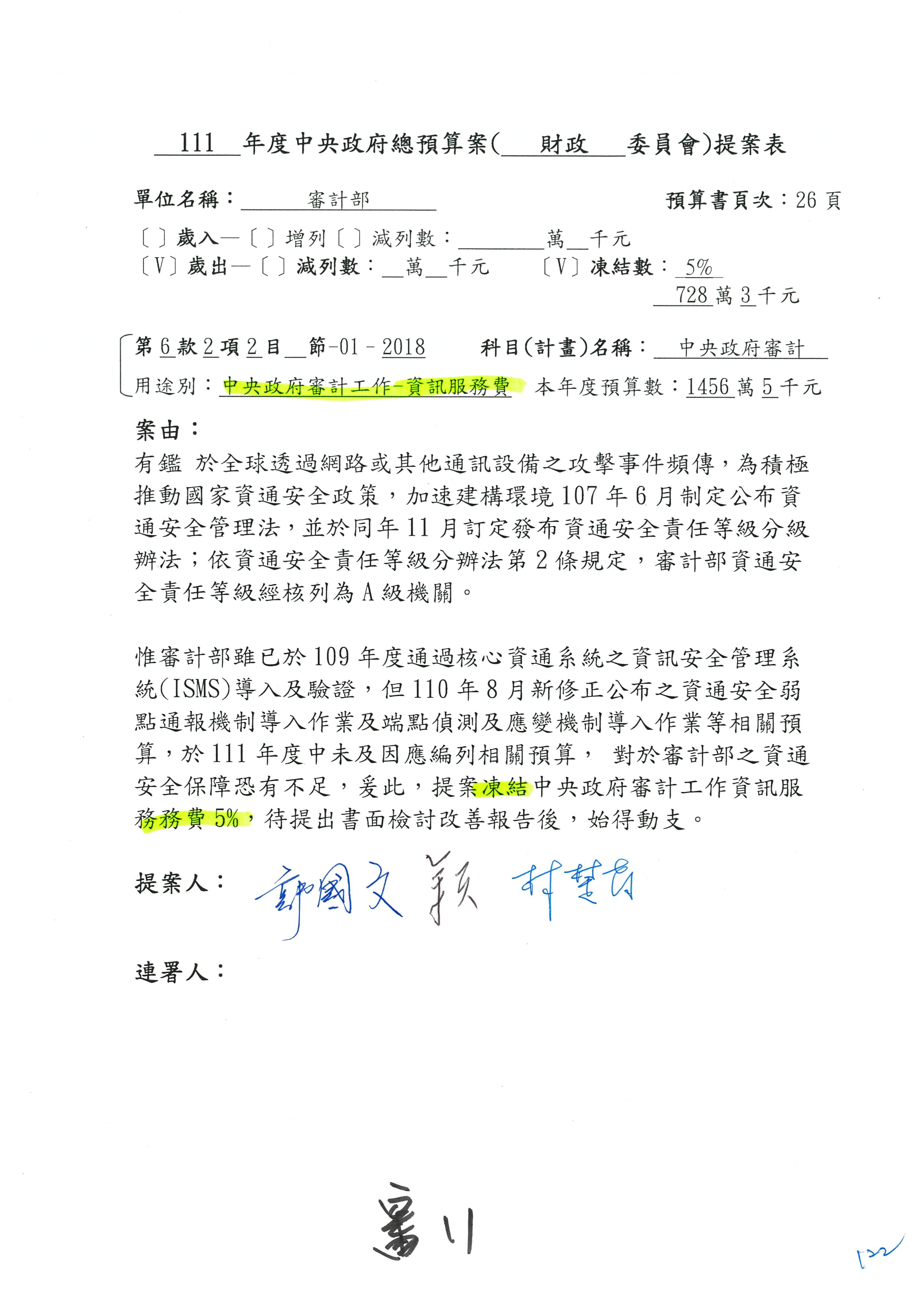 李副審計長順保:跟委員報告,倒數第三行後段文字建議修正為「爰應請審計部就109年度中央機關」,以下文字都一樣,最後一句話建議改成「提出書面報告」。