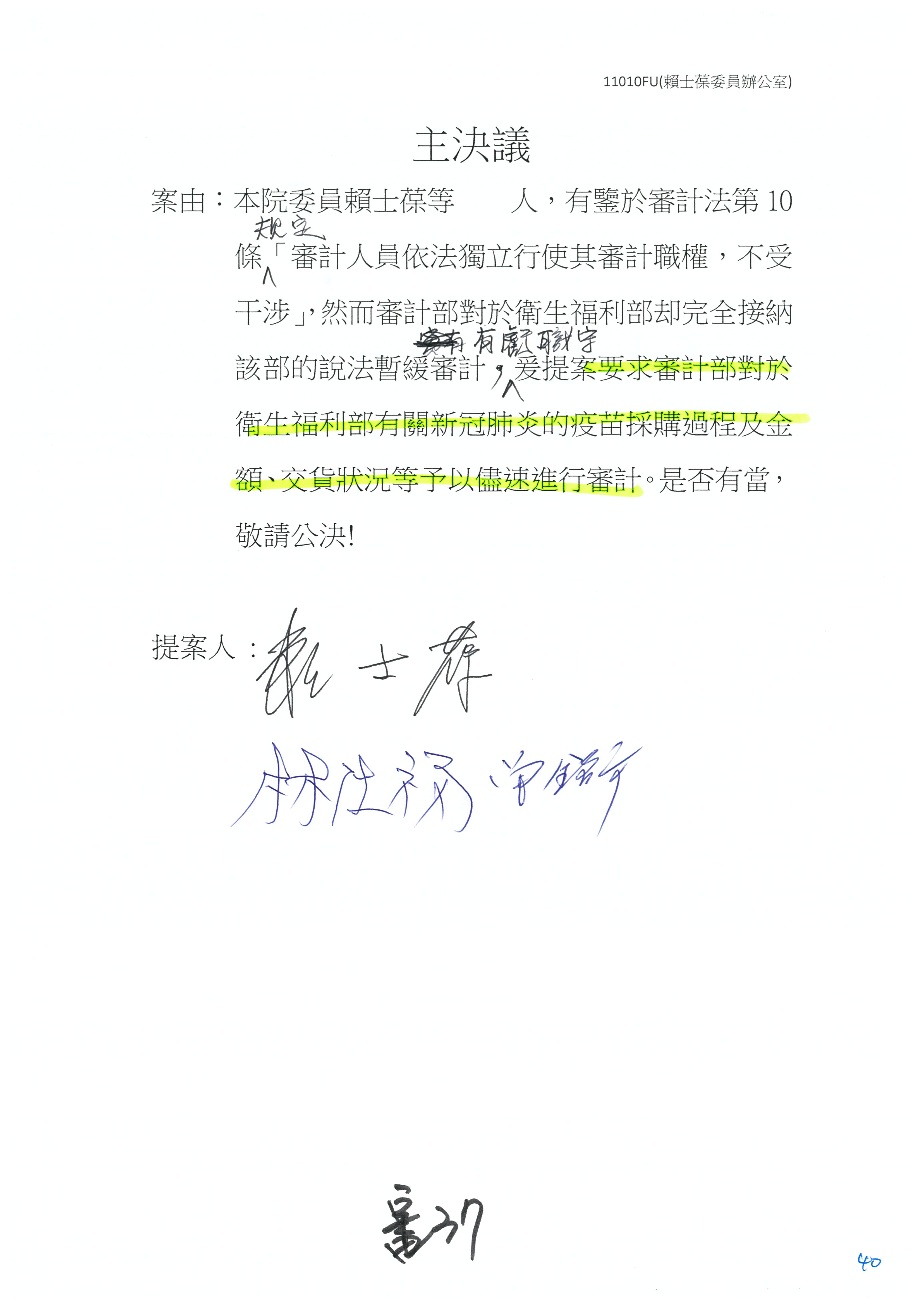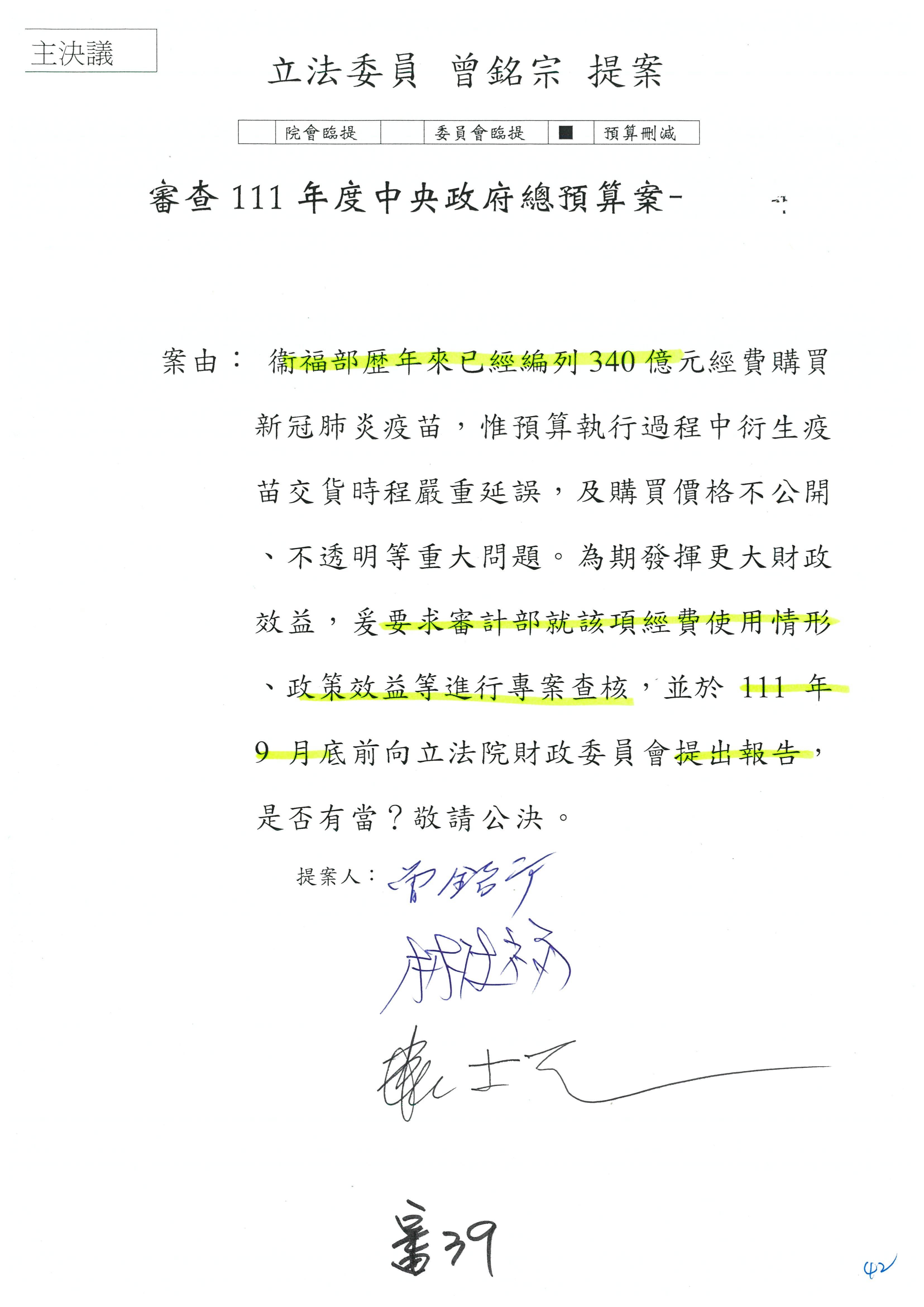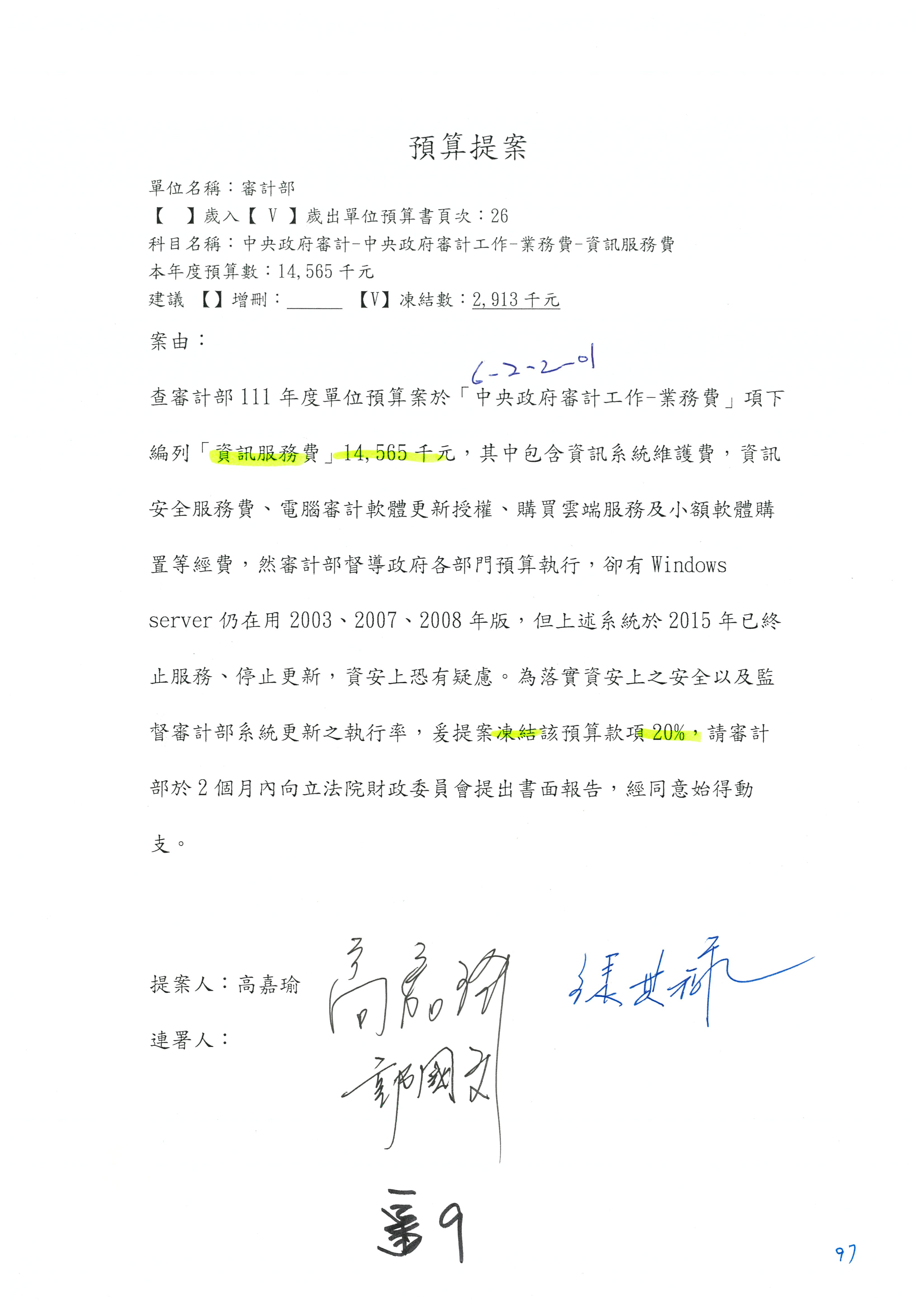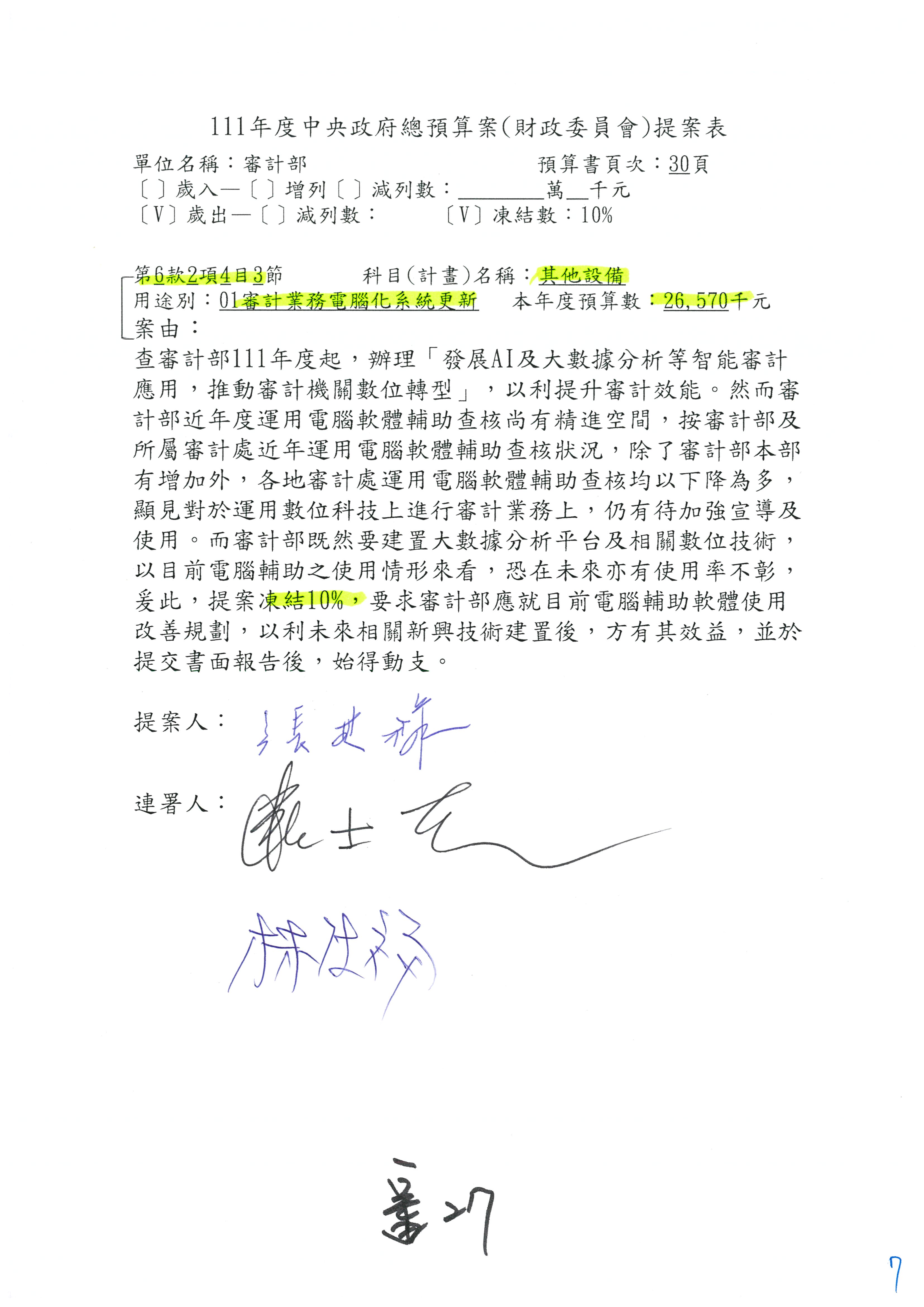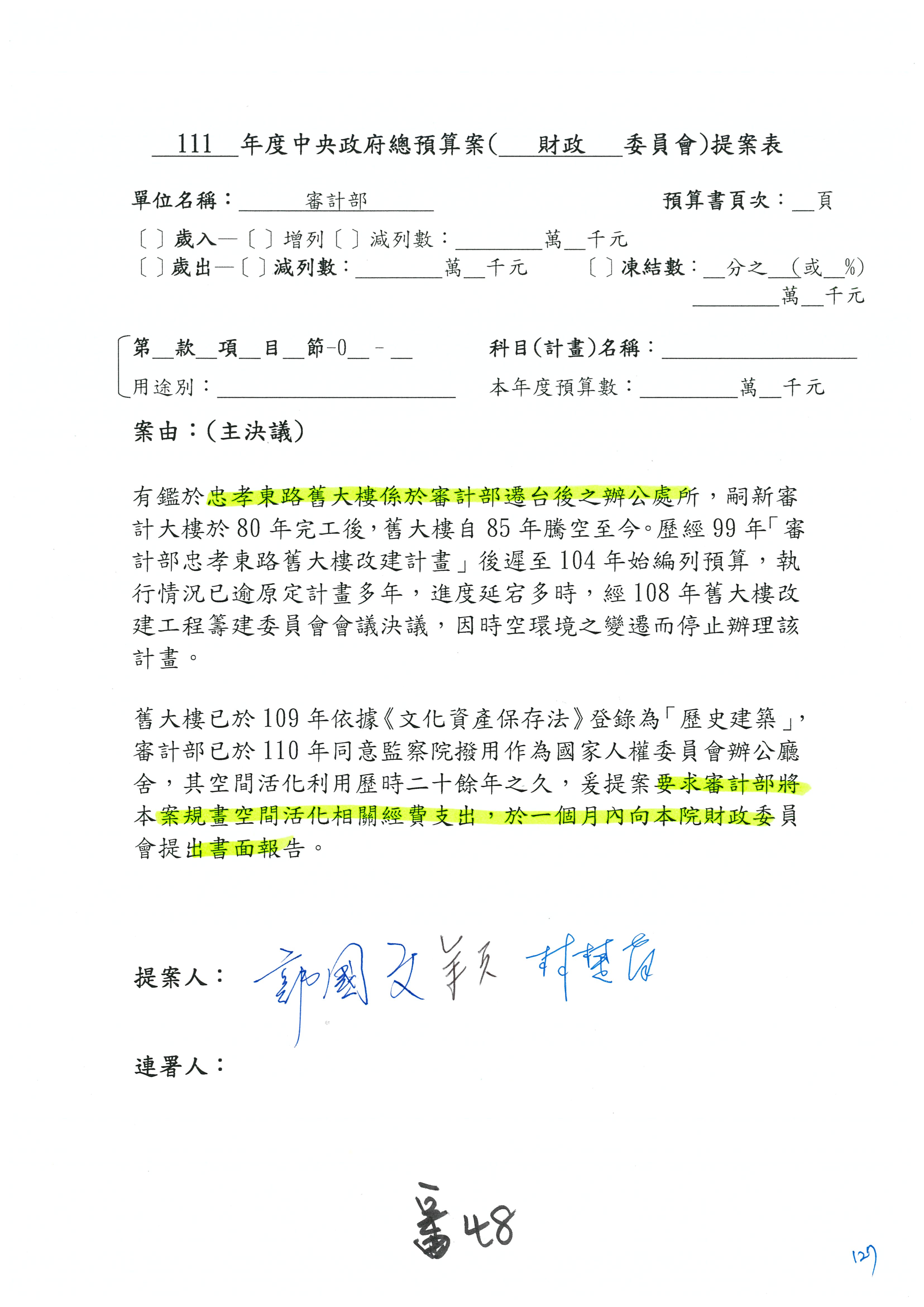 李副審計長順保:跟委員報告,倒數第三行後段文字建議修正為「爰應請審計部就109年度中央機關」,以下文字都一樣,最後一句話建議改成「提出書面報告」。