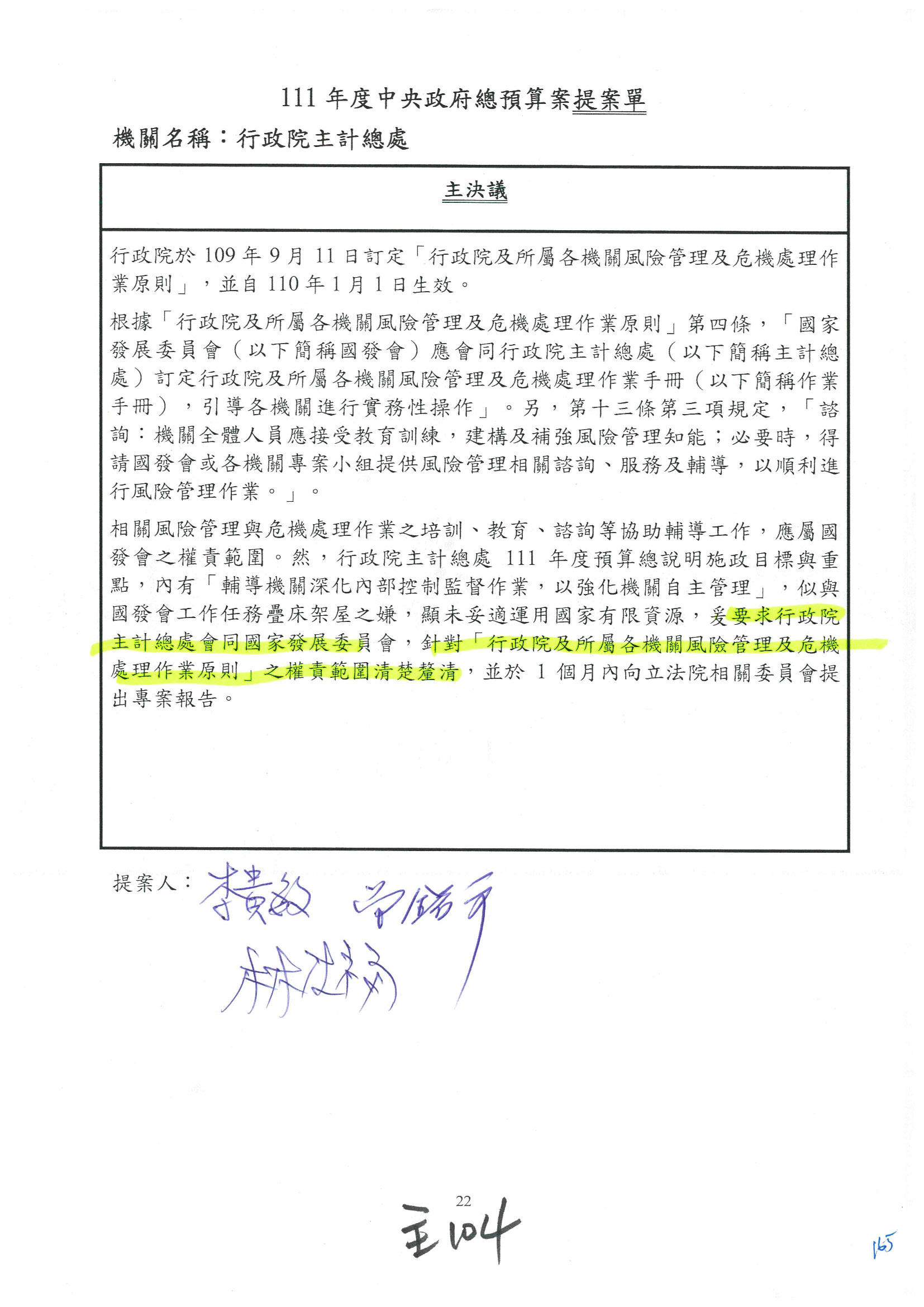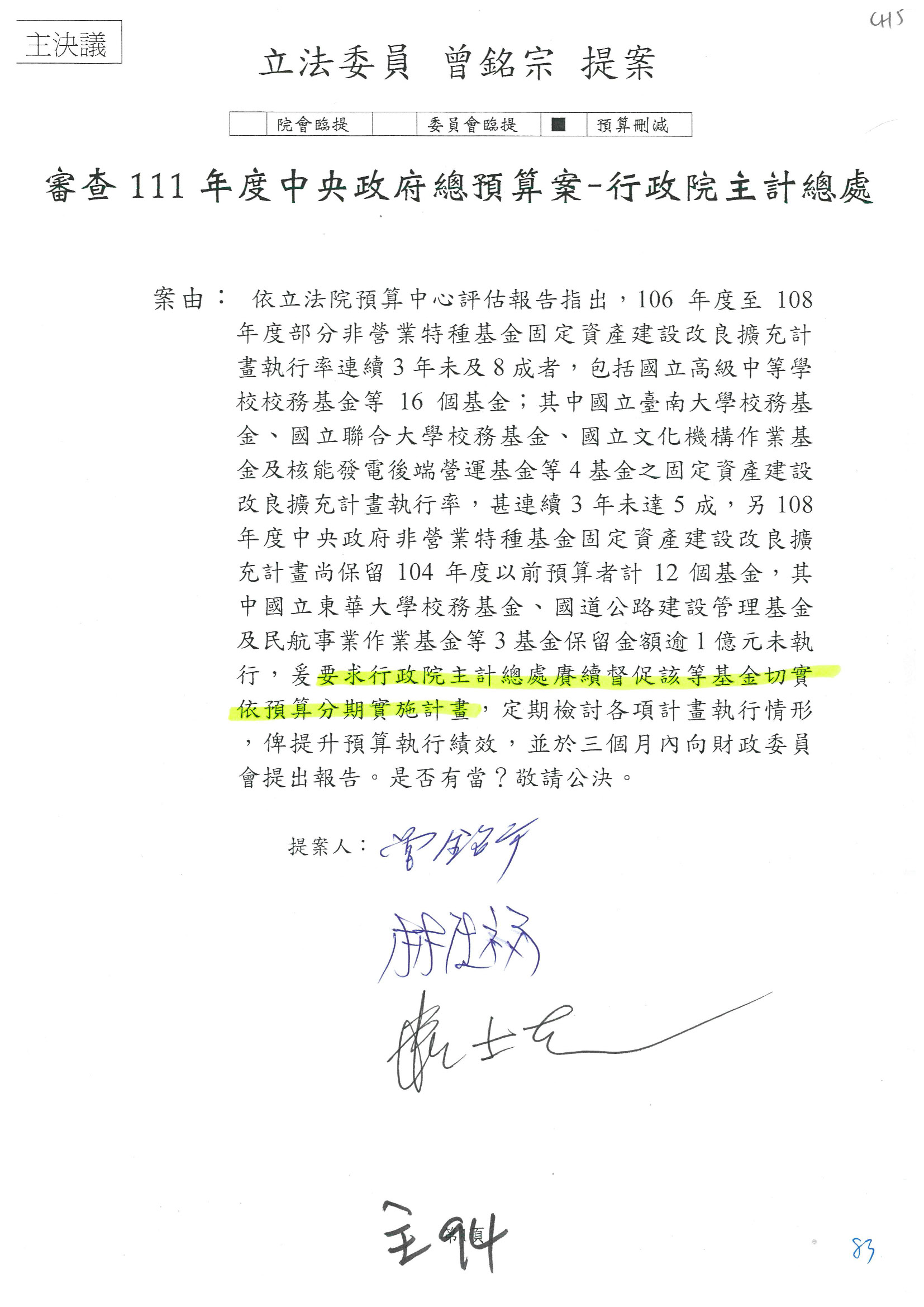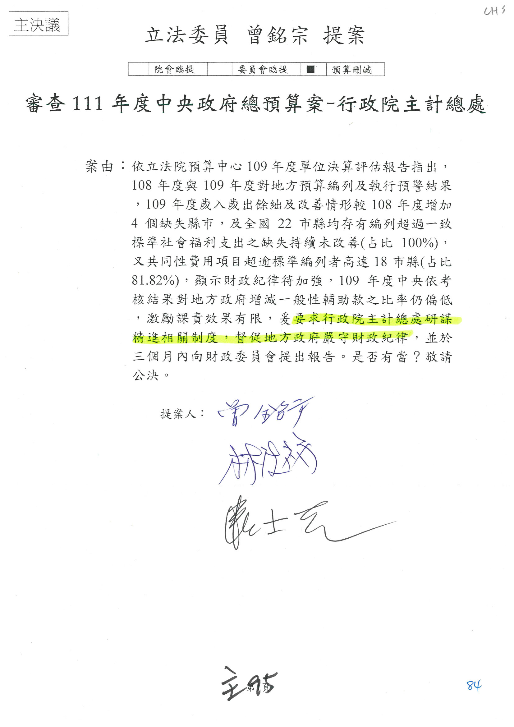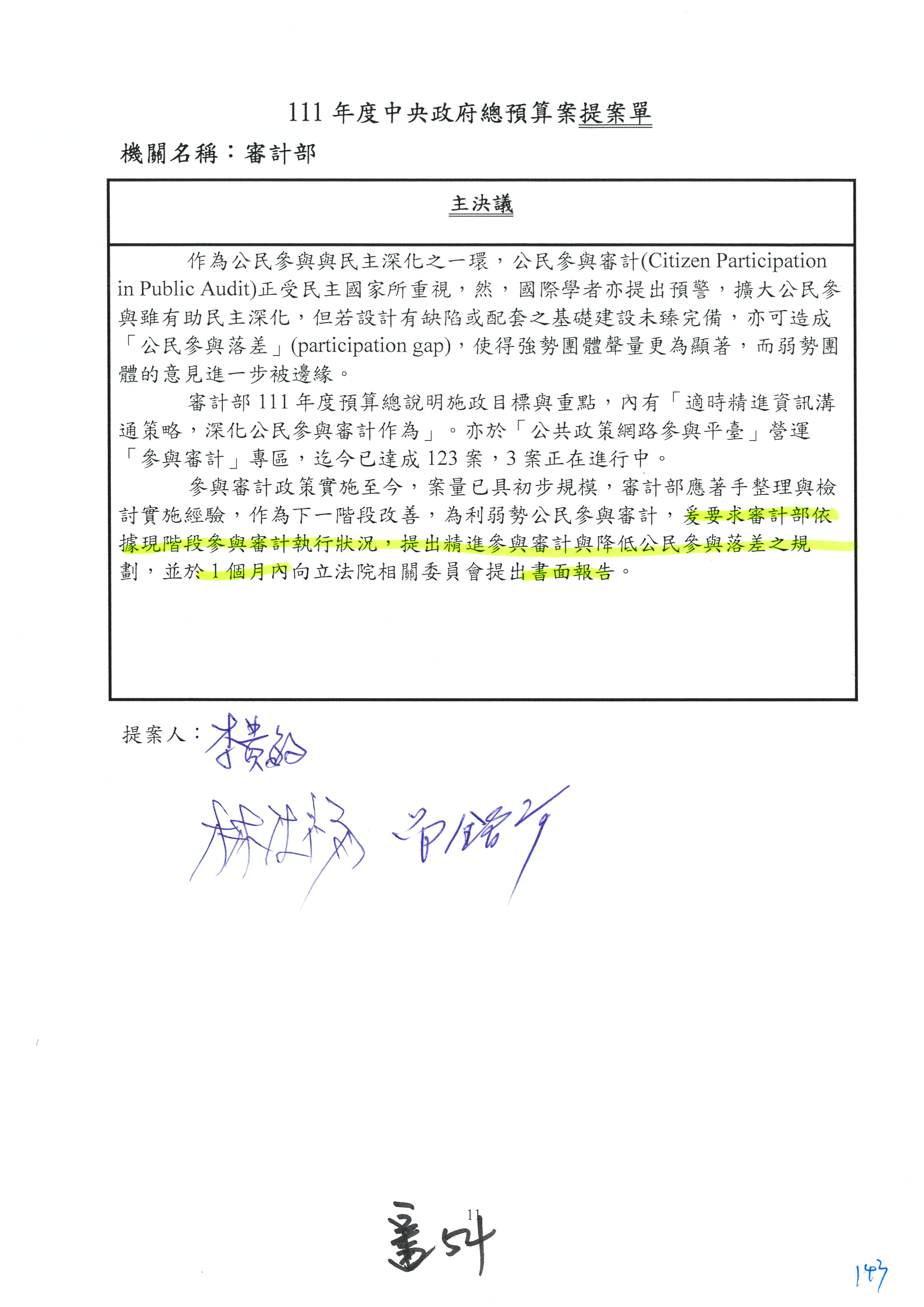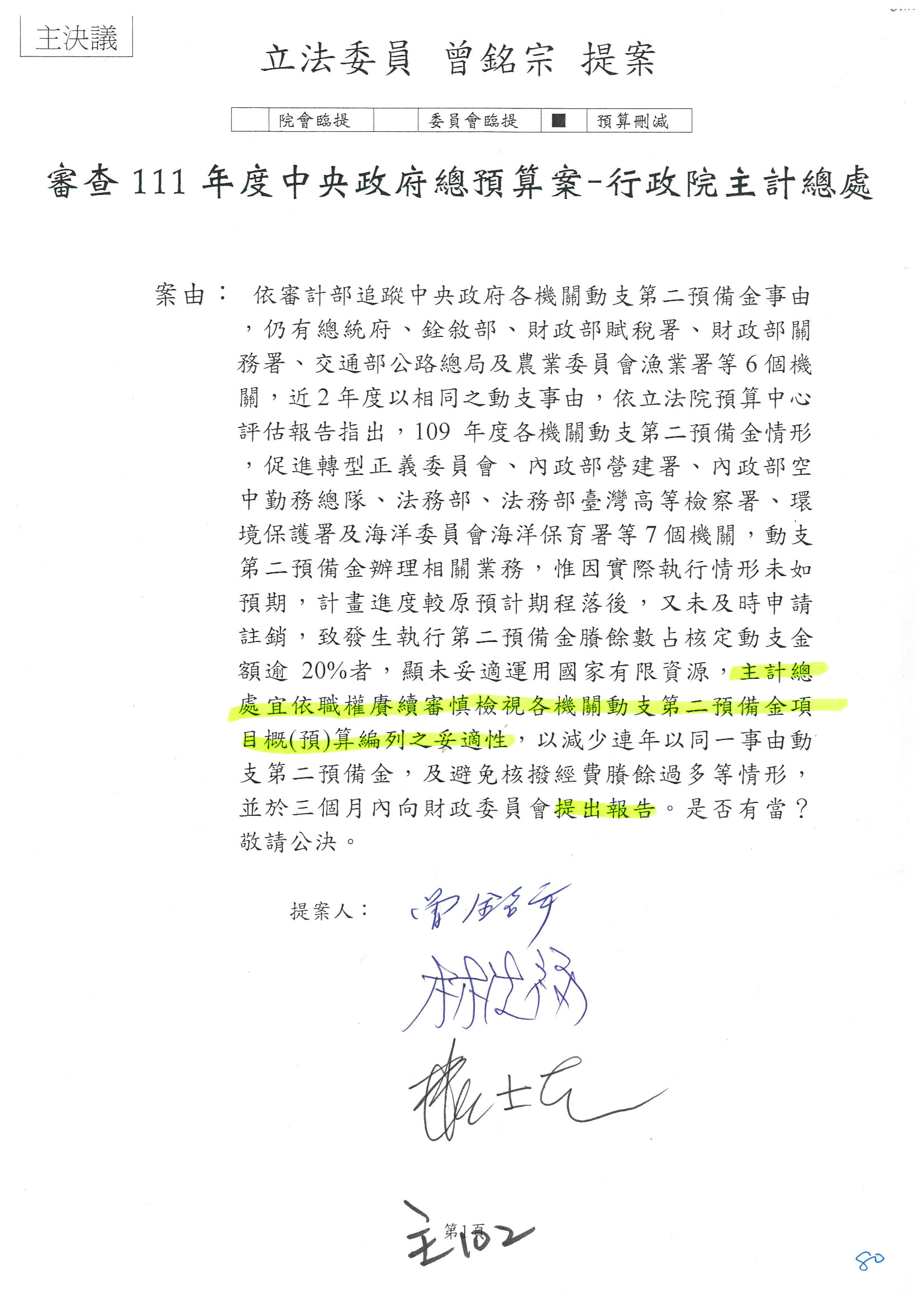 主席:111年度關於主計總處、審計部及所屬單位預算案之審查結果:審查111年度中央政府總預算案有關主計總處暨審計部、審計部臺北市審計處、審計部新北市審計處、審計部桃園市審計處、審計部臺中市審計處、審計部臺南市審計處、審計部高雄市審計處預算案,除照協商結論外,其餘部分均照列。有關政事別歲出預算隨同以上機關別審查結果調整。其中改主決議的部分,我們再確認一下。