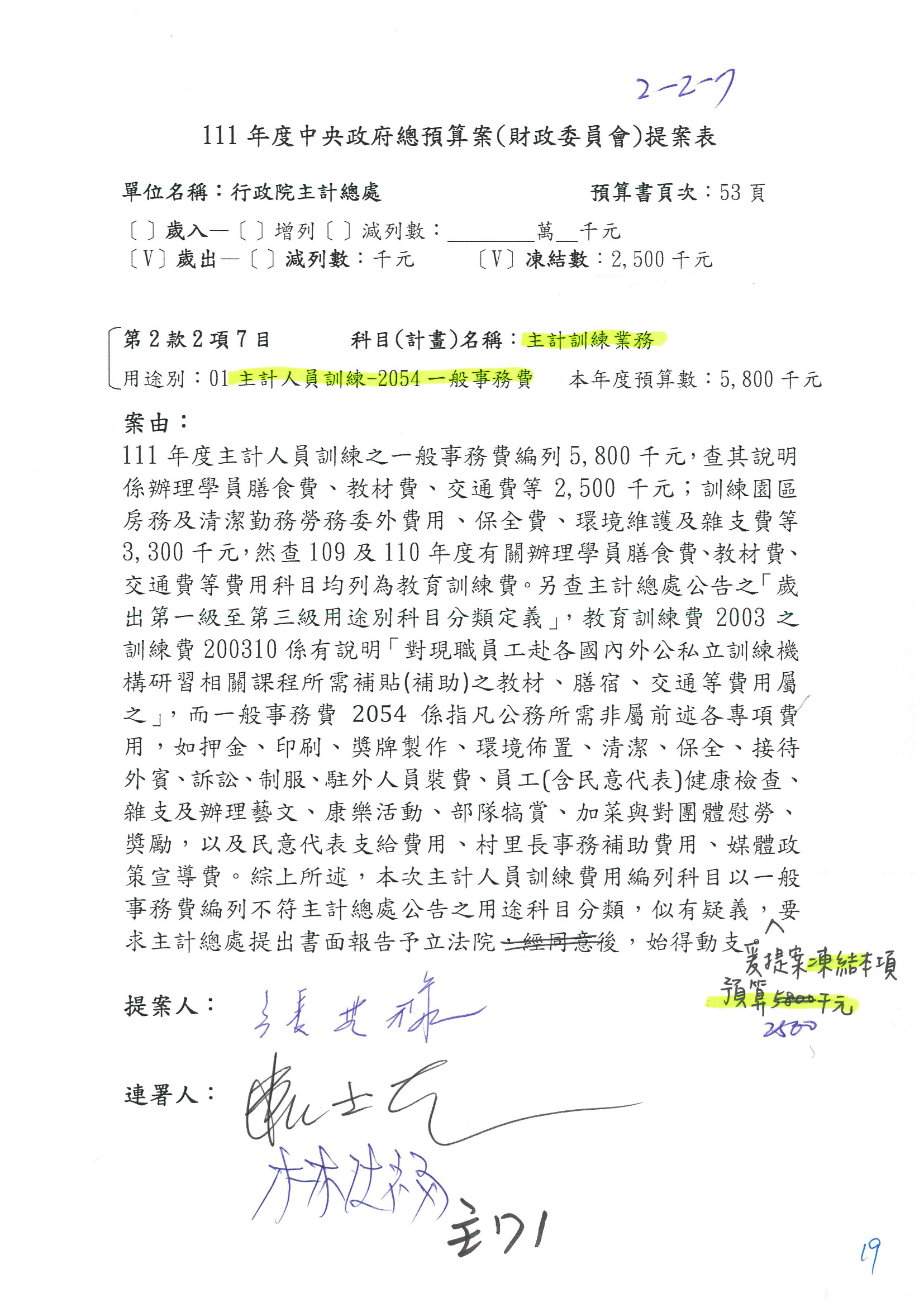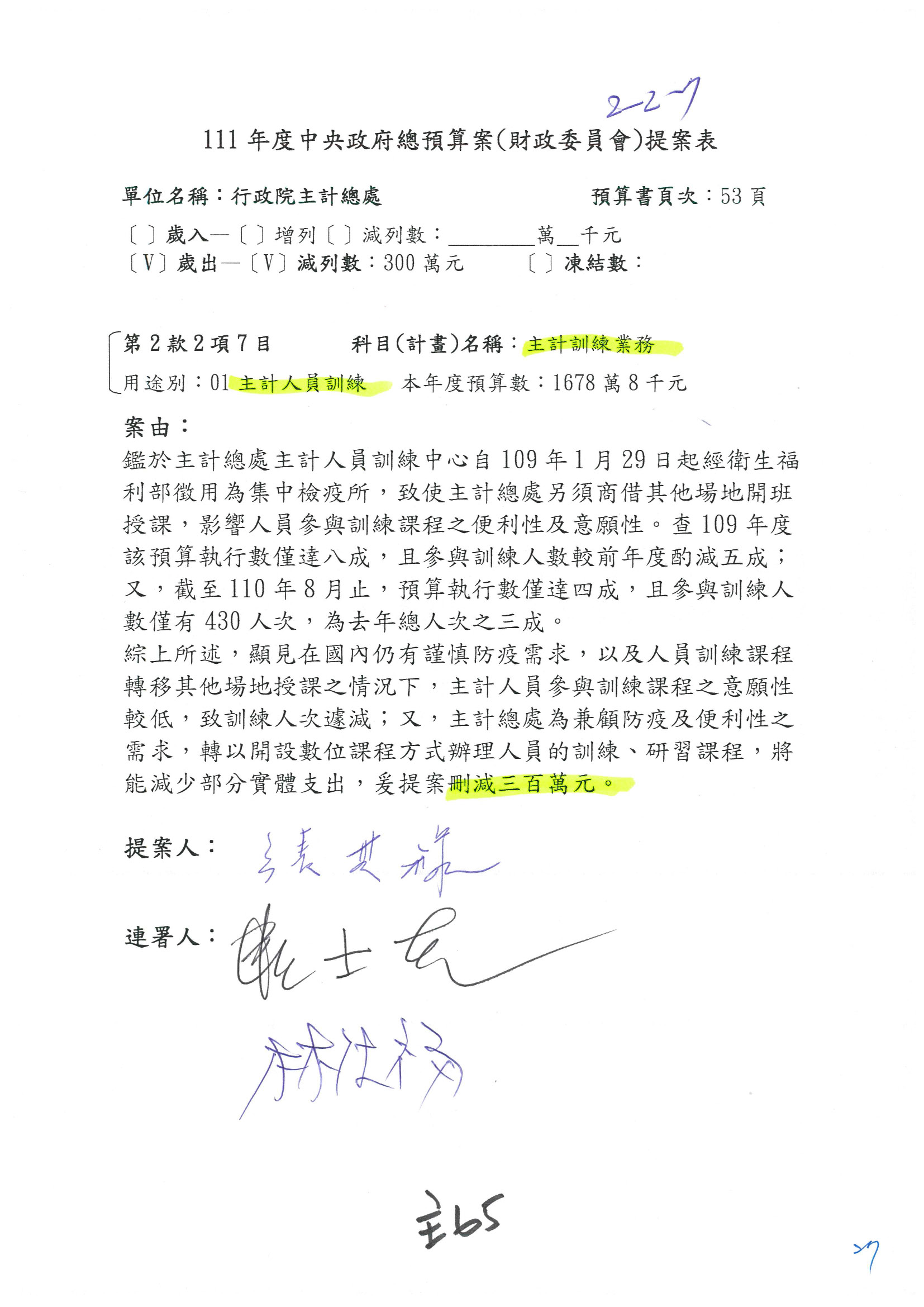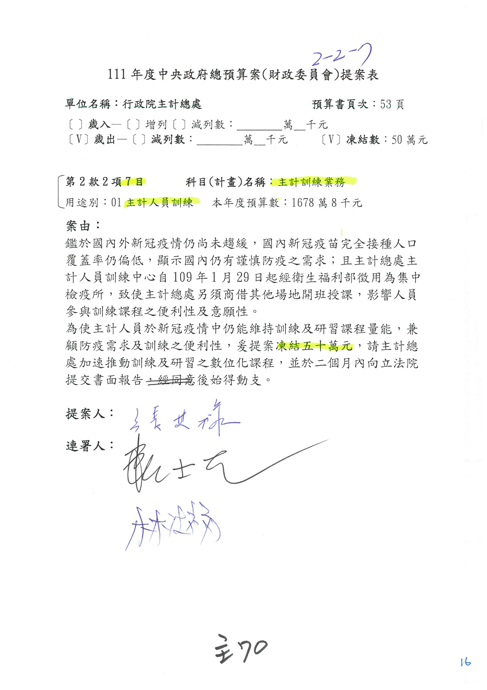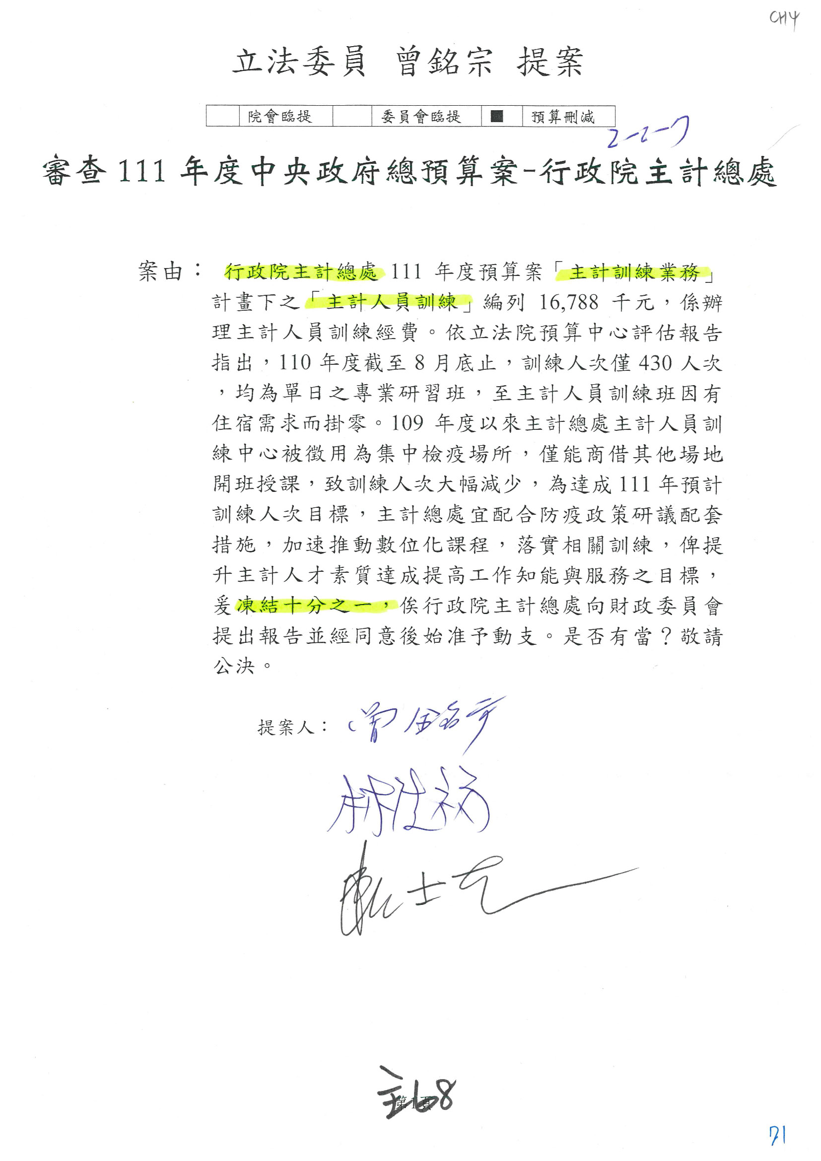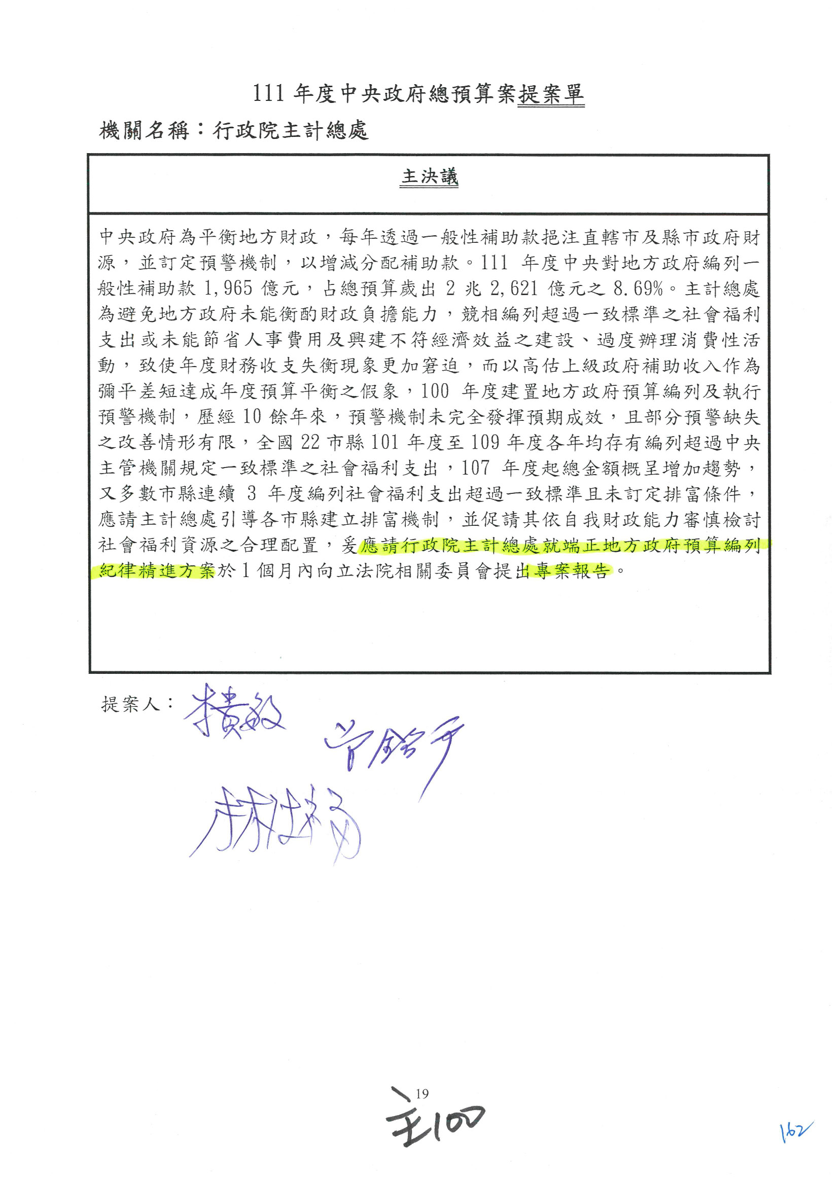 主席:111年度關於主計總處、審計部及所屬單位預算案之審查結果:審查111年度中央政府總預算案有關主計總處暨審計部、審計部臺北市審計處、審計部新北市審計處、審計部桃園市審計處、審計部臺中市審計處、審計部臺南市審計處、審計部高雄市審計處預算案,除照協商結論外,其餘部分均照列。有關政事別歲出預算隨同以上機關別審查結果調整。其中改主決議的部分,我們再確認一下。