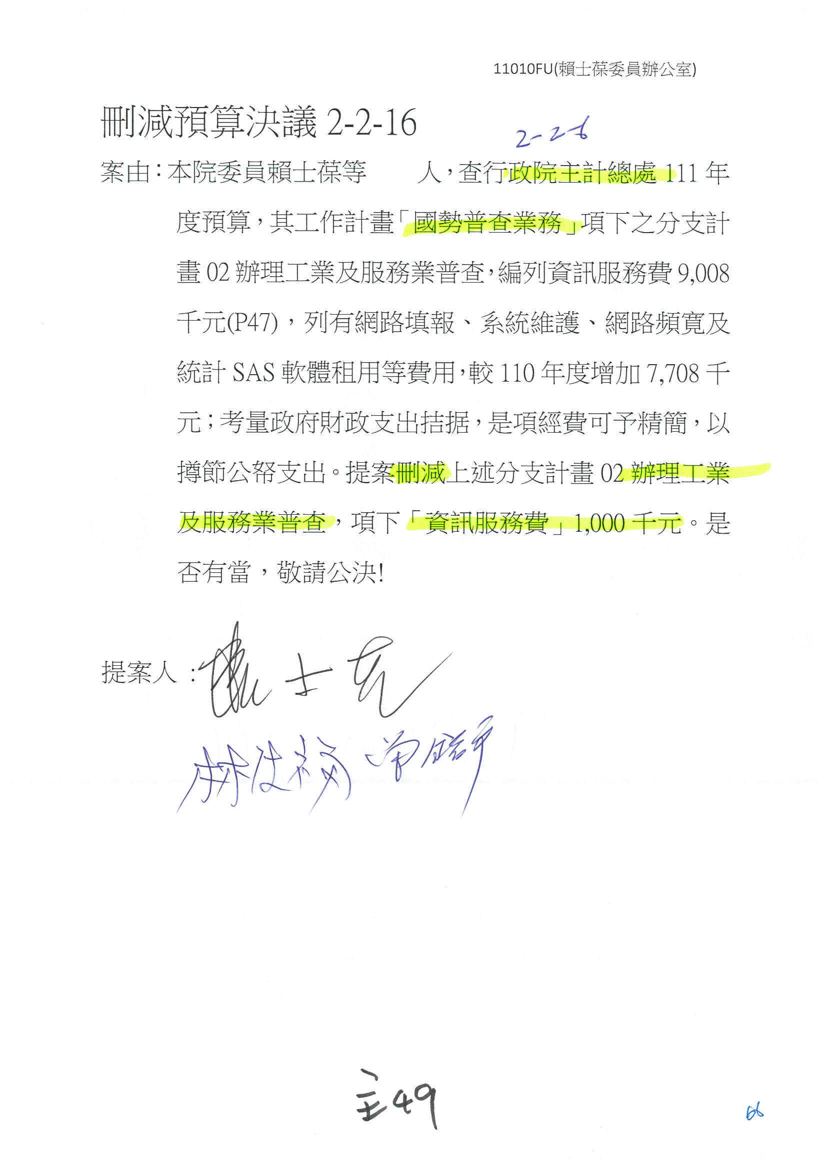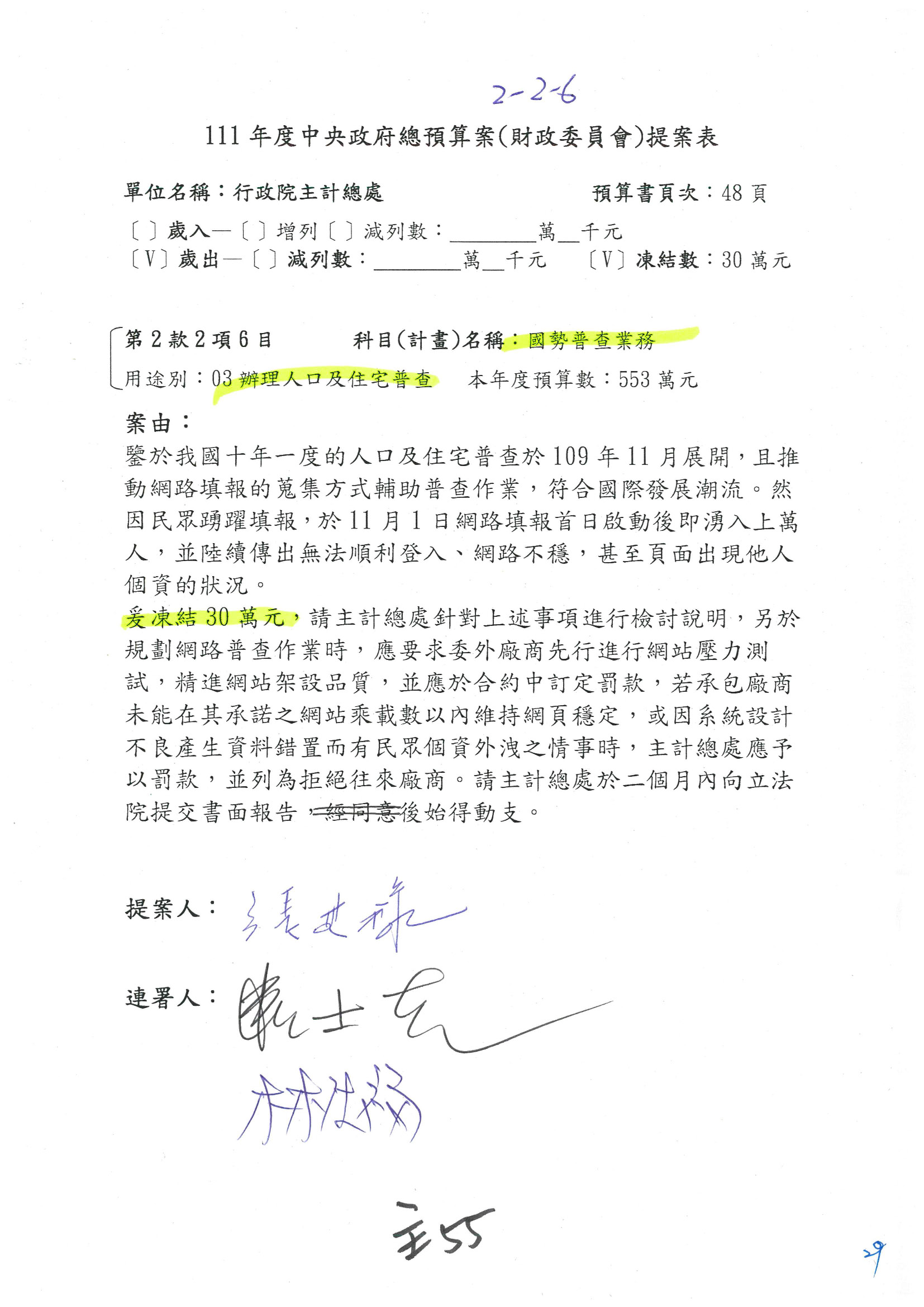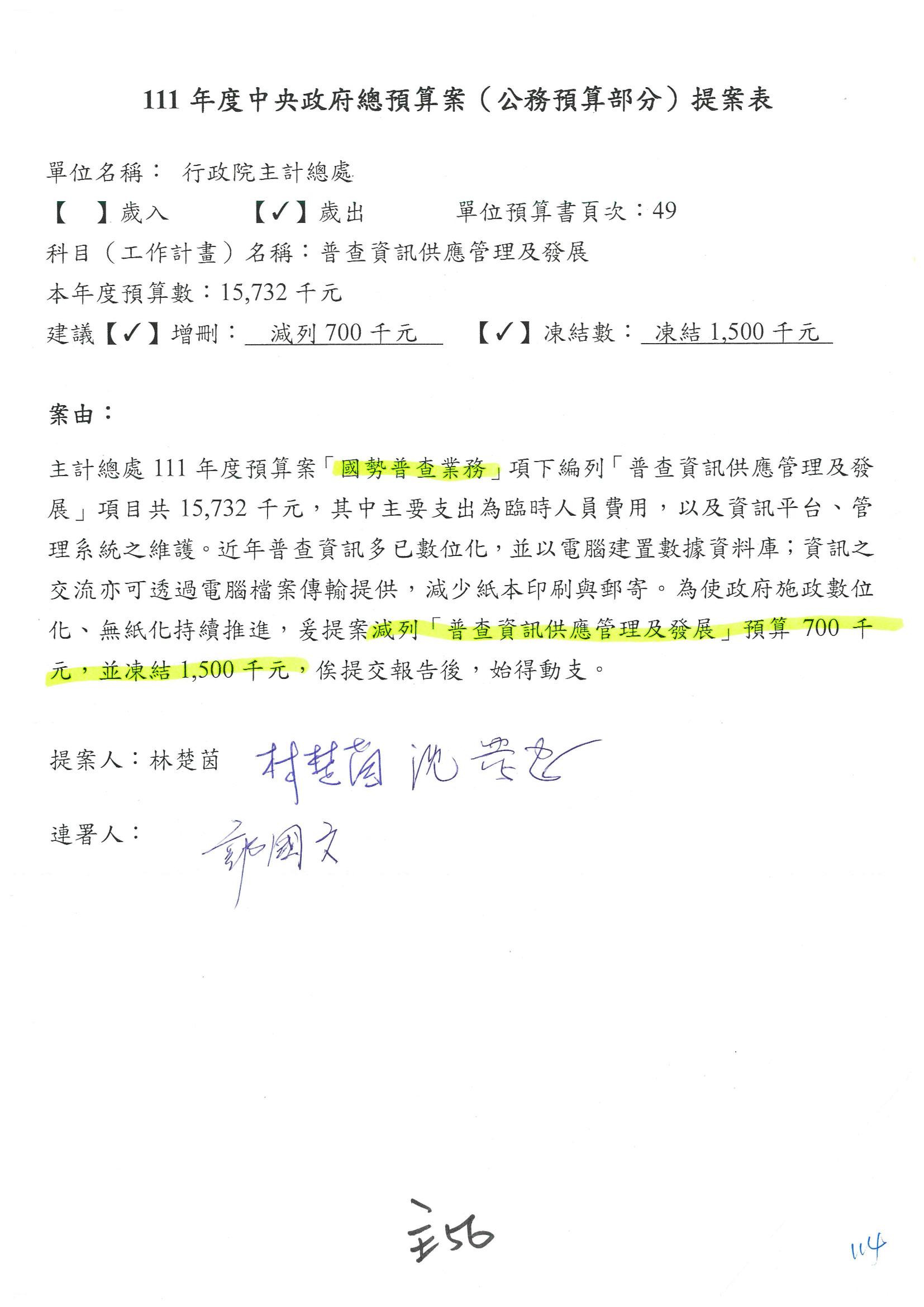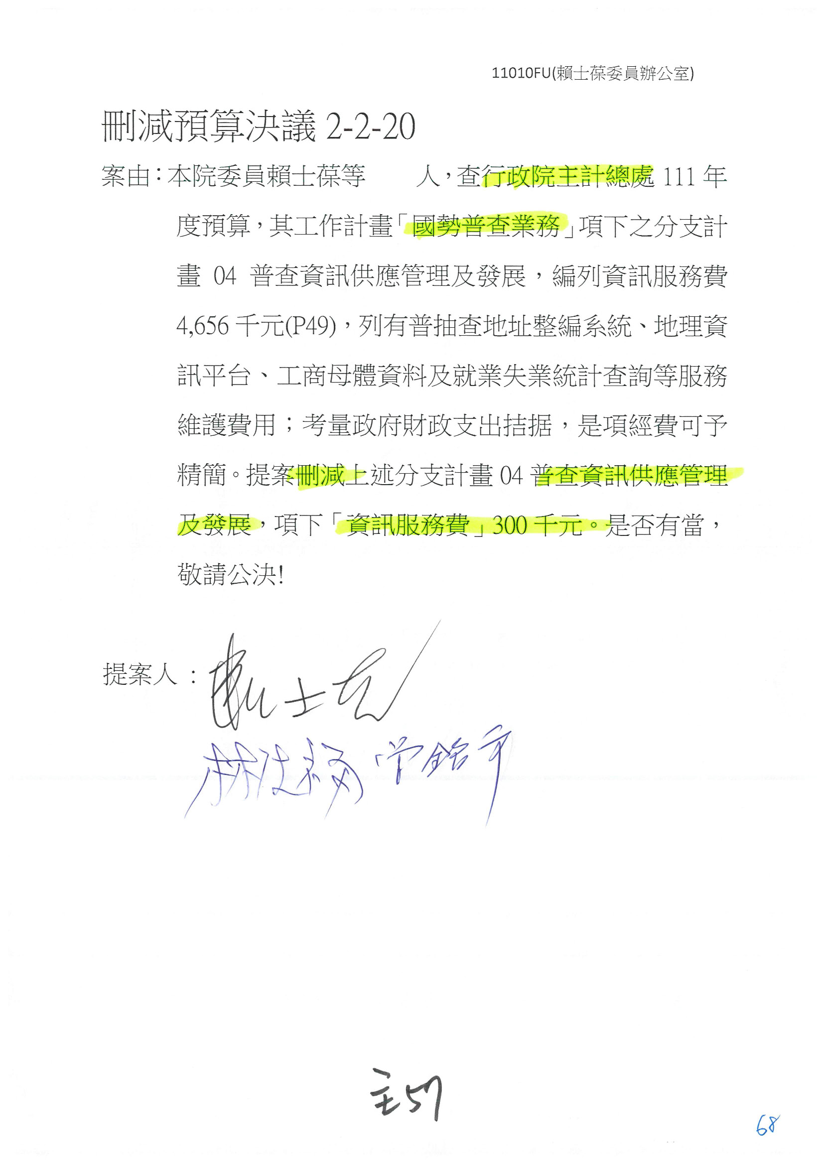 主席:賴士葆委員,第45案是資訊服務費,科目自行調整,在國勢普查業務項下。