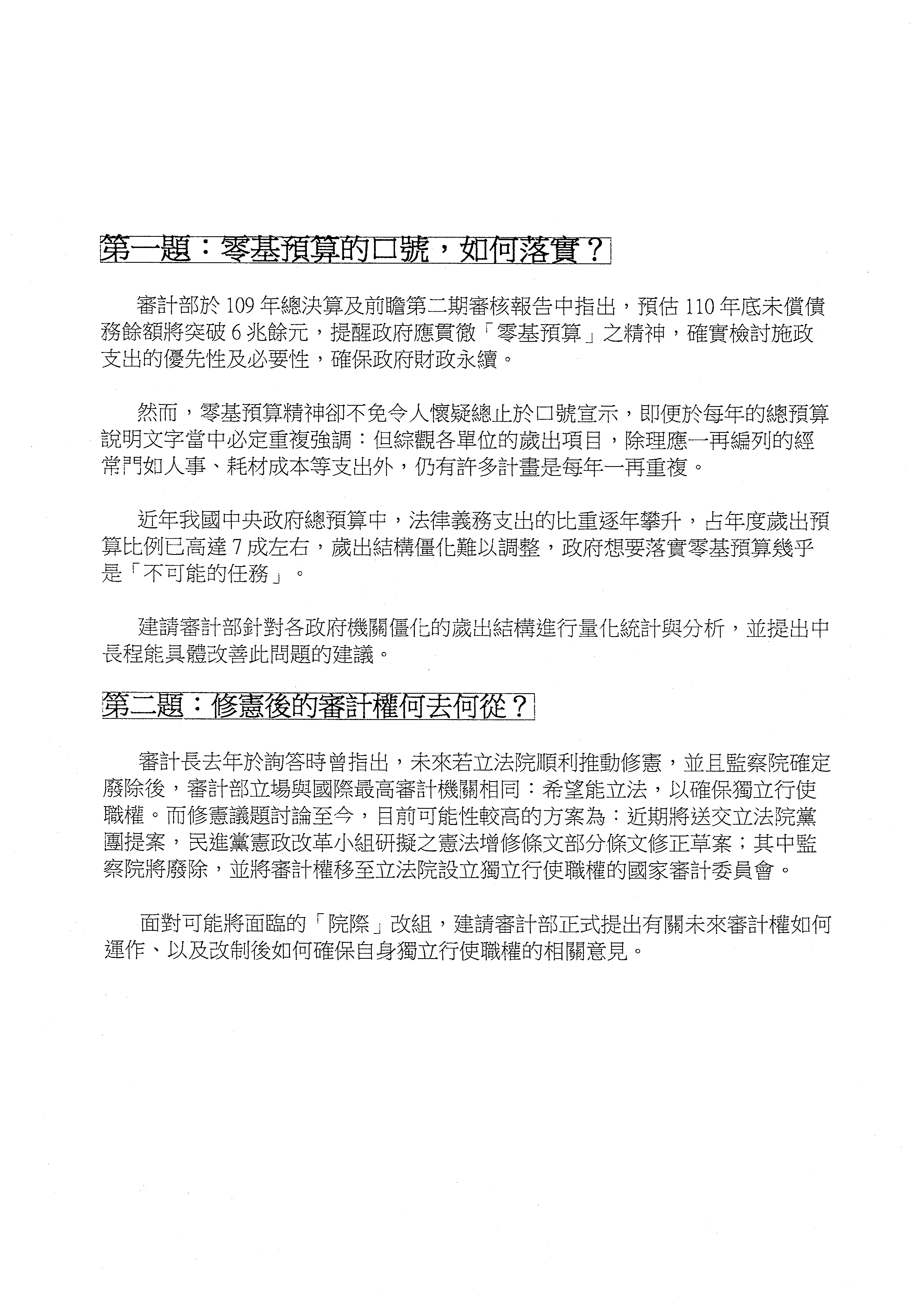 李副審計長順保:報告委員,倒數第三行的文字「從中央政府總決算案審核報告開始」建議改成「從稅計、會計、資訊系統開始試辦」,這個目前我們已經著手在推動,但從這個系統來處理的話會比較好一點。對不起,我再做文字修正,是「稅計、會計、資訊審核系統」。