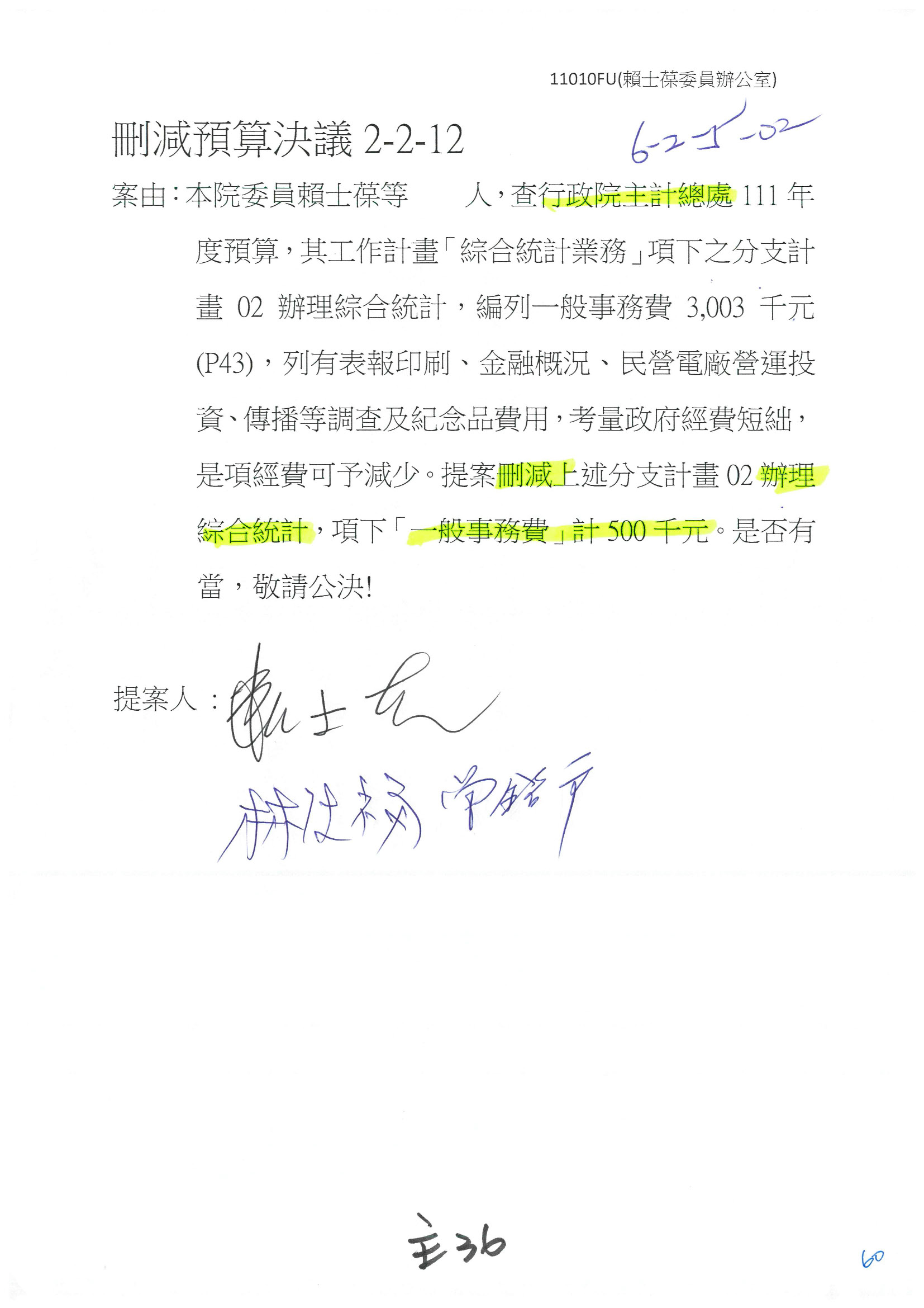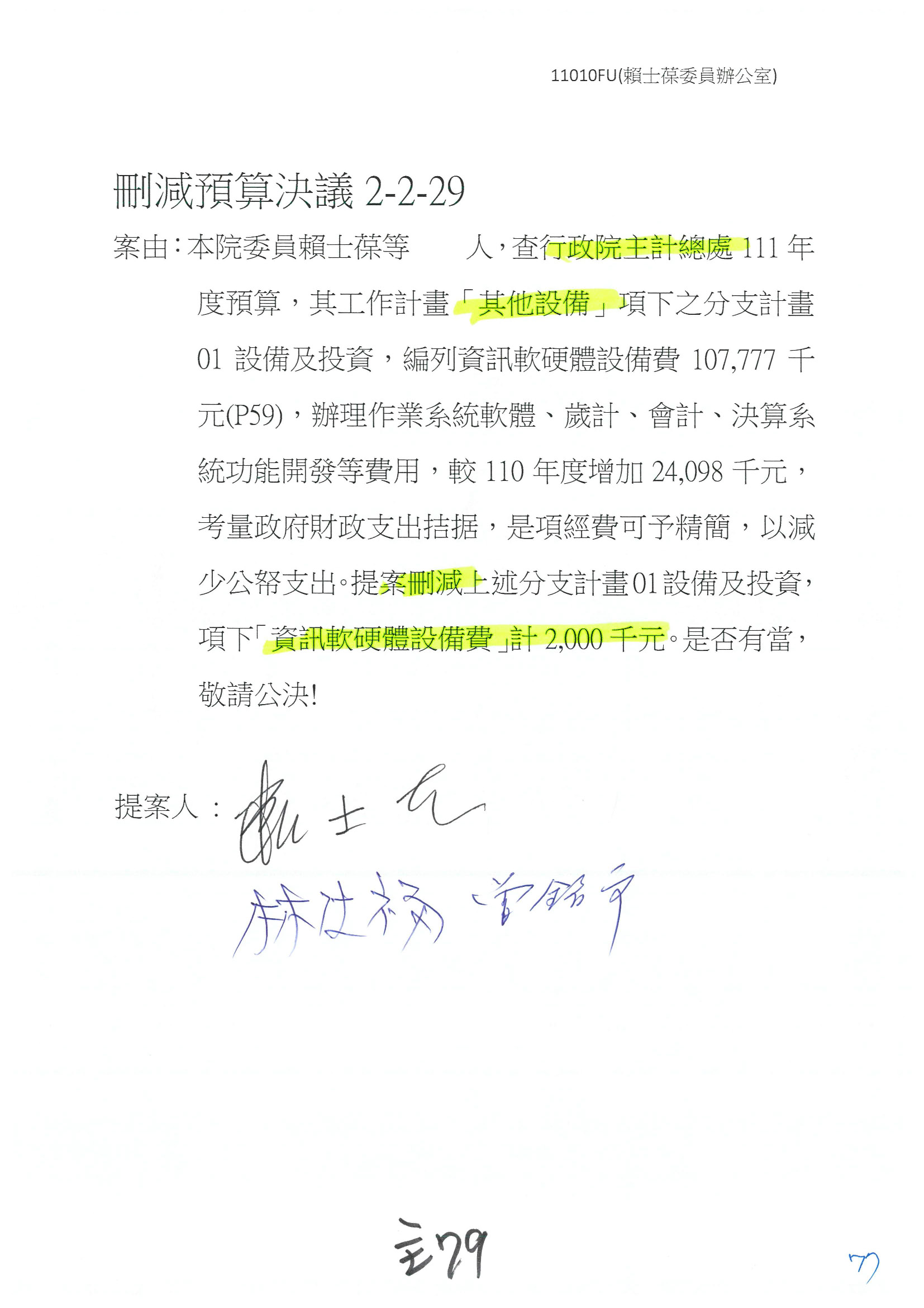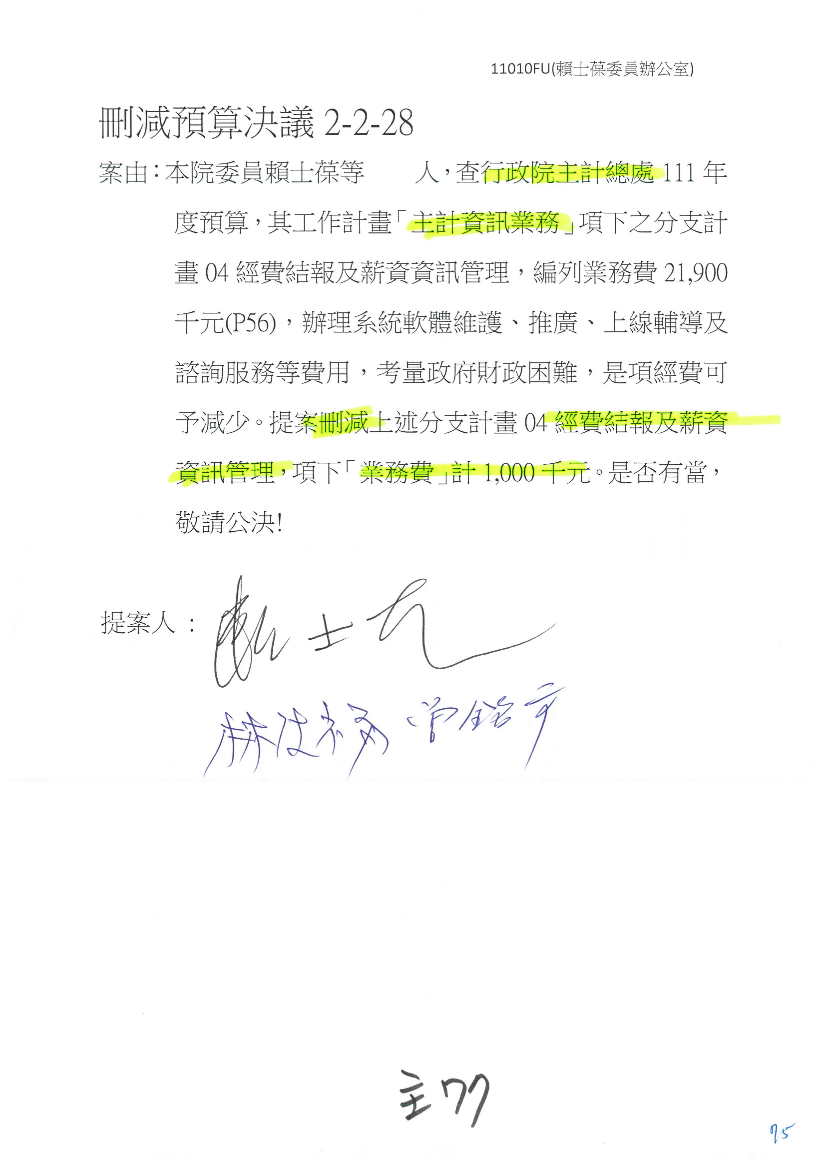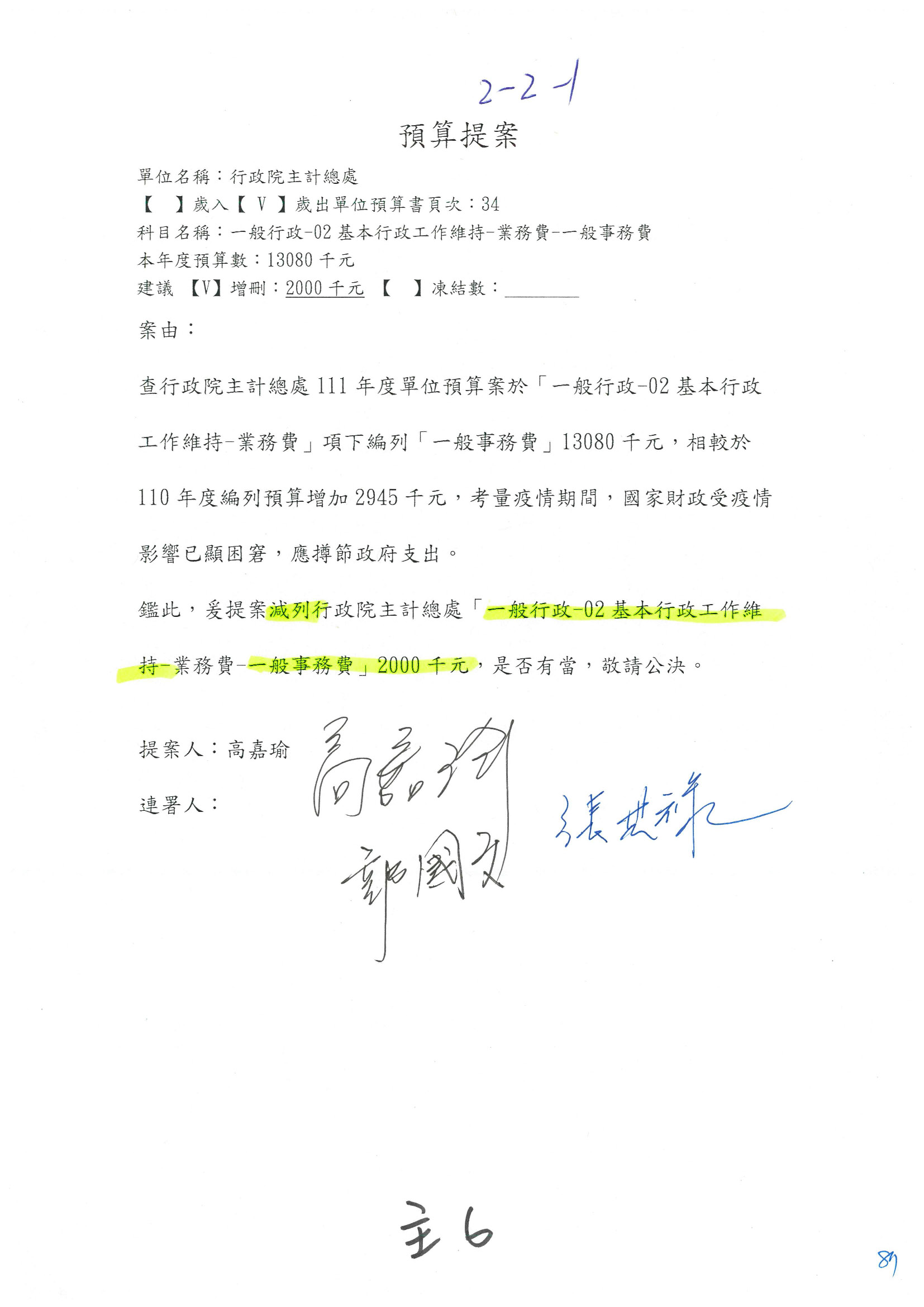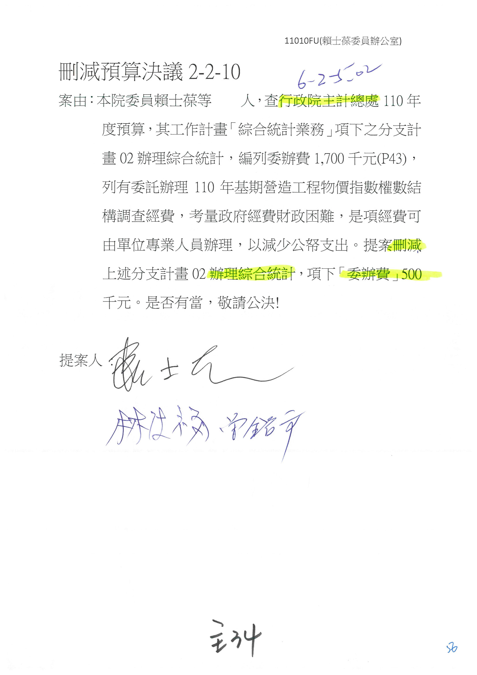 協商結論:主計總處預算提案:第1案改為主決議;第2案、第3案通案處理;第4案至第9案合併,刪減70萬元,科目自行調整;第10案改為凍結二分之一,提書面報告;第11案撤案;第12案改為主決議;第13案撤案;第14案、第15案通案處理;第16案、第17案、第18案合併處理,凍十分之一,提書面,以第17案為主;第19案、第20案、第91案合併處理,改為主決議,以第91案為主;第21案至第24案通案處理;第25案、第26案撤案;第27案至第31案通案處理;第32案照案通過;第33案至第44案合併處理,刪減50萬元,科目自行調整;第45案照案通過;第46案至第54案合併處理,刪減400萬元,科目自行調整;第55案改為主決議,提書面報告;第56案、第57案合併處理,刪減30萬元,科目自行調整,提書面;第58案改為主決議;第59案至第61案合併處理,刪減50萬元,科目自行調整;第62案通案處理;第63案撤案;第64案刪減40萬元,科目自行調整;第65案至第71案合併處理,刪減150萬元,科目自行調整;第72案至第77案合併處理,刪減200萬元,科目自行調整;第78案刪減100萬元;第79案至第82案合併處理,刪減100萬元;第83案修正通過;第84案修正通過;第85案、第86案、第87案、第88案均修正通過;第89案通過,並將第65案至第71案提案委員加入;第90案照案通過;第92案照案通過;第93案修正提書面;第94案修正提書面;第95案修正提書面;第96案修正提書面;第97案修正提書面;第98案修正通過;第99案修正通過;第100案提書面;第101案提書面;第102案照案通過;第103案改為「兩個月」,提書面;第104案修正通過;第105案照案通過。