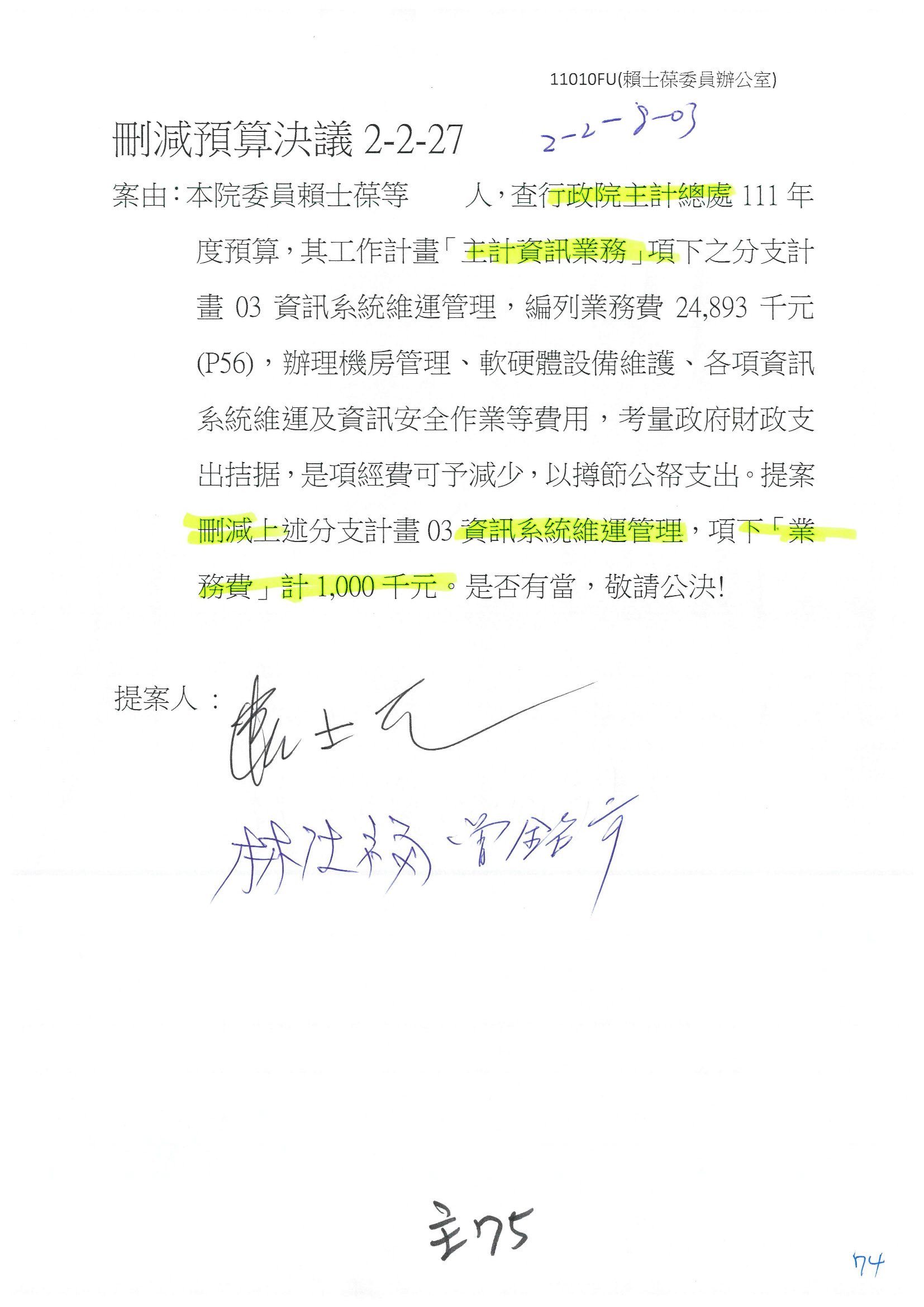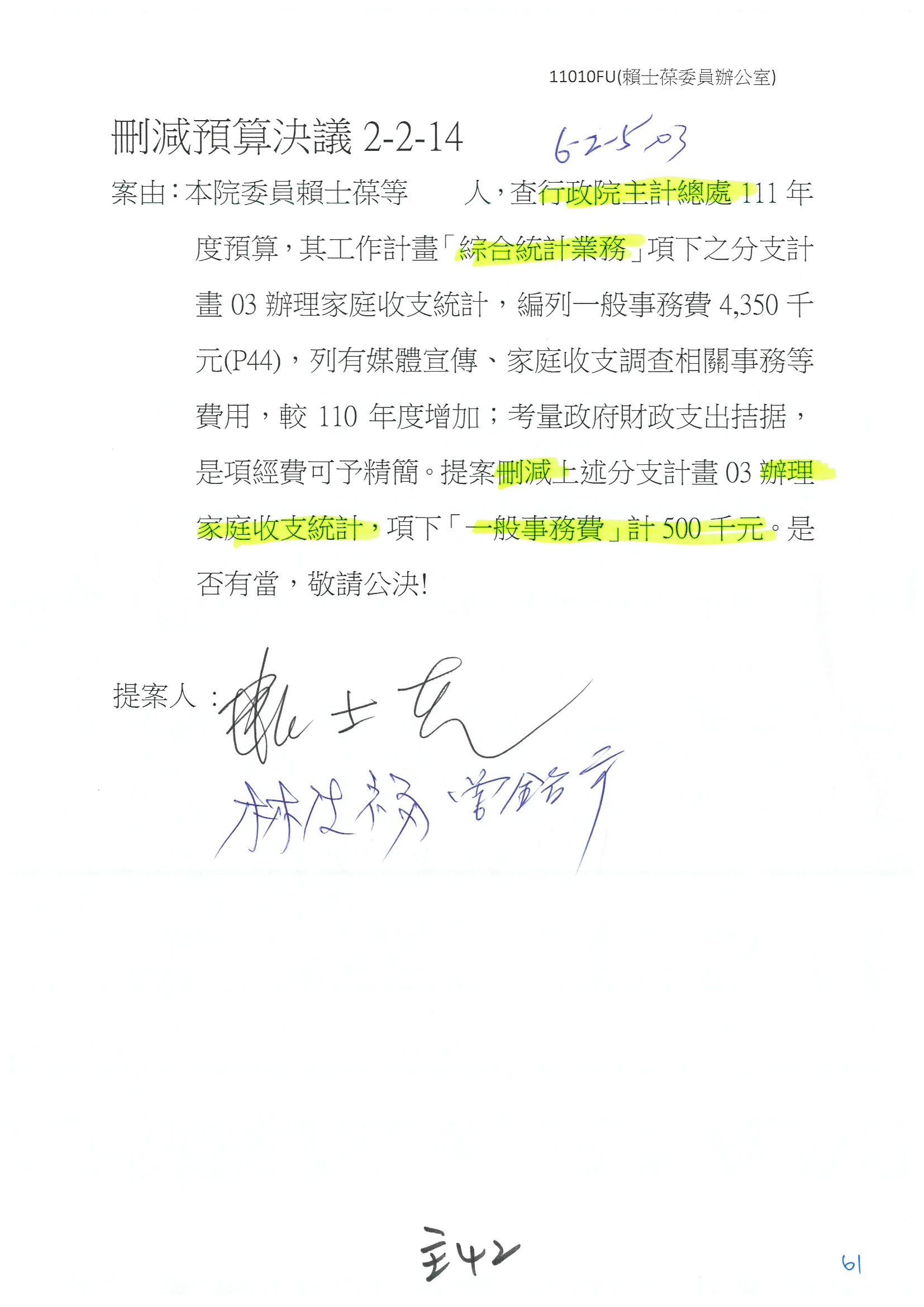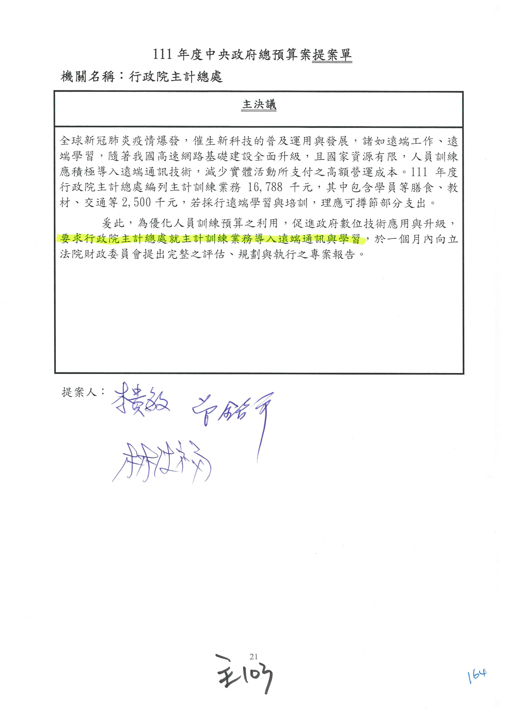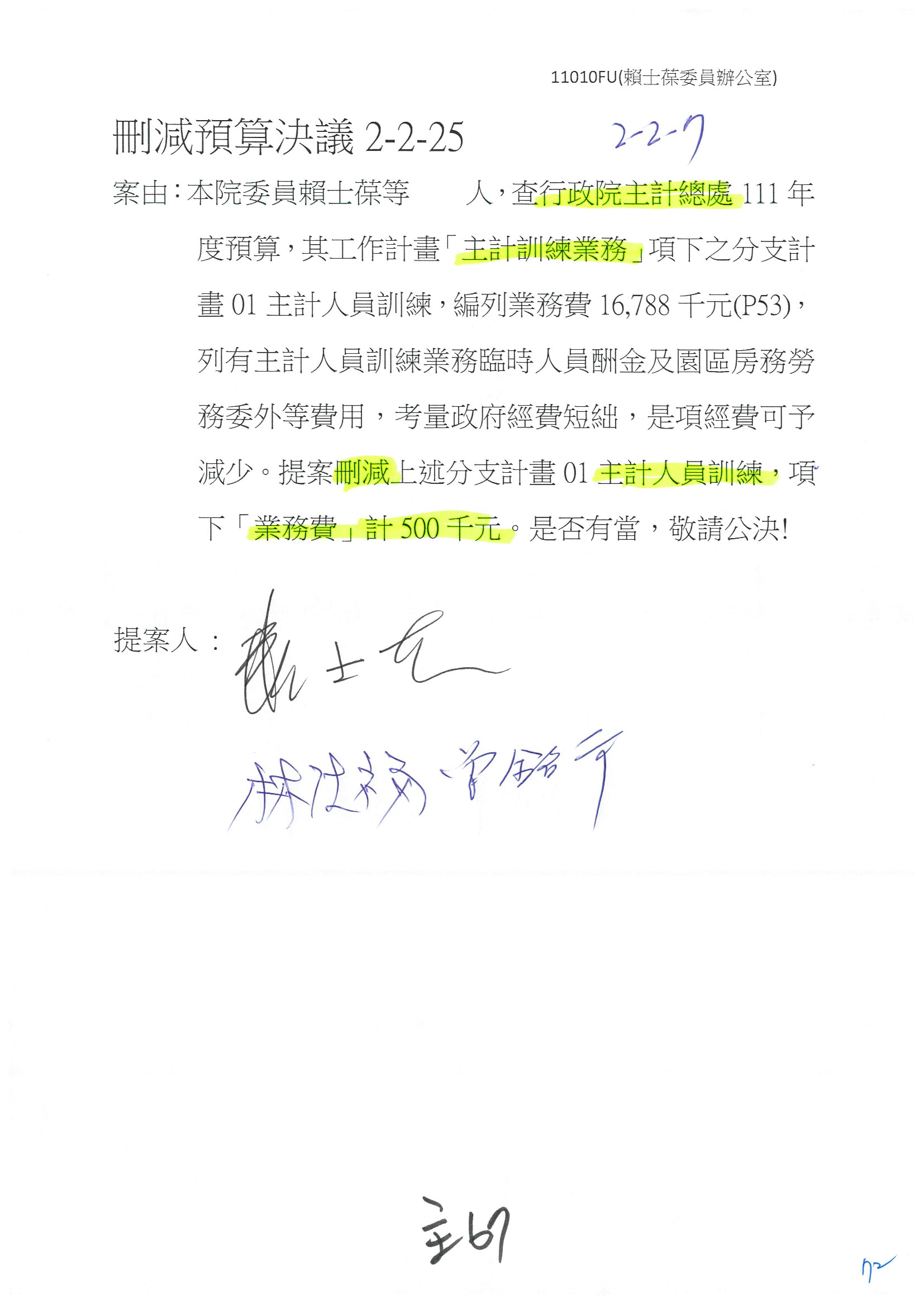 協商結論:主計總處預算提案:第1案改為主決議;第2案、第3案通案處理;第4案至第9案合併,刪減70萬元,科目自行調整;第10案改為凍結二分之一,提書面報告;第11案撤案;第12案改為主決議;第13案撤案;第14案、第15案通案處理;第16案、第17案、第18案合併處理,凍十分之一,提書面,以第17案為主;第19案、第20案、第91案合併處理,改為主決議,以第91案為主;第21案至第24案通案處理;第25案、第26案撤案;第27案至第31案通案處理;第32案照案通過;第33案至第44案合併處理,刪減50萬元,科目自行調整;第45案照案通過;第46案至第54案合併處理,刪減400萬元,科目自行調整;第55案改為主決議,提書面報告;第56案、第57案合併處理,刪減30萬元,科目自行調整,提書面;第58案改為主決議;第59案至第61案合併處理,刪減50萬元,科目自行調整;第62案通案處理;第63案撤案;第64案刪減40萬元,科目自行調整;第65案至第71案合併處理,刪減150萬元,科目自行調整;第72案至第77案合併處理,刪減200萬元,科目自行調整;第78案刪減100萬元;第79案至第82案合併處理,刪減100萬元;第83案修正通過;第84案修正通過;第85案、第86案、第87案、第88案均修正通過;第89案通過,並將第65案至第71案提案委員加入;第90案照案通過;第92案照案通過;第93案修正提書面;第94案修正提書面;第95案修正提書面;第96案修正提書面;第97案修正提書面;第98案修正通過;第99案修正通過;第100案提書面;第101案提書面;第102案照案通過;第103案改為「兩個月」,提書面;第104案修正通過;第105案照案通過。