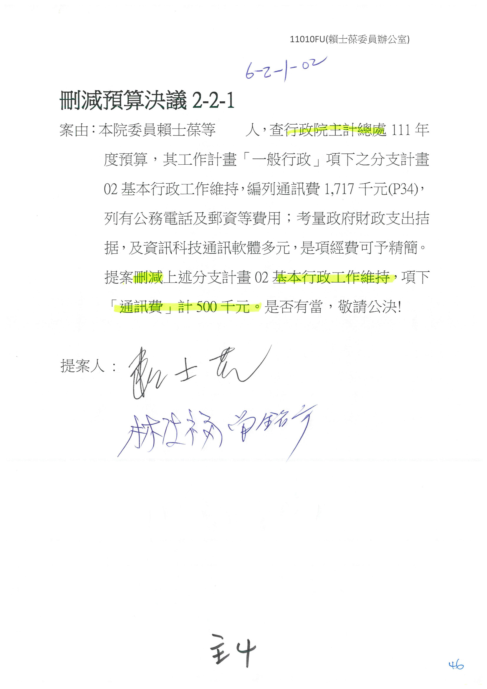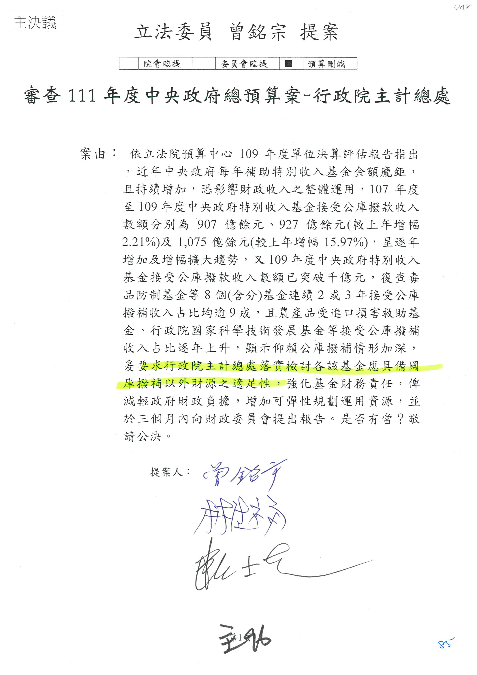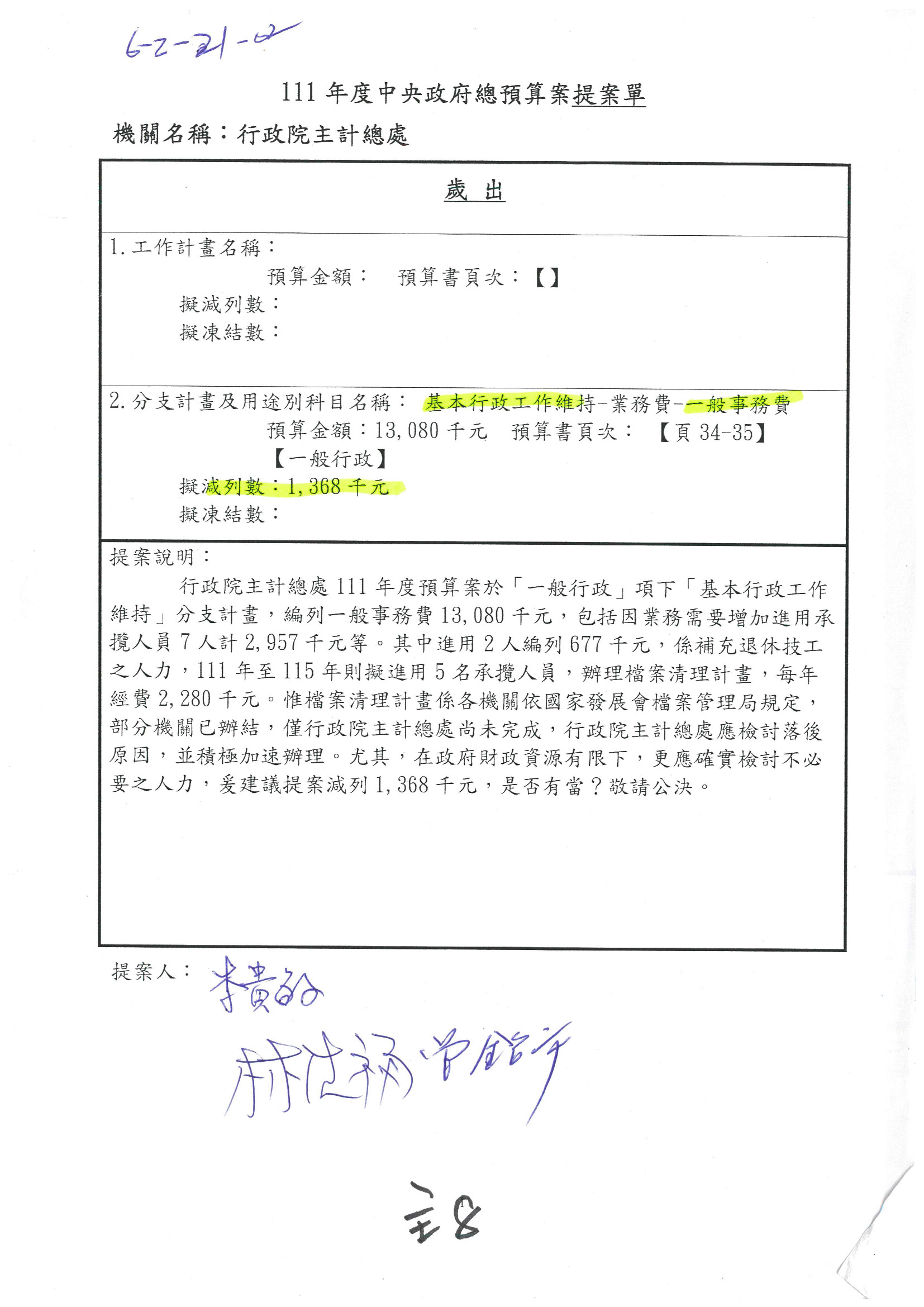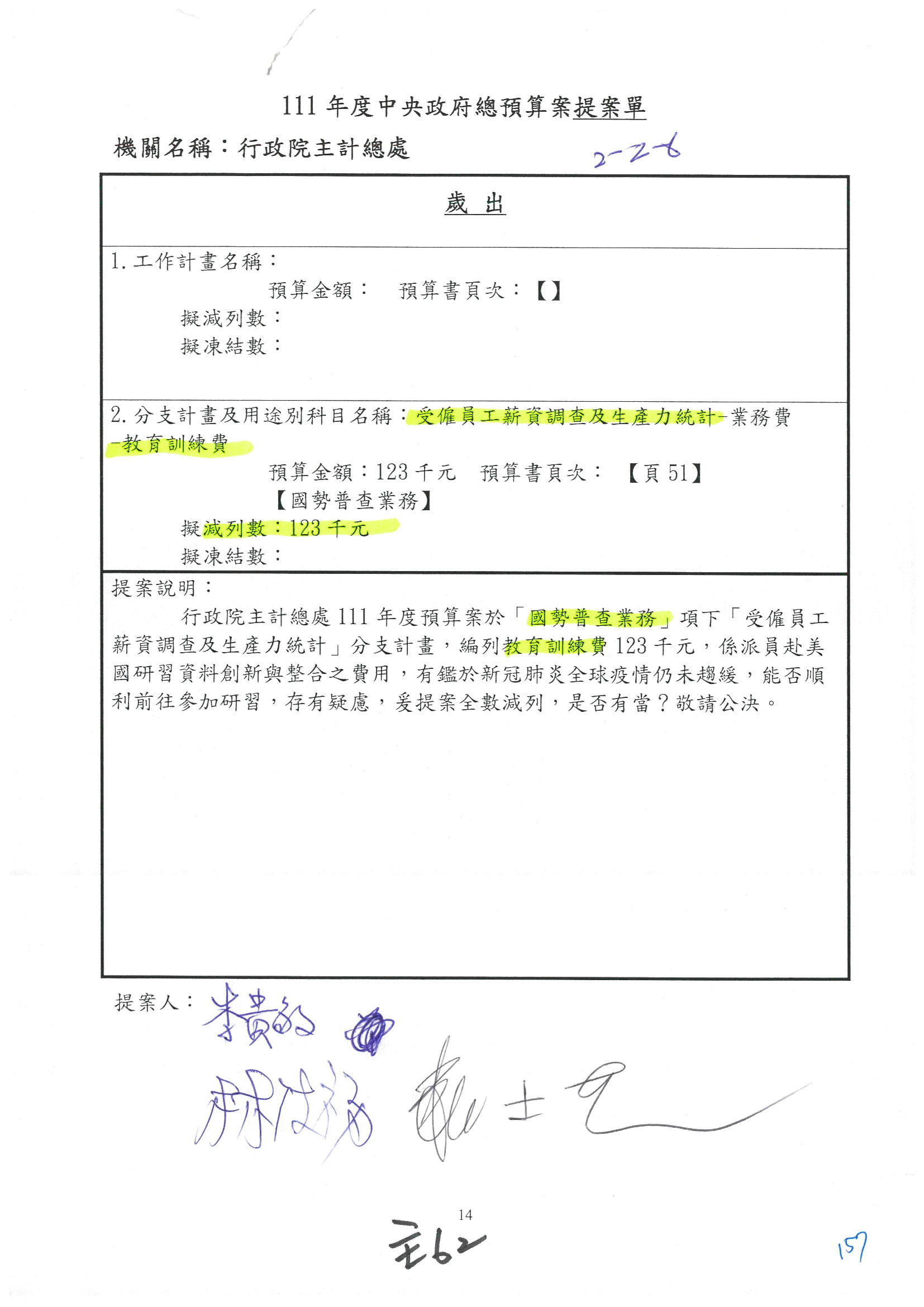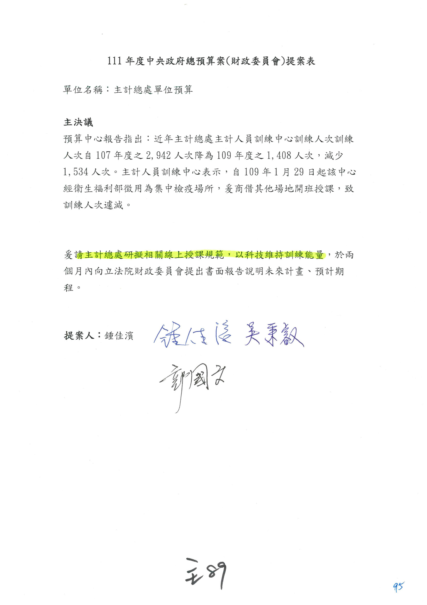 協商結論:主計總處預算提案:第1案改為主決議;第2案、第3案通案處理;第4案至第9案合併,刪減70萬元,科目自行調整;第10案改為凍結二分之一,提書面報告;第11案撤案;第12案改為主決議;第13案撤案;第14案、第15案通案處理;第16案、第17案、第18案合併處理,凍十分之一,提書面,以第17案為主;第19案、第20案、第91案合併處理,改為主決議,以第91案為主;第21案至第24案通案處理;第25案、第26案撤案;第27案至第31案通案處理;第32案照案通過;第33案至第44案合併處理,刪減50萬元,科目自行調整;第45案照案通過;第46案至第54案合併處理,刪減400萬元,科目自行調整;第55案改為主決議,提書面報告;第56案、第57案合併處理,刪減30萬元,科目自行調整,提書面;第58案改為主決議;第59案至第61案合併處理,刪減50萬元,科目自行調整;第62案通案處理;第63案撤案;第64案刪減40萬元,科目自行調整;第65案至第71案合併處理,刪減150萬元,科目自行調整;第72案至第77案合併處理,刪減200萬元,科目自行調整;第78案刪減100萬元;第79案至第82案合併處理,刪減100萬元;第83案修正通過;第84案修正通過;第85案、第86案、第87案、第88案均修正通過;第89案通過,並將第65案至第71案提案委員加入;第90案照案通過;第92案照案通過;第93案修正提書面;第94案修正提書面;第95案修正提書面;第96案修正提書面;第97案修正提書面;第98案修正通過;第99案修正通過;第100案提書面;第101案提書面;第102案照案通過;第103案改為「兩個月」,提書面;第104案修正通過;第105案照案通過。