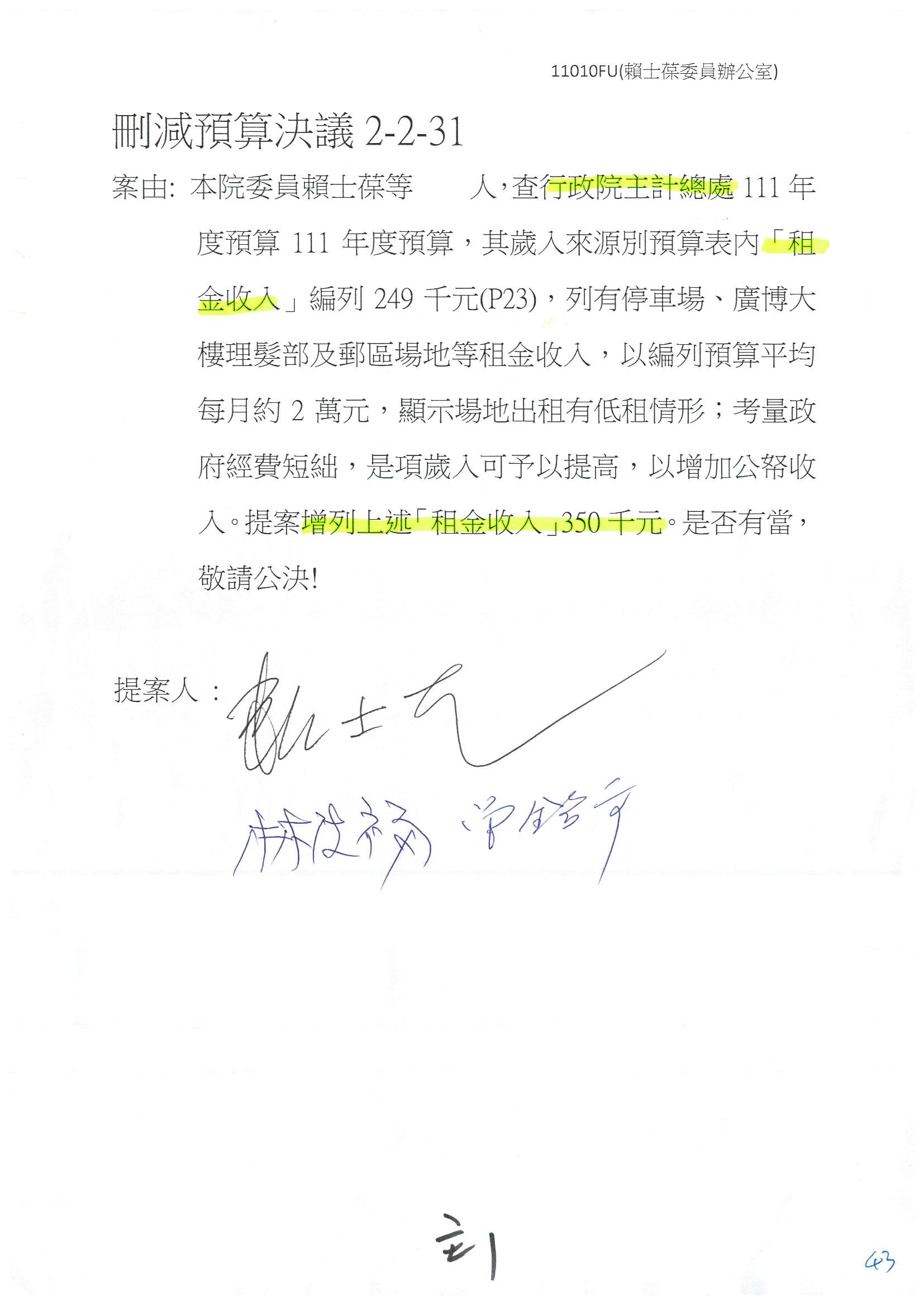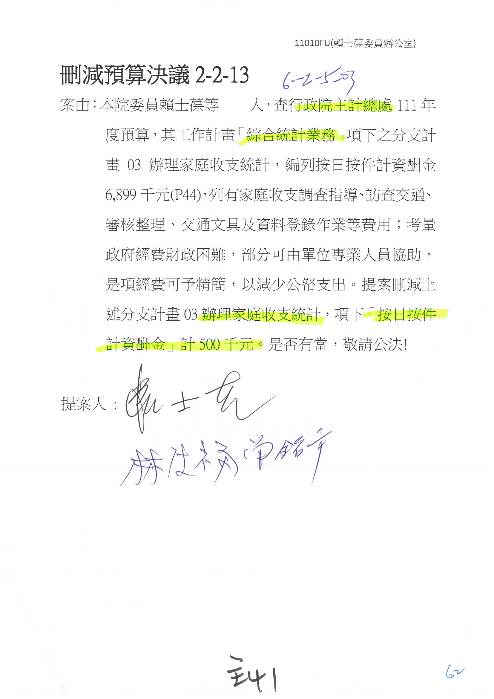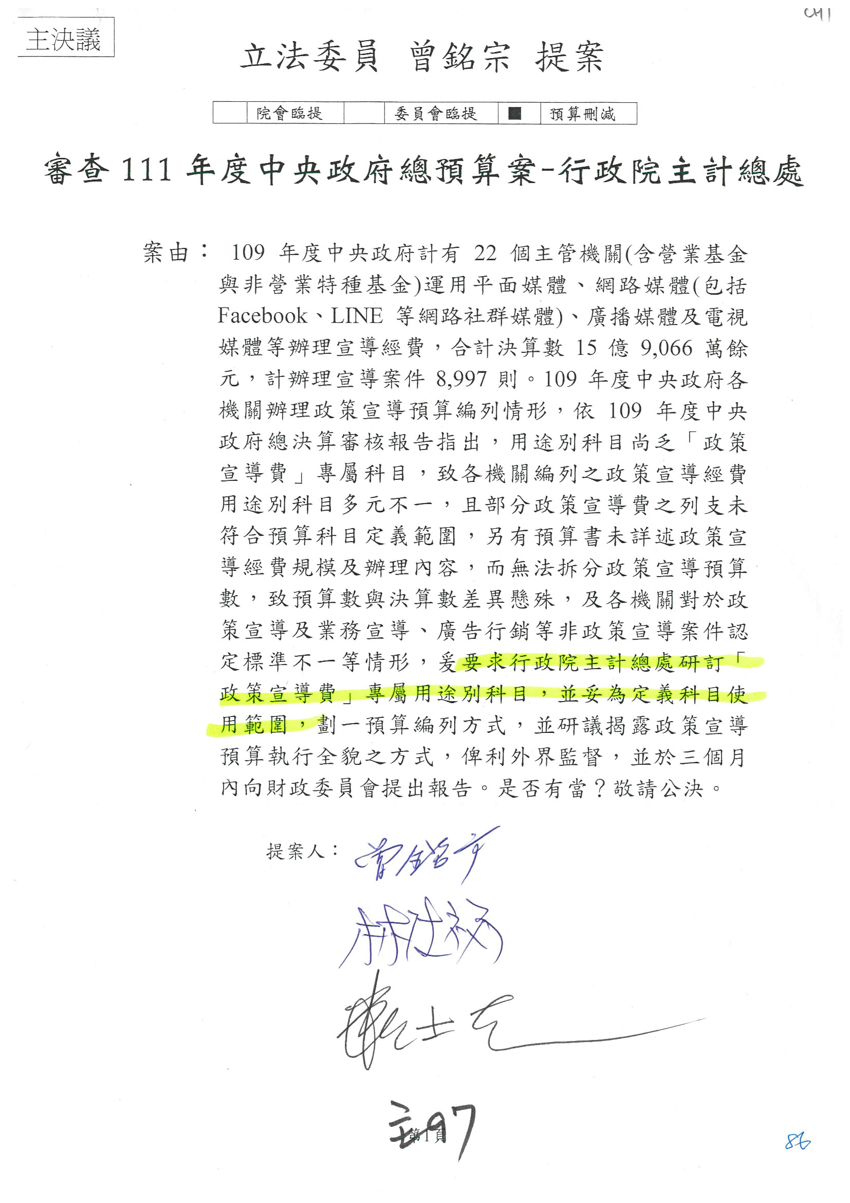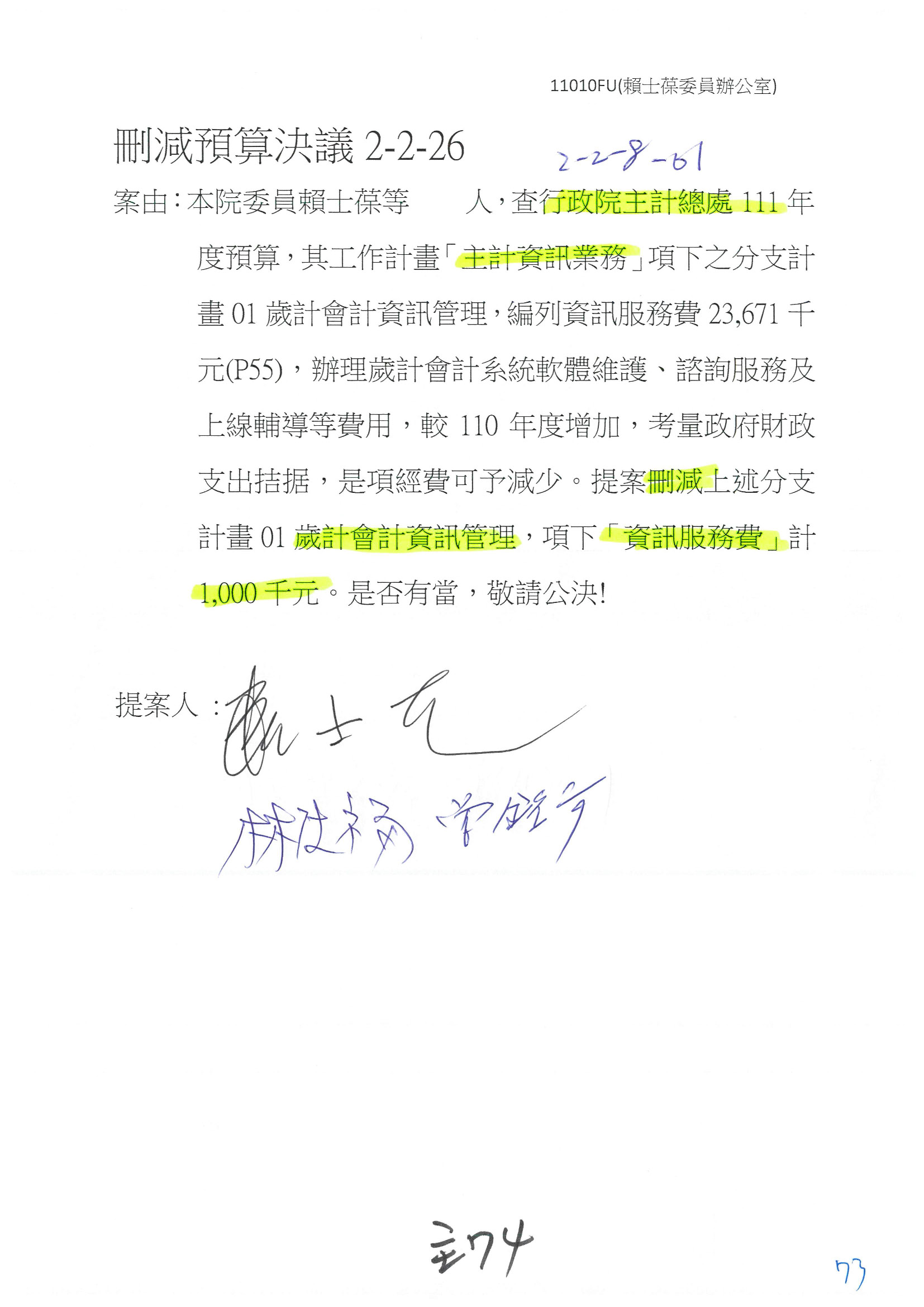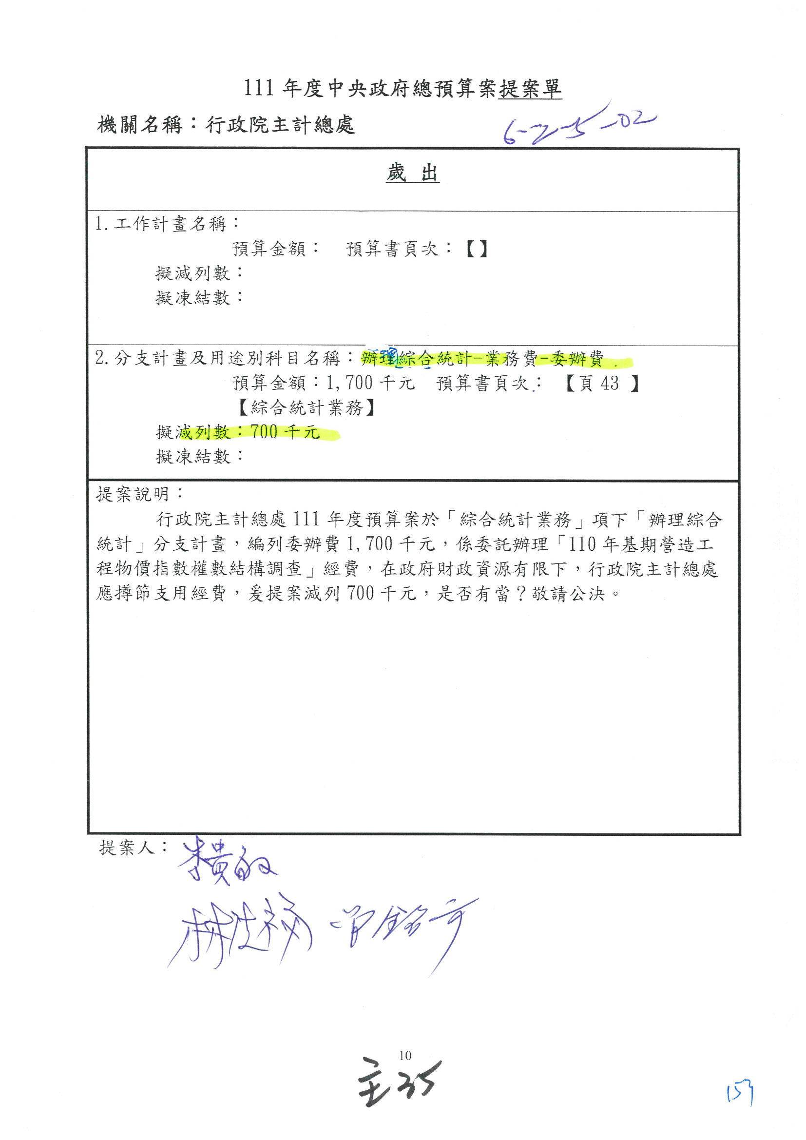 協商結論:主計總處預算提案:第1案改為主決議;第2案、第3案通案處理;第4案至第9案合併,刪減70萬元,科目自行調整;第10案改為凍結二分之一,提書面報告;第11案撤案;第12案改為主決議;第13案撤案;第14案、第15案通案處理;第16案、第17案、第18案合併處理,凍十分之一,提書面,以第17案為主;第19案、第20案、第91案合併處理,改為主決議,以第91案為主;第21案至第24案通案處理;第25案、第26案撤案;第27案至第31案通案處理;第32案照案通過;第33案至第44案合併處理,刪減50萬元,科目自行調整;第45案照案通過;第46案至第54案合併處理,刪減400萬元,科目自行調整;第55案改為主決議,提書面報告;第56案、第57案合併處理,刪減30萬元,科目自行調整,提書面;第58案改為主決議;第59案至第61案合併處理,刪減50萬元,科目自行調整;第62案通案處理;第63案撤案;第64案刪減40萬元,科目自行調整;第65案至第71案合併處理,刪減150萬元,科目自行調整;第72案至第77案合併處理,刪減200萬元,科目自行調整;第78案刪減100萬元;第79案至第82案合併處理,刪減100萬元;第83案修正通過;第84案修正通過;第85案、第86案、第87案、第88案均修正通過;第89案通過,並將第65案至第71案提案委員加入;第90案照案通過;第92案照案通過;第93案修正提書面;第94案修正提書面;第95案修正提書面;第96案修正提書面;第97案修正提書面;第98案修正通過;第99案修正通過;第100案提書面;第101案提書面;第102案照案通過;第103案改為「兩個月」,提書面;第104案修正通過;第105案照案通過。