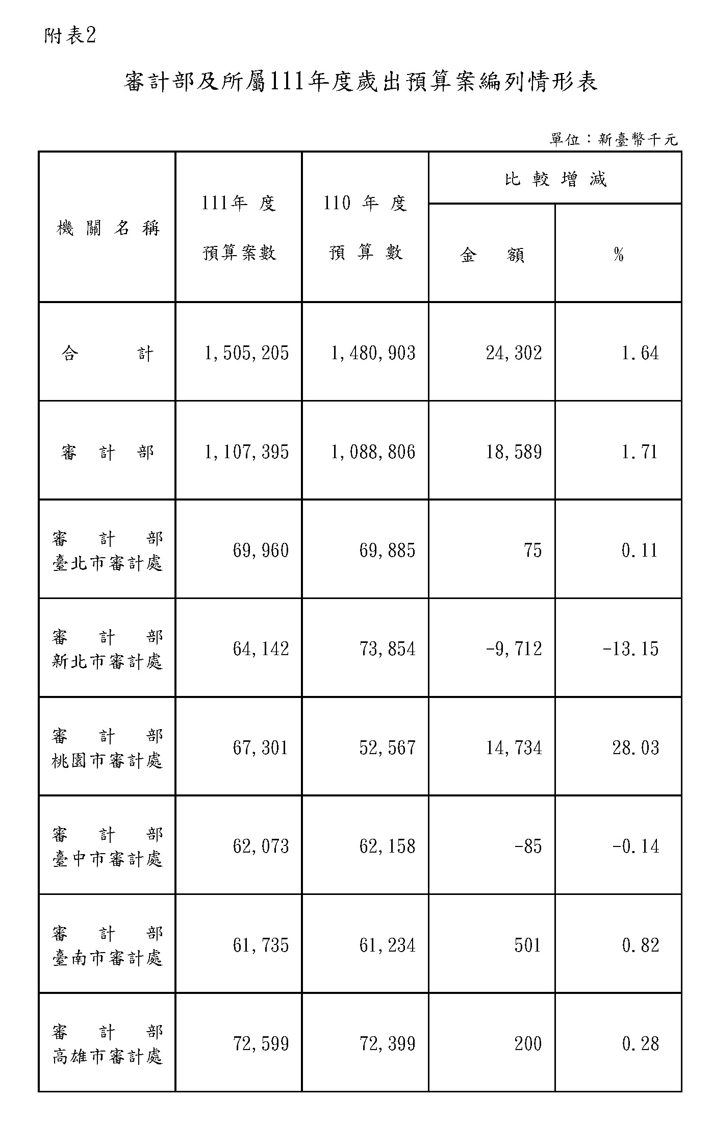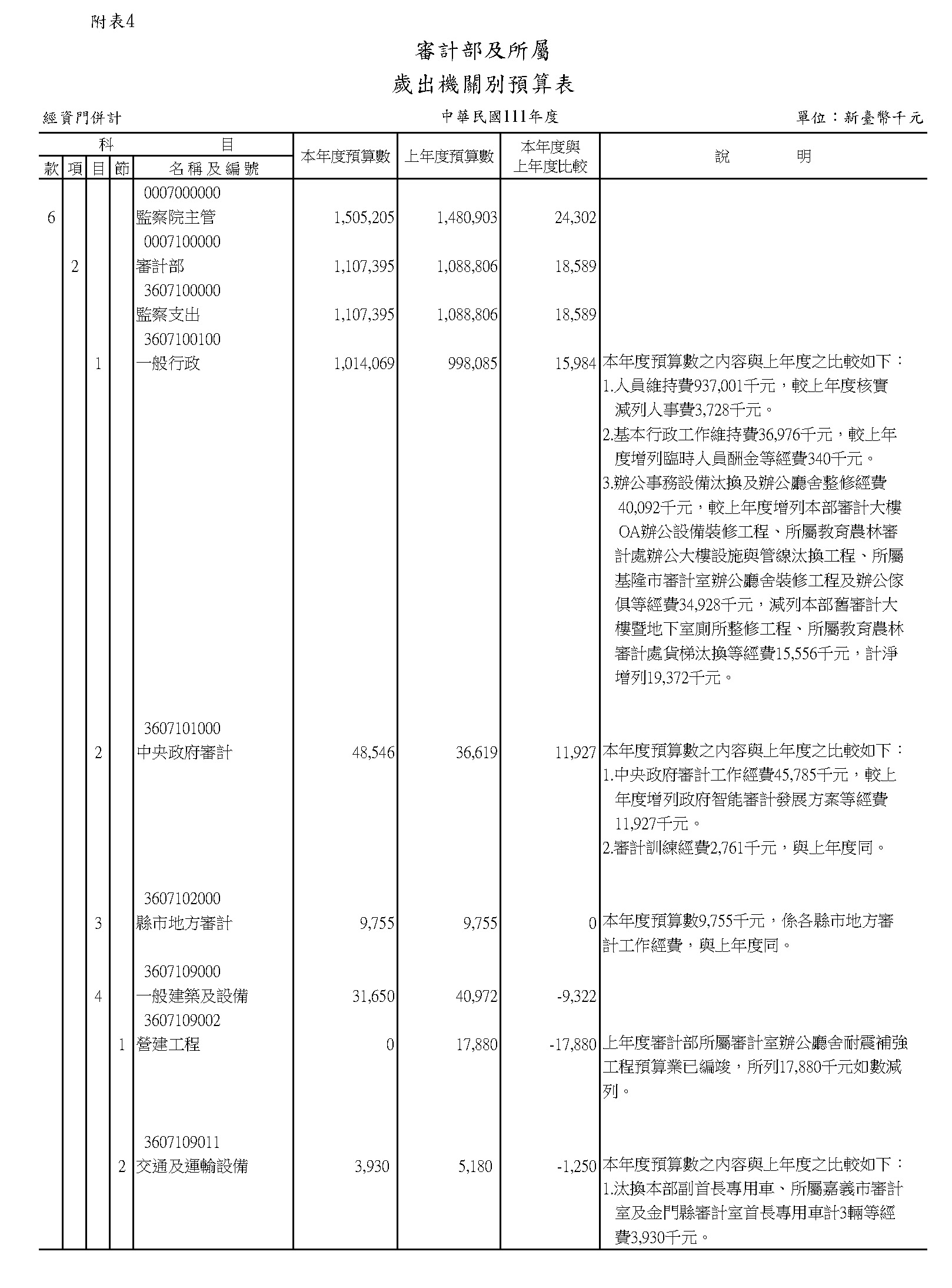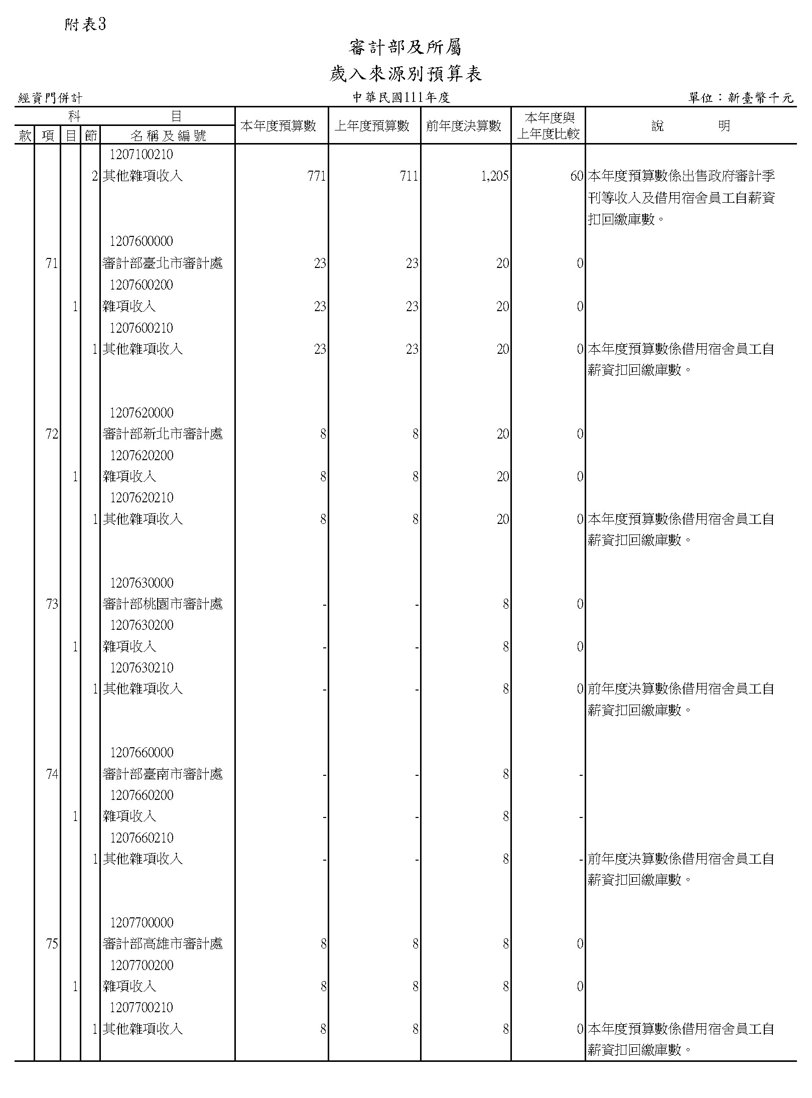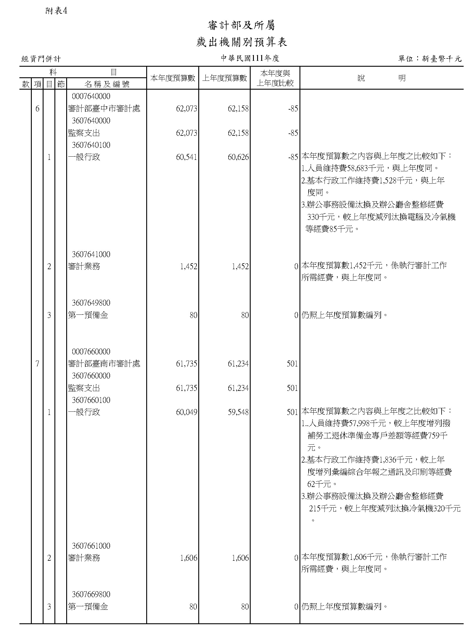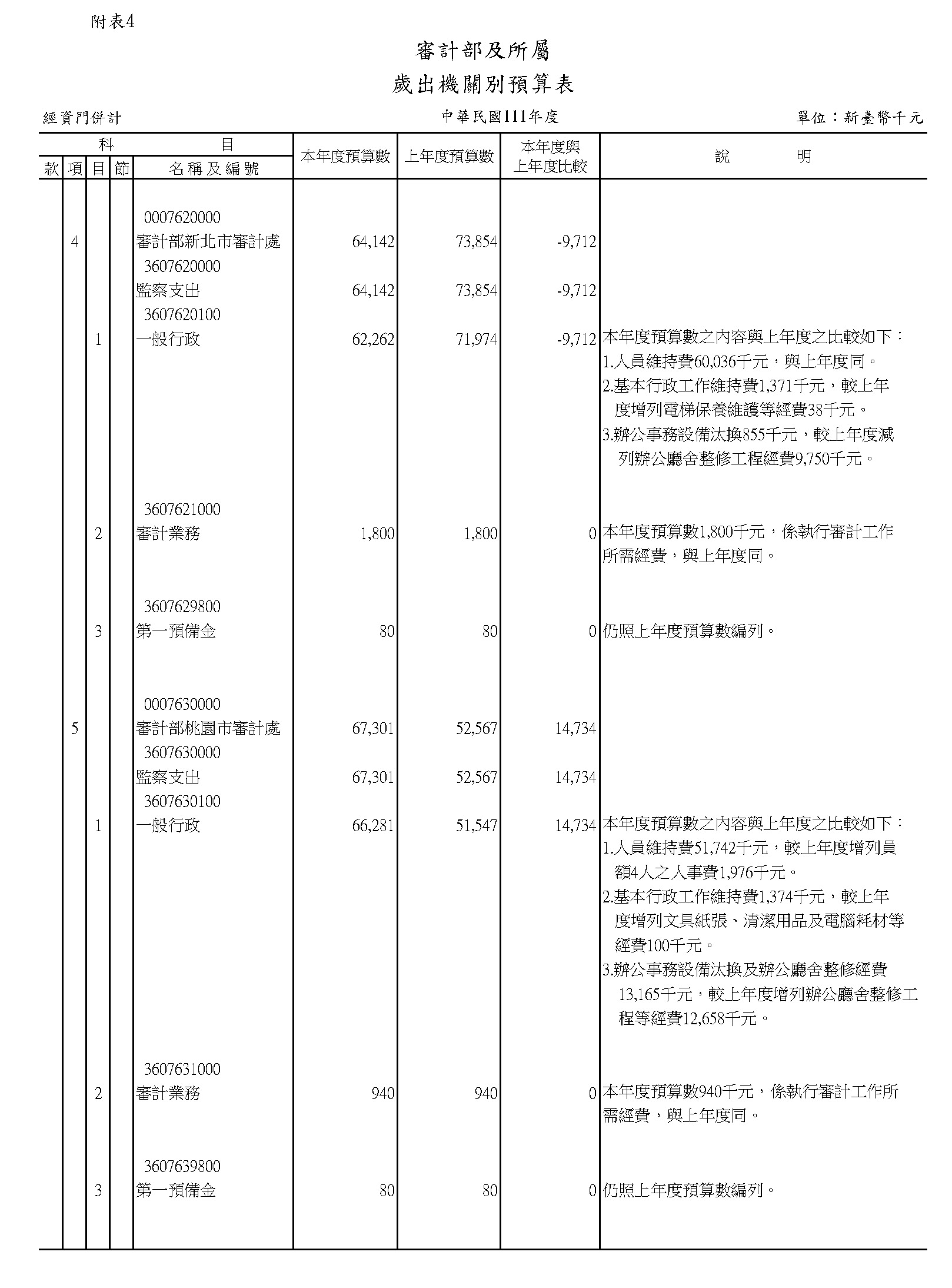 陳審計長瑞敏:這幾個單位的審計業務經費,它要審的是一個縣市政府,像臺北市政府、新北市政府、桃園市政府,它的審計業務經費才一百多萬元,刪20萬元、刪30萬元已經刪掉它……