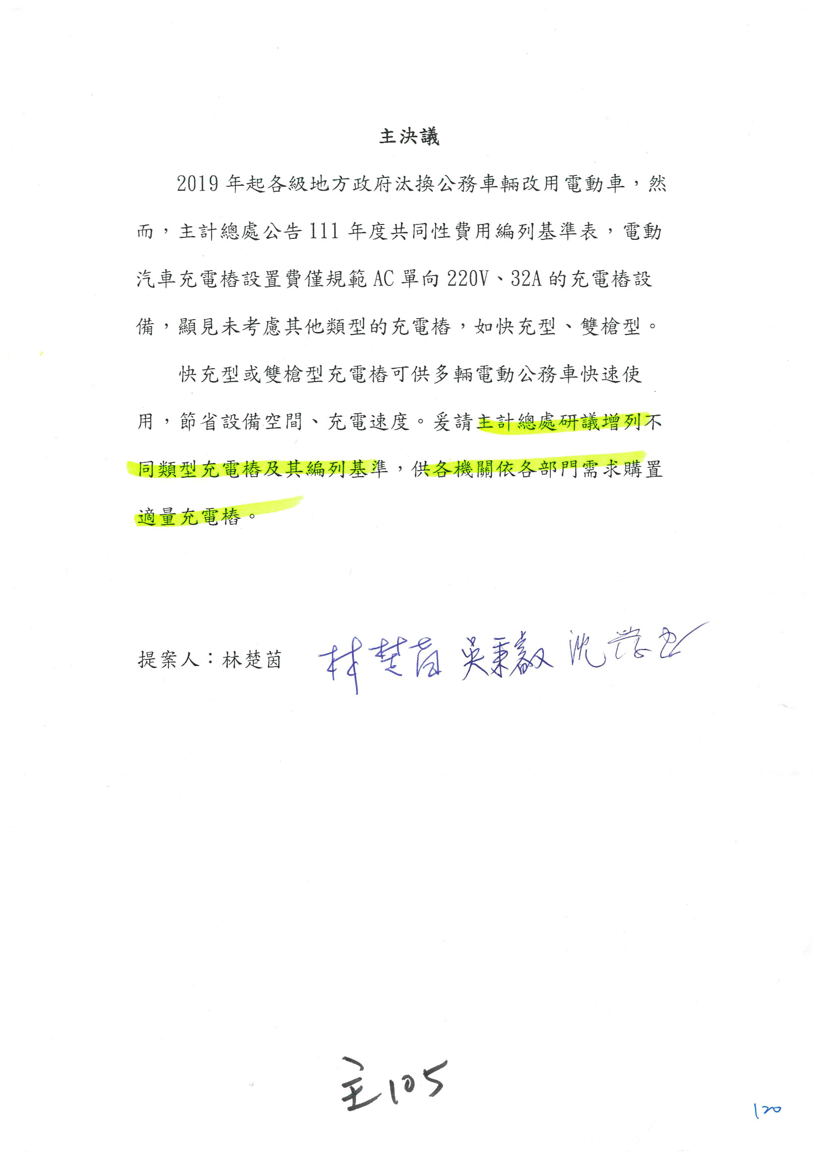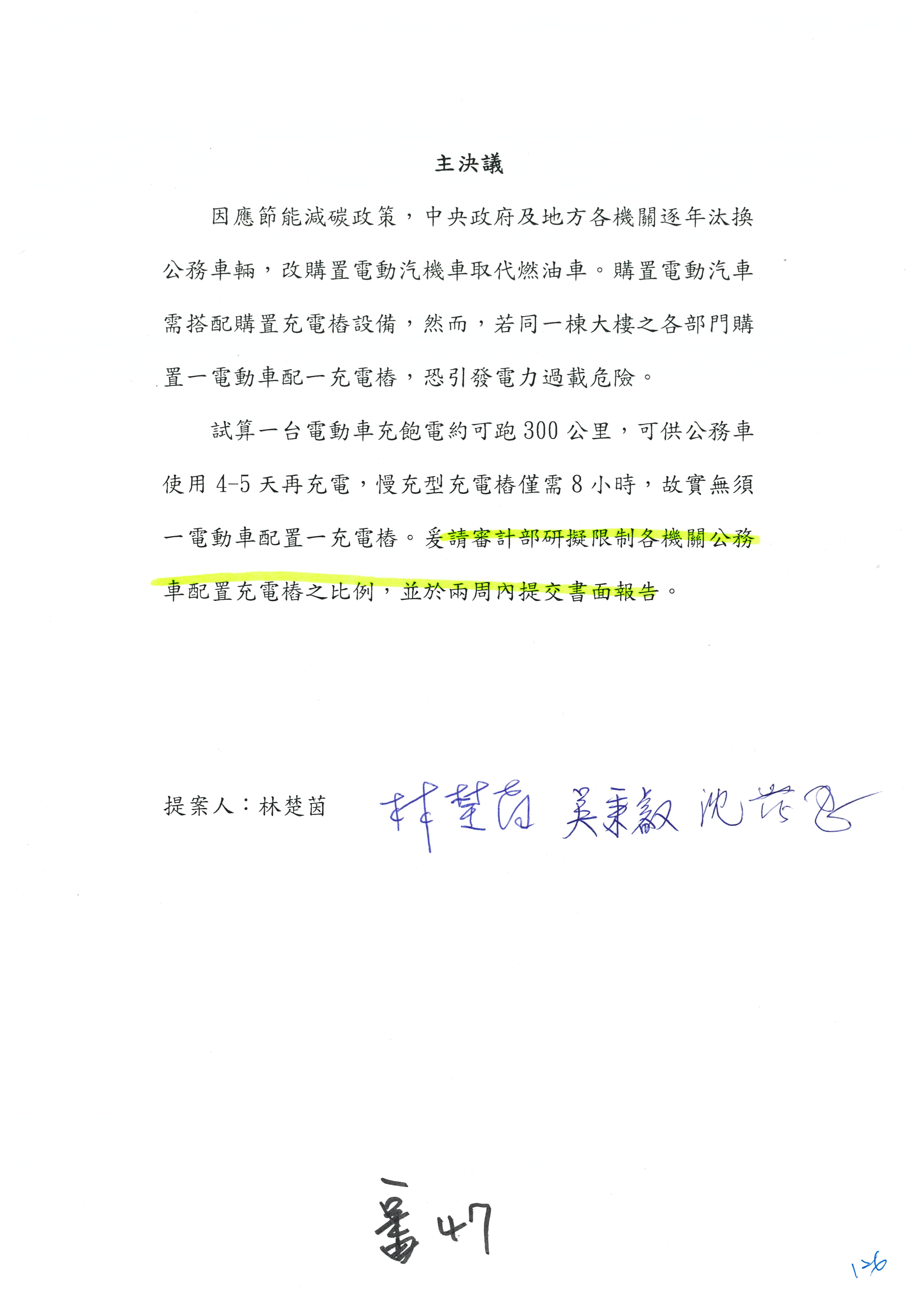 李副審計長順保:第47案倒數第二行建議文字修正為「爰請審計部促請權責機關研擬限制各機關公務車配置充電樁之比例」,然後最後那句話建議刪掉。